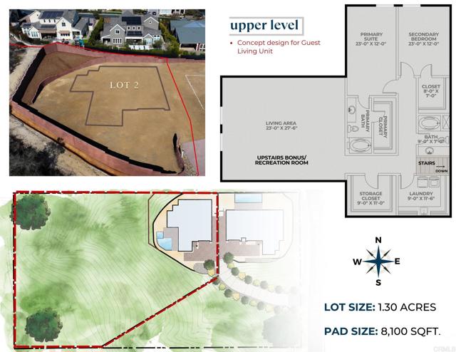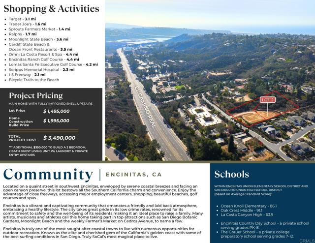 Southwest Encinitas lot fully graded and permit ready! This 1.30 acre lot is secluded above a canyon and ideally positioned to take advantage of panoramic views of dramatic vistas of rugged canyons and rolling hills. The location is perfect, just minutes from the I-5 freeway, shopping, cafes and restaurants, surfing, biking and miles of hiking trails, making this lot a superior place to call home. This fully improved lot is permit ready as MDD Homes has pre-designed (fully approved) a beautiful 5400 sq. ft. classic showpiece that allows for multi-generational living at its best with the first floor living (3146 sq. ft.) having 3 bedrooms, 2.5 bathrooms, gourmet kitchen, caf dining, family room, large walk in pantry and 2 car garage. As a bonus the permitted upper level (1824 sq. ft.) is a dream come true as you can decide too add more bedrooms and bathrooms, keep as a recreational area or within your own desired timeline build out a 1200 sq. ft. A.D.U. which is the allowed sq. footage for an A.D.U. in City of Encinitas. Top schools, Encinitas Union Elementary and San Dieguito Union High, just down the street from Encinitas Country Day and The Grauer school a private and preparatory school.Interested in this Listing?