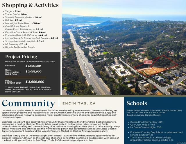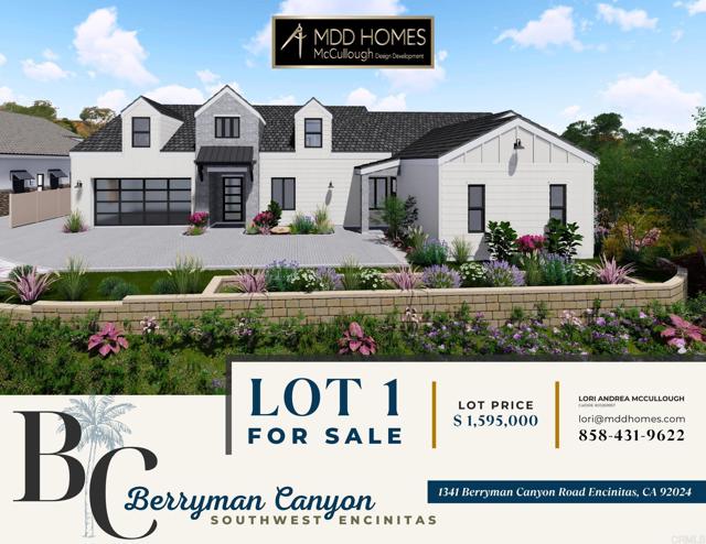 Southwest Encinitas fully graded ready to build lot! A rare find and secluded above a canyon and ideally positioned to take advantage of panoramic views of dramatic vistas of rugged canyons, rolling hills and twinkling lights. Just minutes to I-5 freeway, shopping, restaurants, employment centers and So-Cal beaches making this lot a superior place to call home. Five years in the making this fully improved lot, plans approved through the City of Encinitas as MDD Homes has pre-designed a beautiful 5598 sq. ft. classic showpiece that allows for multi-generational living at its best with first level living (3564 sq. ft.) having 4 bedrooms, 3.5 bathrooms, gourmet kitchen, caf dining, family room, large walk in pantry and 2 car garage. As a bonus the fully permitted upper level (1500 sq. ft.) is a dream come true as you can elect too add more bedrooms and bathrooms, keep as a recreational area or within your own desired timeline design and submit to permit for a 1200 sq. ft. A.D.U. which is the allowed sq. footage for an A.D.U. in the City of Encinitas. Top rated schools, Encinitas Union Elementary, San Dieguito High, Encinitas Country Day and Private school just next door The Grauer Preparatory.Interested in this Listing?