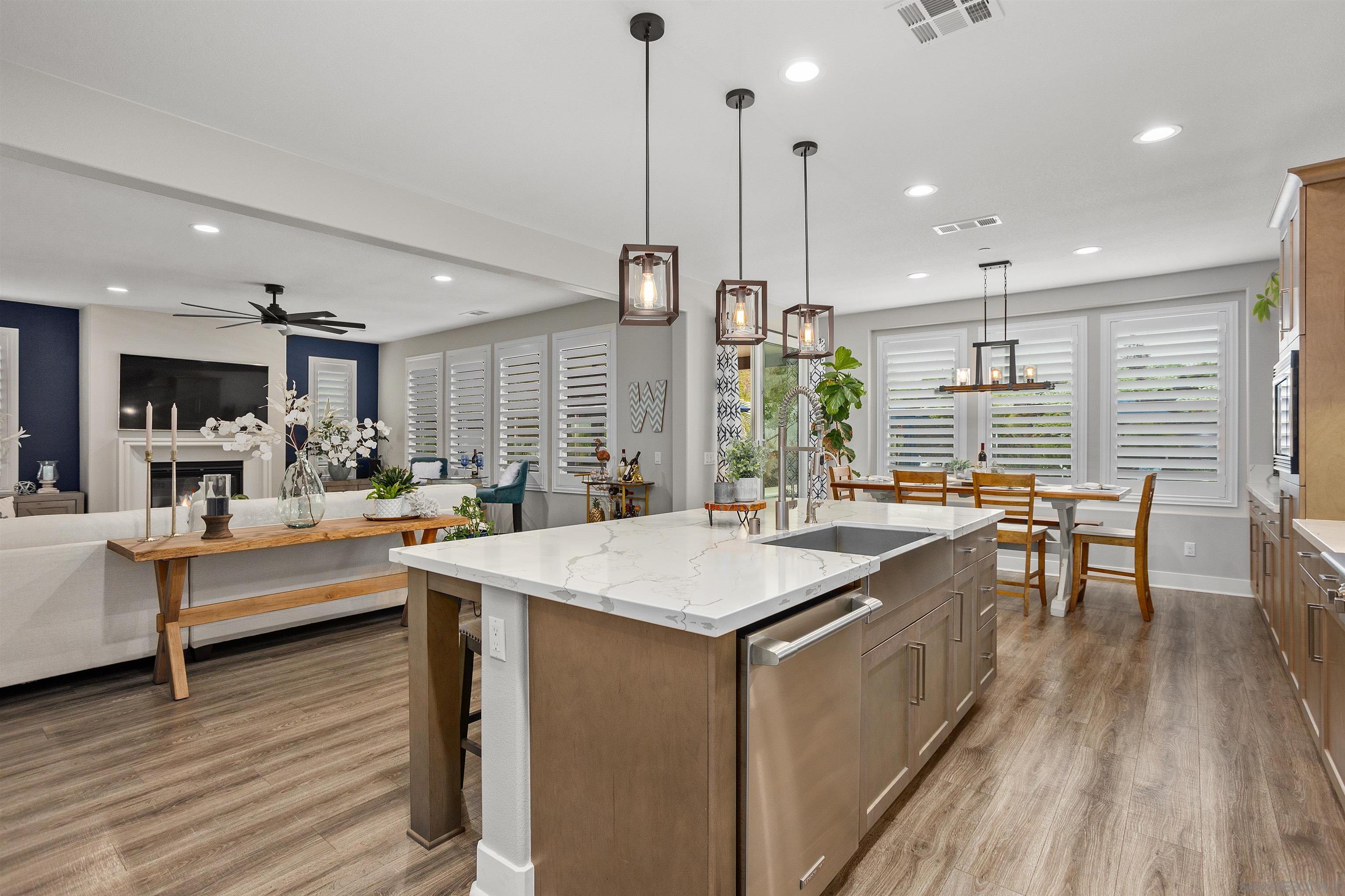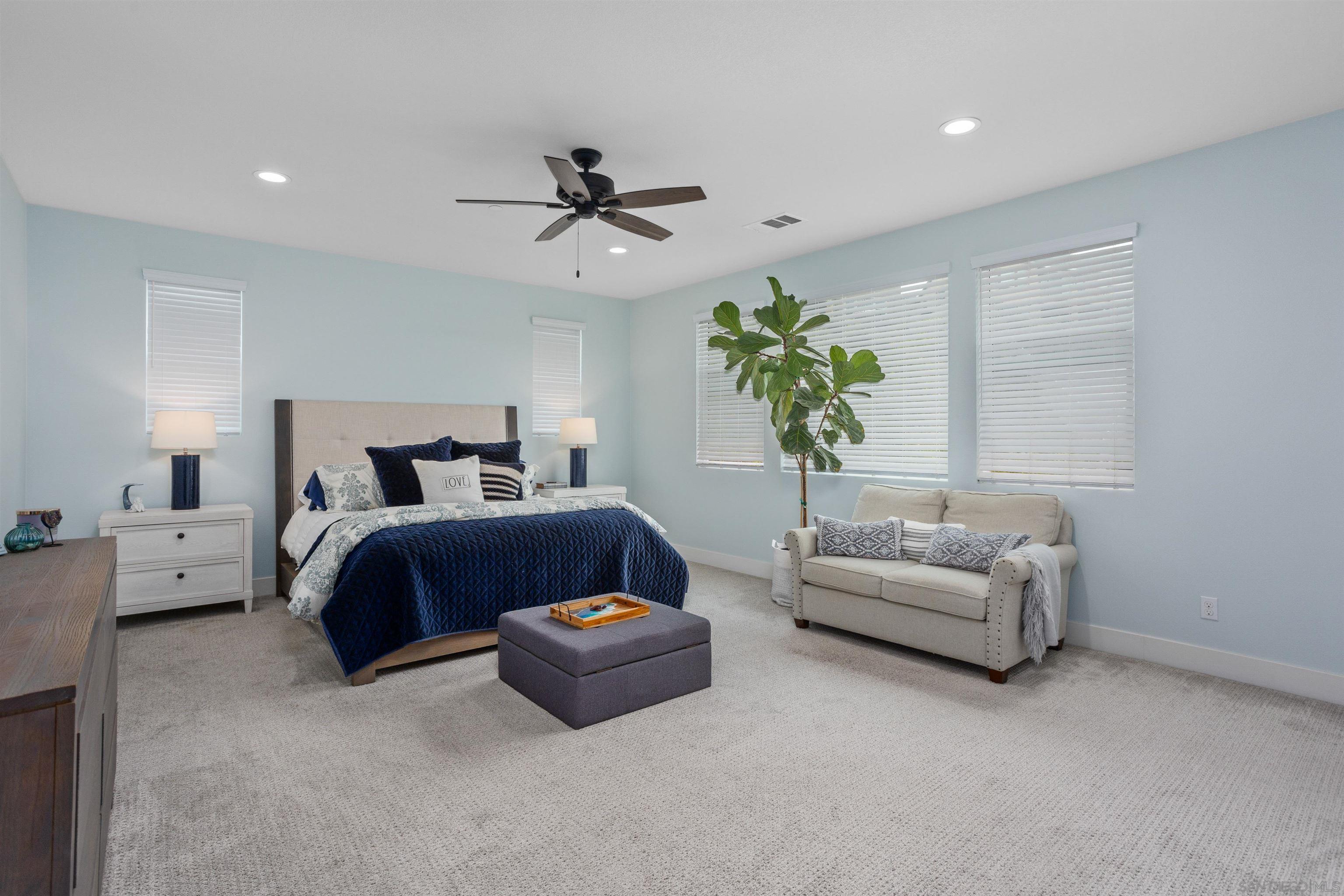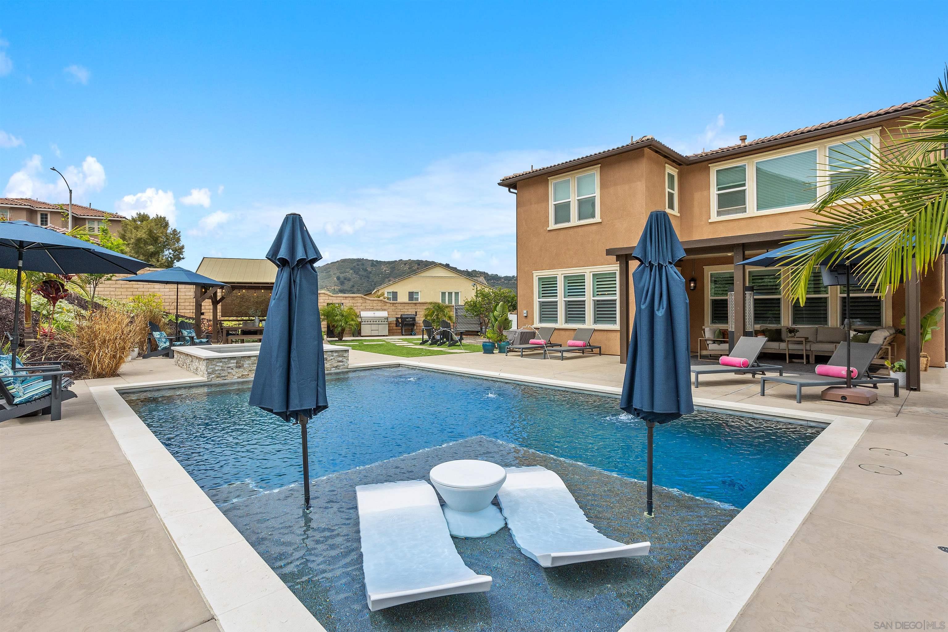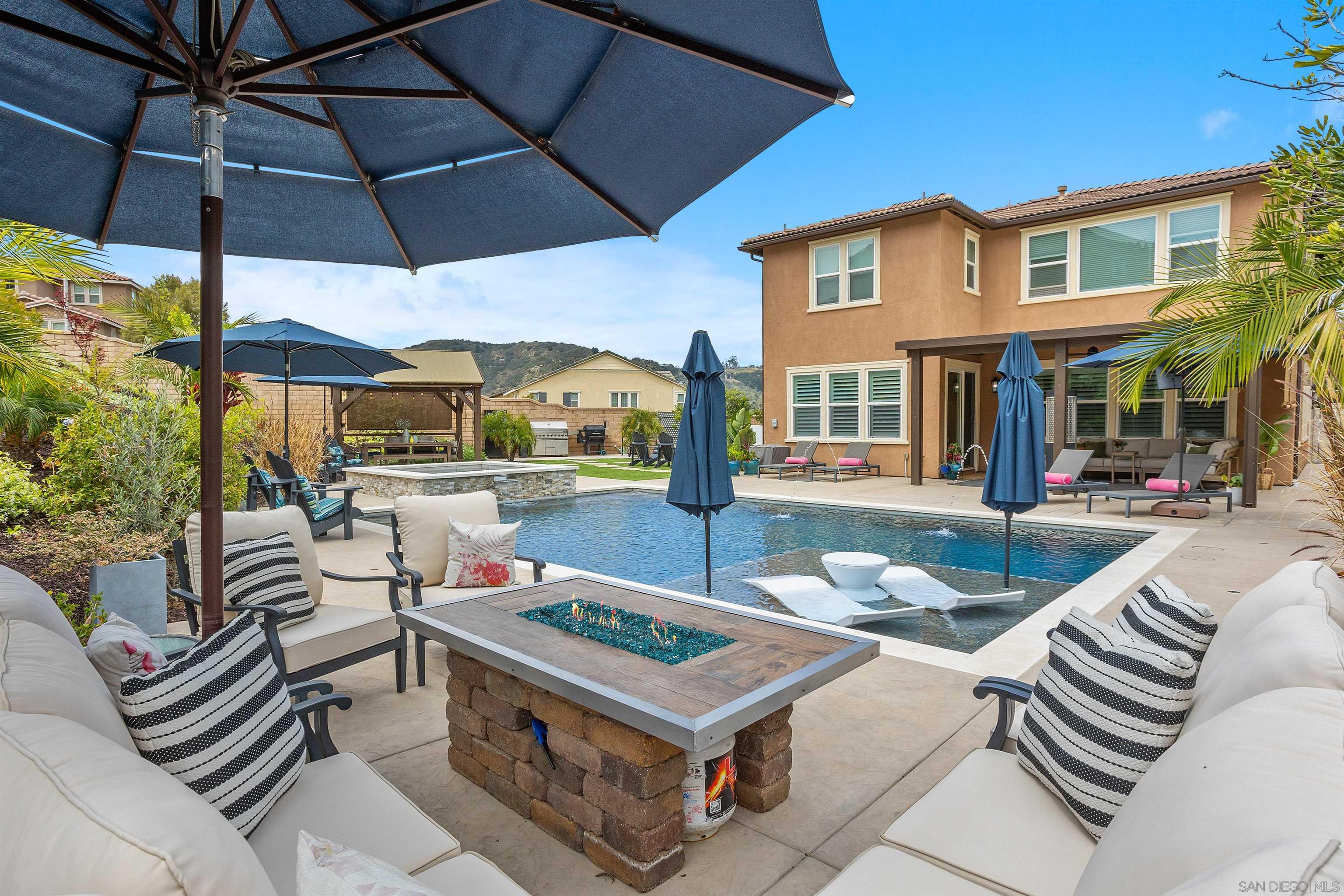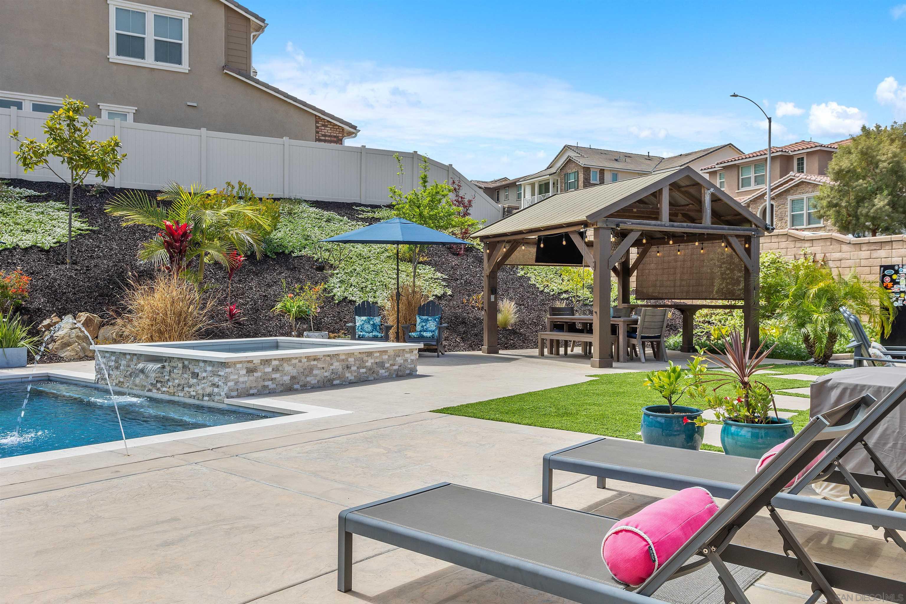 Resort-Style Living on a Corner Lot with Custom Pool & Spa, 4BR/3.5-BA home offering nearly 3,000 sq ft of living space, on one of the largest lot in the community, over 0.25 acres. Nestled on a desirable corner lot, this property features a backyard with multiple seating areas including a covered patio off the living room, a charming gazebo, perfect for entertaining or relaxing in style next to the flaming fire pit. Inside, the chef s kitchen is a culinary dream with a double oven, cooktop, built-in microwave, and a spacious island highlighted by designer pendant lighting. A butler s pantry adds extra functionality and storage. The living area boasts a cozy fireplace and effortless flow to the outdoor oasis. One bedroom with an en suite bathroom is conveniently located on the main floor, ideal for guests or multigenerational living. Throughout the home, you ll find a blend of luxury vinyl plank flooring, staggered tile in the bathrooms, and carpeting upstairs. Additional highlights include 9-foot ceilings with 8-foot doors, LED recessed lighting, and energy efficient solar panels. Retreat to the luxurious primary suite with an oversized soaking tub, separate walk-in shower, huge walk in closet, and abundant natural light. The extended front porch provides a private sitting area, while mature landscaping includes a variety of fruit and ornamental trees: Carrotwood, Ash, Japanese Maple, Plum, Lemon, Apricot, Lime, Tangelo, Avocado, King Palms, Pygmy Date Palm, and more. This home is the perfect blend of comfort, style, and functionality.Interested in this Listing?