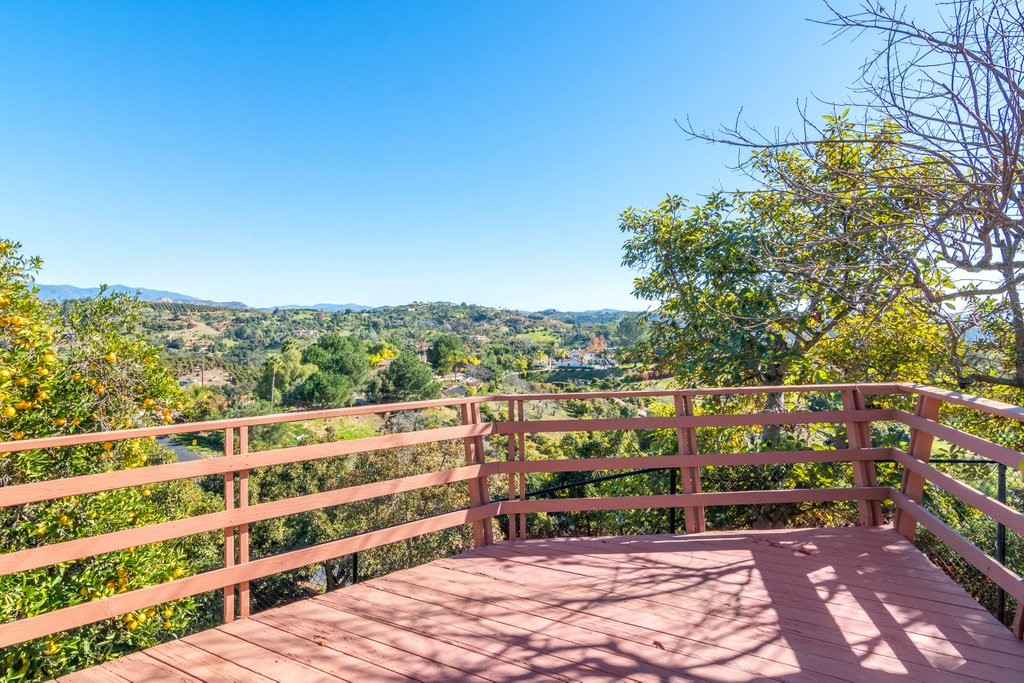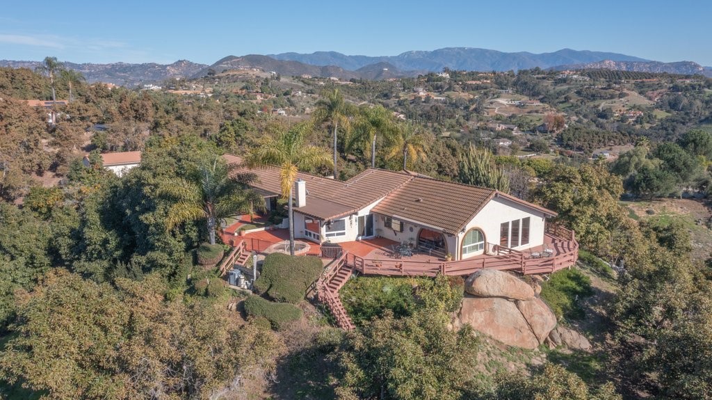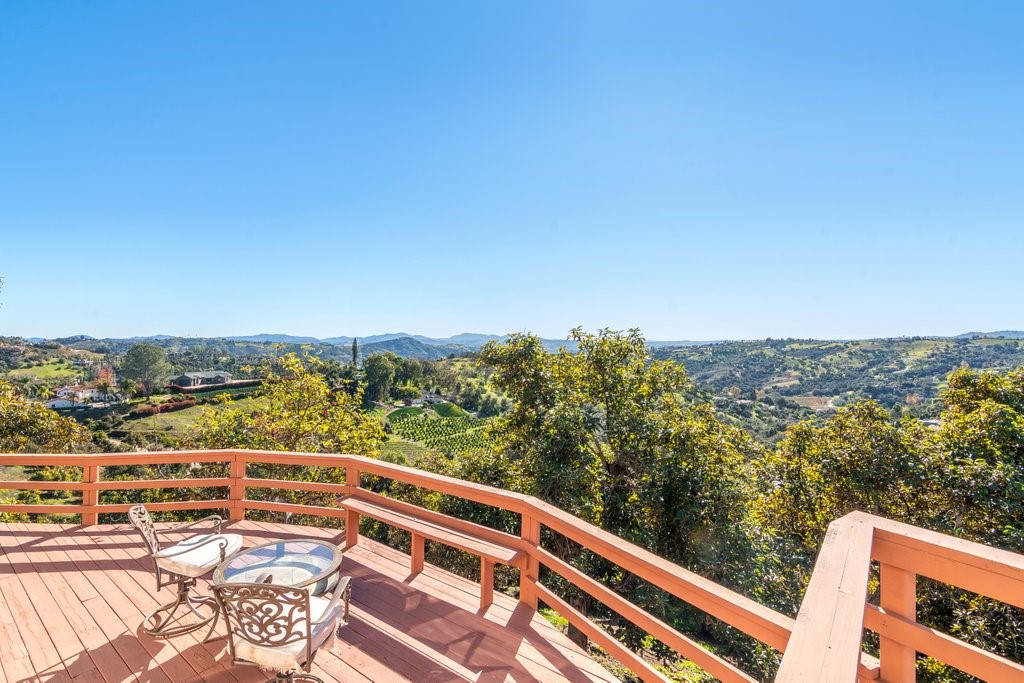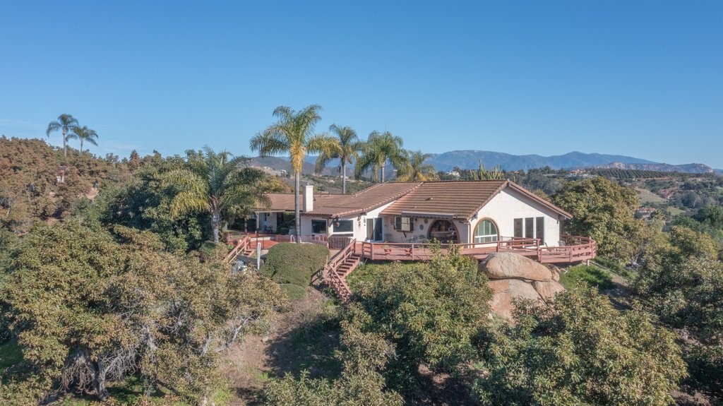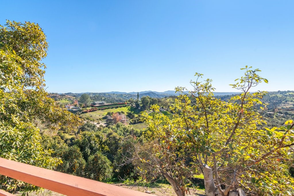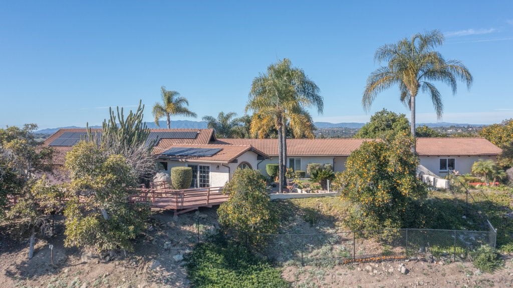 Beautiful single story home with amazing views. This gorgeous home sits high on a hill with views, views, views! Nestled in the middle of small avocado grove, giving lots of privacy. There are 2 separate parcels that make up just over 4.5 acres in total. The property also has multiple other fruit trees, including oranges, tangerine, lemons, lime, peach, apricot, olive, persimmons, fig, and blood orange. There is a completely separate bedroom and bathroom with it's own access and a walk in closet, giving this home a range of possibilities. The interior boasts a master bedroom with large master bathroom, custom shower, walk-in closet, and amazing views. The sunken living room has vaulted ceilings with large windows, a built in bar, and amazing views. The kitchen provides lots of storage, an island, granite counters, and amazing views. Just off the kitchen is a large dining room that is open to the living room with shutters on the windows, and amazing views. One of the guest rooms has a sliding door to the back patio. The large indoor laundry room has additional storage, a sink, and access to the back yard. There is a 2-car garage connected to the house, and a separate 1-car garage for additional storage, tools, etc. The paid solar system greatly offsets the electricity usage. The wonderful decks and patios that go around the back and side yard give lots of space to enjoy the outdoors and the views. There is an electric awning for some shade on the deck as well as a built in spa. This home is extremely well kept and loved by the current owners. The grove is approximately 230 avocado trees.Interested in this Listing?
