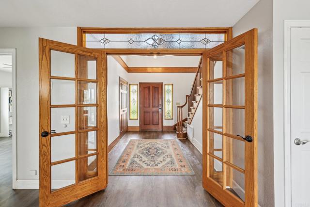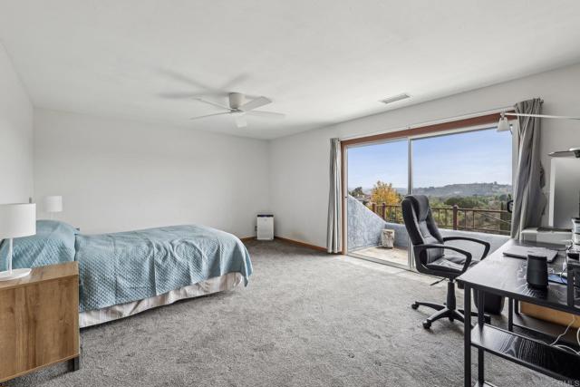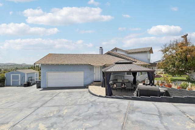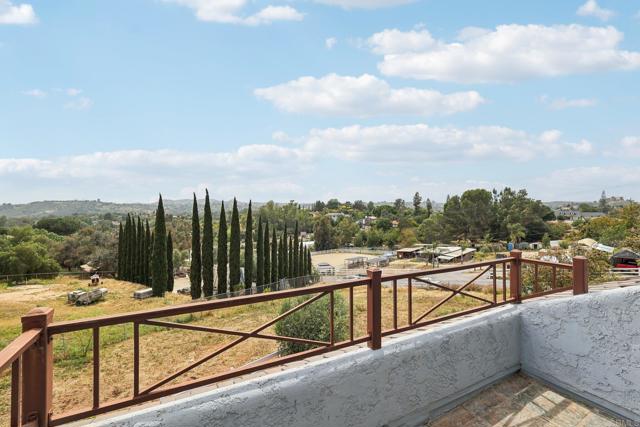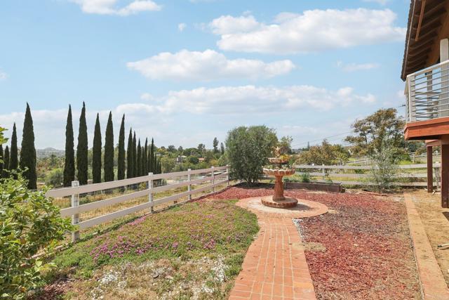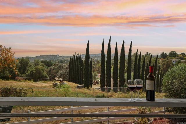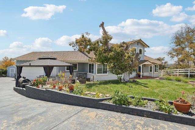 Fabulous storybook house on 1 acre in Fallbrook in a beautiful peaceful neighborhood with custom estates, horse properties and pastoral settings. Fully fenced and gated. No HOA! No Mello-Roos! The formal entry has a vaulted ceiling and gorgeous French doors leading into the great room. Well designed floor plan for multigenerational living. 2 large bedrooms on the main floor; one with access to the back patio, the other with a pretty bay window and window seat. Both have large closets with mirrored doors. One full bath and one half bath on the main level. Updated kitchen with granite counters and breakfast bar and a newer energy efficient induction stove included. The expansive great room connects to a large view patio deck to enjoy the evening breeze. Huge master retreat upstairs has sweeping views and a balcony. There are 2 large mirrored closets and a walk-in closet with hanging rods and shelving. Bonus room with an entry door and access to the half bath with a walled sewing/craft table, could be used as a sewing crafting room or could be used as a massage studio or home gym or an office. The yard includes an orchard with18 fruit trees: 10 avocado, 2 peach, 2 pink lemon, 1 lemon, 1 orange, 1 lime, and 1 nectarine. There is a built-in gazebo on the side of the house, patio furniture and BarBQ included. There is also a shed painted to match the house. The house is wonderfully situated on the flat usable lot with plenty of room to build an ADU or add a pool or both, and still have front and back yards. This amazing property is conveniently located; just a short drive to the 76 and 15 freeways, and the Market Place Del Rio shopping center with delicious restaurants and a movie cinema.Interested in this Listing?