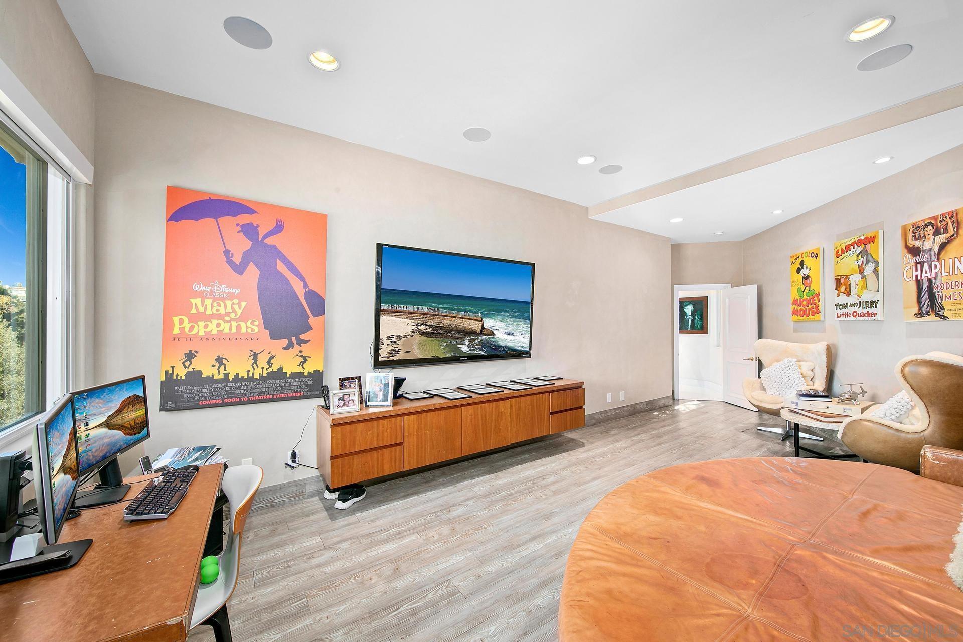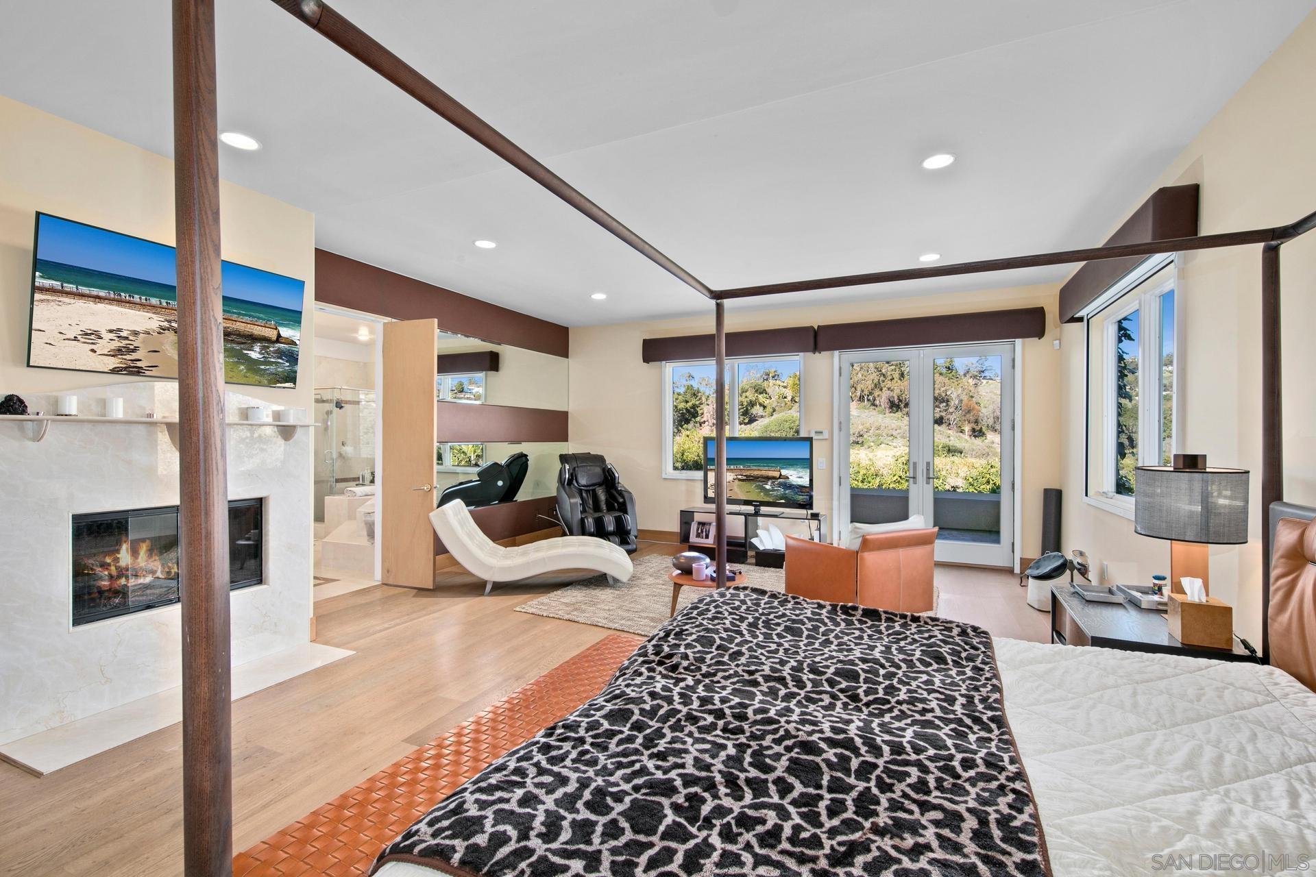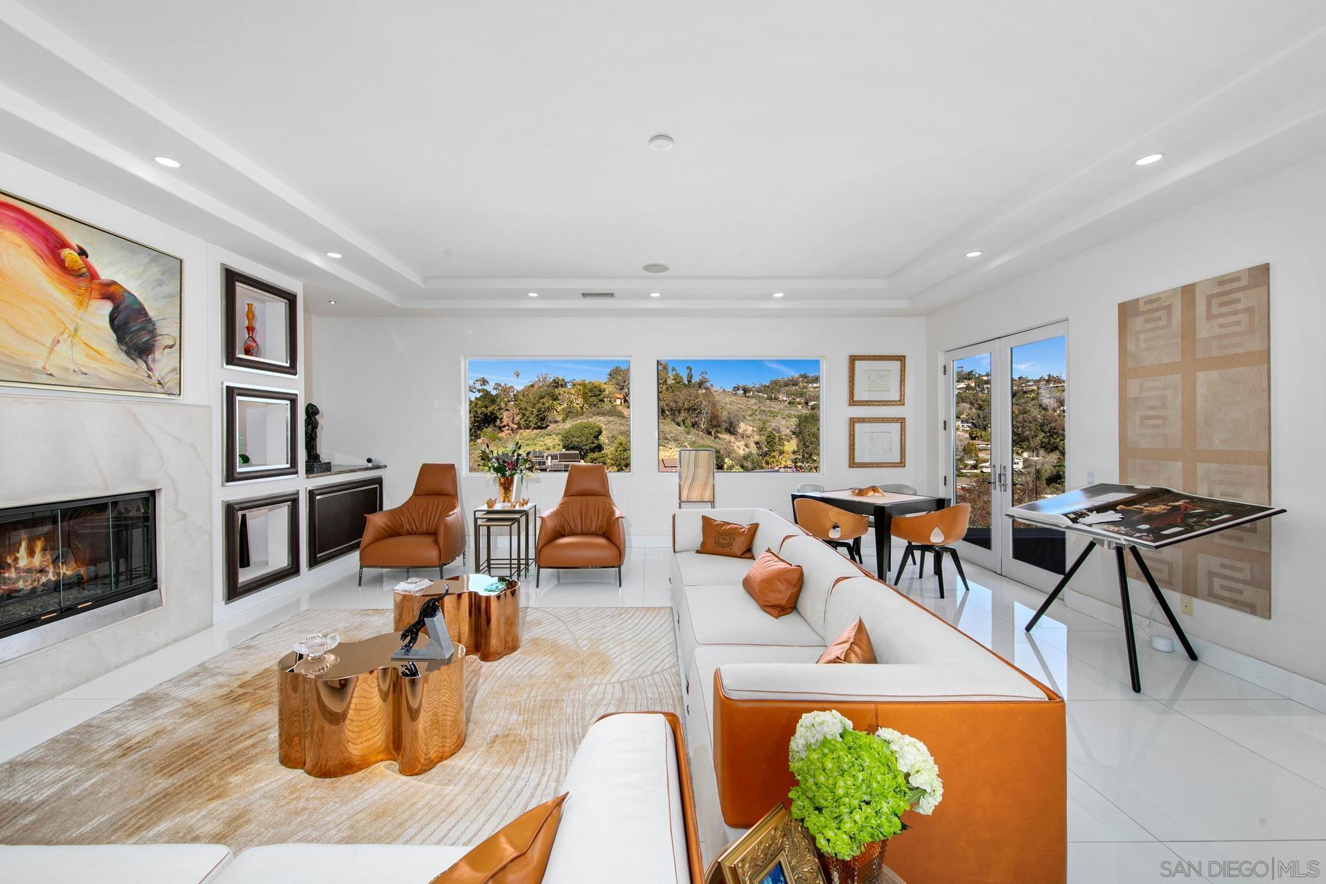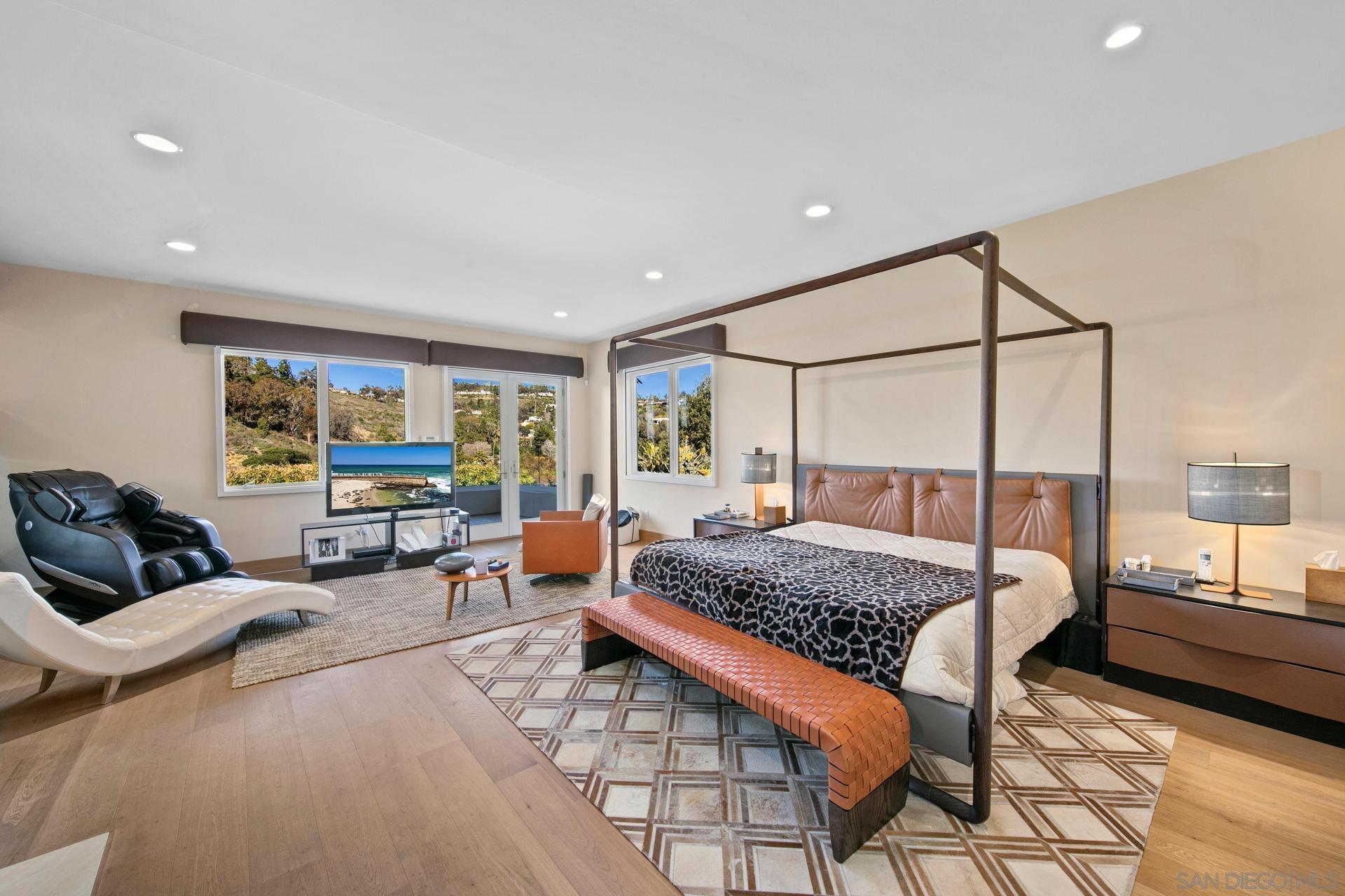Welcome to this stunning estate nestled into the hillside in the coveted Muirlands neighborhood of La Jolla. This exceptional property boasts ocean and mountain views, offering a true sense of tranquility and luxury. As you enter the 5,812 square foot home, you are greeted by a grand foyer with soaring ceilings, a sweeping staircase, and an abundance of natural light. The main level features an elegant living room with a fireplace, a spacious formal dining room, a gourmet chef's kitchen with top-of-the-line appliances and a center island, a cozy breakfast nook, and a comfortable family room with a fireplace and built-in shelves. Also upstairs, you ll find one of the 5 bedrooms, which has been converted into a media room, with a projector, large sofa seating, & an en-suite bathroom. The lower level includes the other 4 bedrooms, including the primary suite, which is a true oasis with a private fireplace & a luxurious bathroom with dual vanities, a soaking tub, a walk-in shower, and two oversized walk-in closets. The 3rd car garage also has been outfitted as a separate guest suite with a private entrance. The outdoor area is equally impressive, with multiple terraces and patios that capture the stunning views and create a perfect setting for outdoor dining, lounging, and entertaining. The spa are surrounded by lush landscaping and provide a peaceful retreat. Located in one of the most desirable areas of La Jolla, this home offers a perfect balance of privacy, serenity, and convenience, with easy access to world-class beaches, shops, restaurants, and top-rated schools.Interested in this Listing?