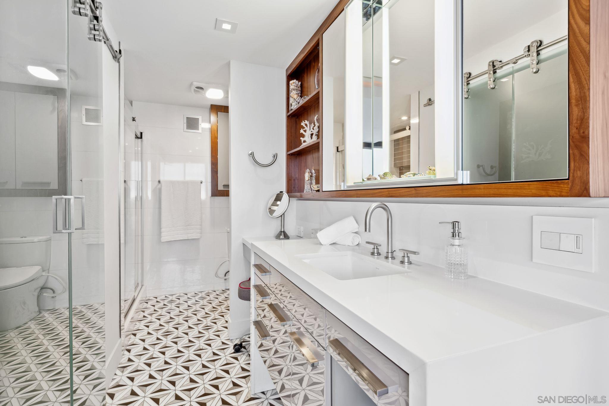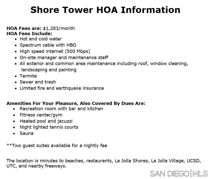 Opportunity knocks for view lovers! Rare one-of-a-kind completely remodeled 12th floor END-UNIT with expansive ocean, white water, Scripps pier, sunset, twinkling night light views see all the way down the coast! Rare gems like this do not come around often. Out of 60 units, there are only a handful of END UNITS with North AND West facing full-size glass doors that showcase these amazing views. This truly exceptional residence has been tastefully designed and remodeled Just bring your toothbrush and settle into effortless living. Beautiful electric kitchen equipped with Thermador induction cooktop, Miele dishwasher and waterfall granite countertop. The living/dining great room is bathed in natural lighting, and you're surrounded by views. This room also has a large view balcony and two Juliet view balconies. Wood flooring throughout the main living areas. Wake up every morning and enjoy the sit-down panoramic views from your primary suite. Remodeled primary bathroom with walk-in closet. This is the lifestyle you ve been waiting for! Shore Tower provides an array of amenities including heated pool and spa, large recreational room with bar and kitchen, night-lit tennis courts, well-equipped gym with sauna, on-site property manager and two guest suites available for a nightly fee. This unit includes two assigned parking spaces in a secure parking garage, along with ample guest parking on-site. Additionally, an extra storage area in the storage room. Minutes to beaches, restaurants, La Jolla Shores, La Jolla Village, UCSD, UTC, and nearby freeways.Interested in this Listing?