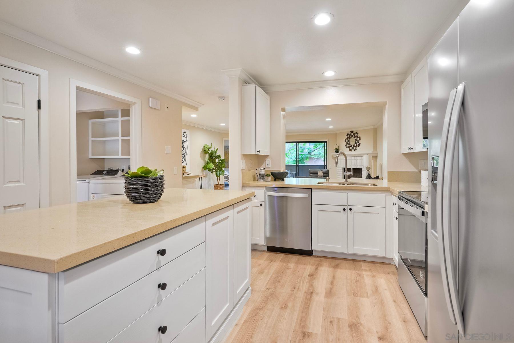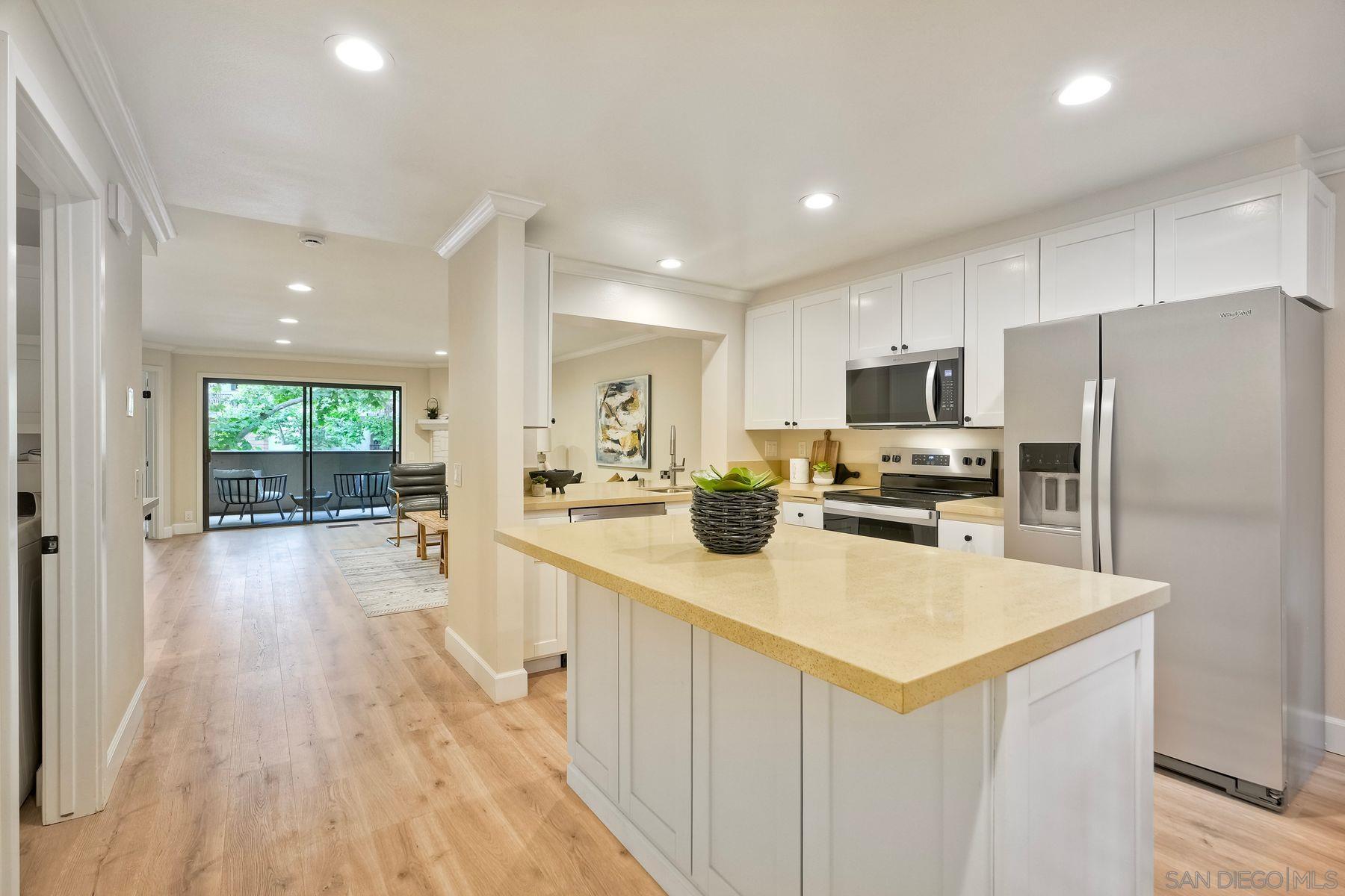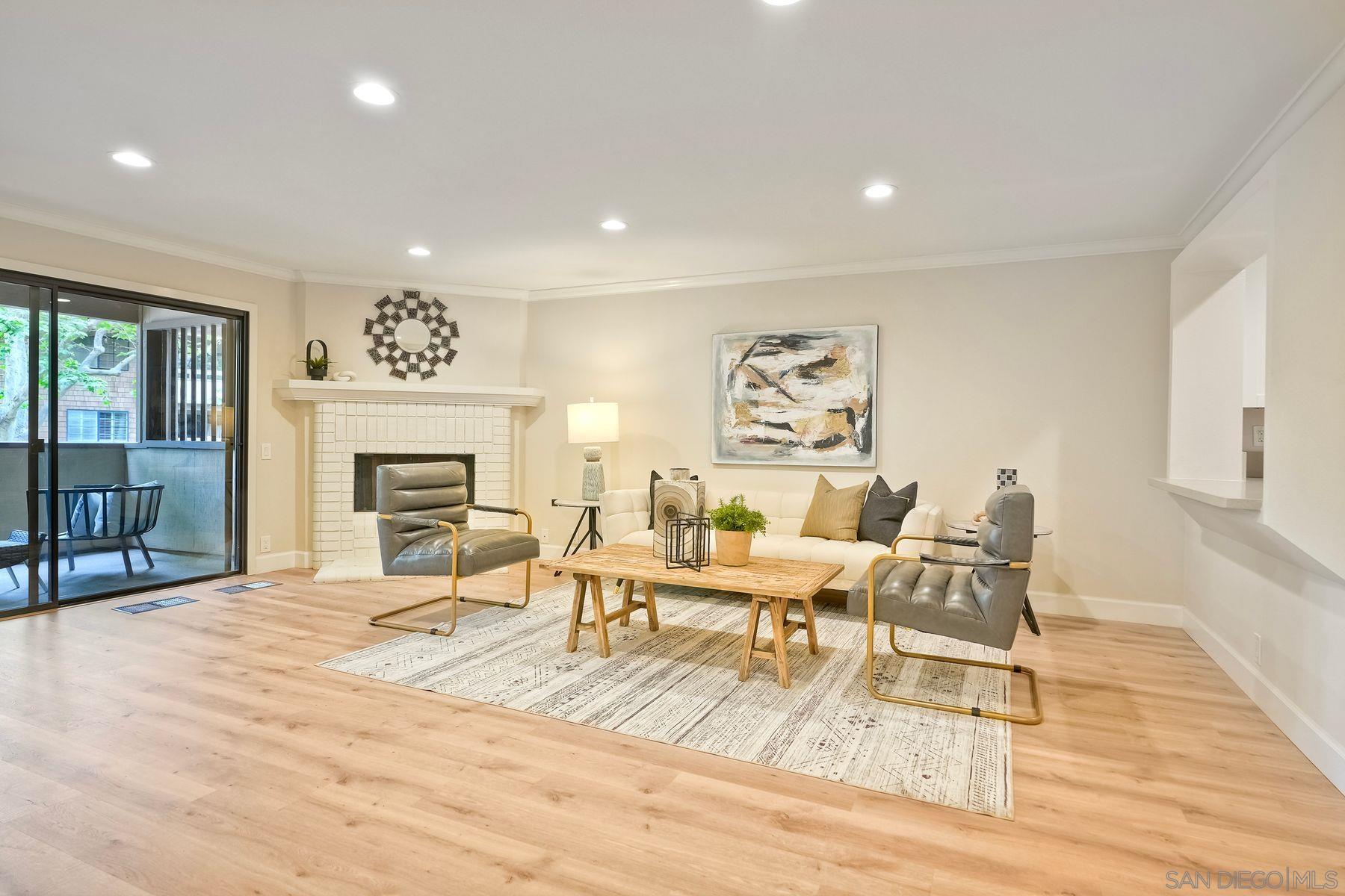 This freshly renovated condo in the highly sought after Boardwalk complex is centrally located within walking distance to UCSD, shopping, dining and medical facilities. Updated kitchen and baths include new stainless steel appliances, new bath sinks, quartz countertops, wine cooler, new tiled shower with glass doors in primary bath. Open floor plan has been appointed with new modern plumbing and lighting fixtures, all new hardware and recessed lighting in kitchen and living room. New plank flooring and paint throughout, fireplace with gas starter, dry bar which is plumbed for a sink, and full-sized laundry in unit. Relax outside on your own private, covered balcony accessible from both Living rm and Primary bedroom. Enjoy an active lifestyle with all the resort like amenities right on property (Pool, spa, tennis, billiards, clubhouse) Controlled access building with an elevator and 2 parking spaces in the controlled access garage. Additional storage cabinets in garage above parking spaces. Must see! Ready for immediate move in.Interested in this Listing?
