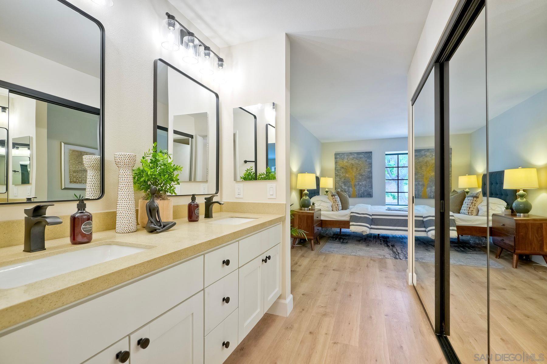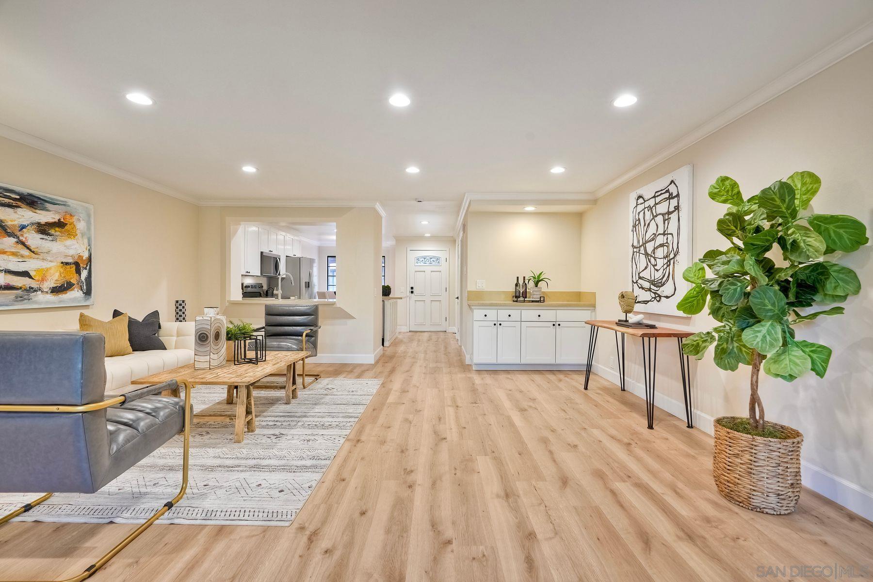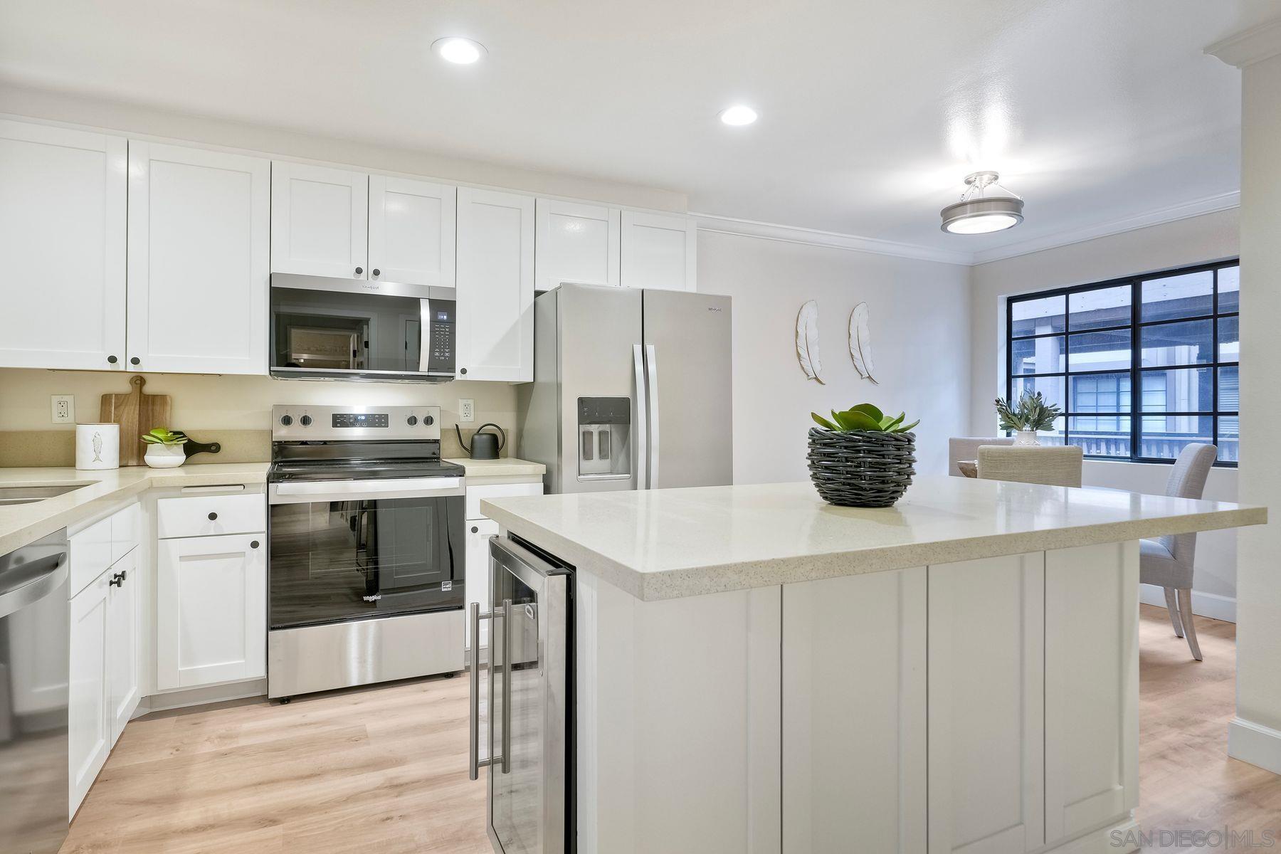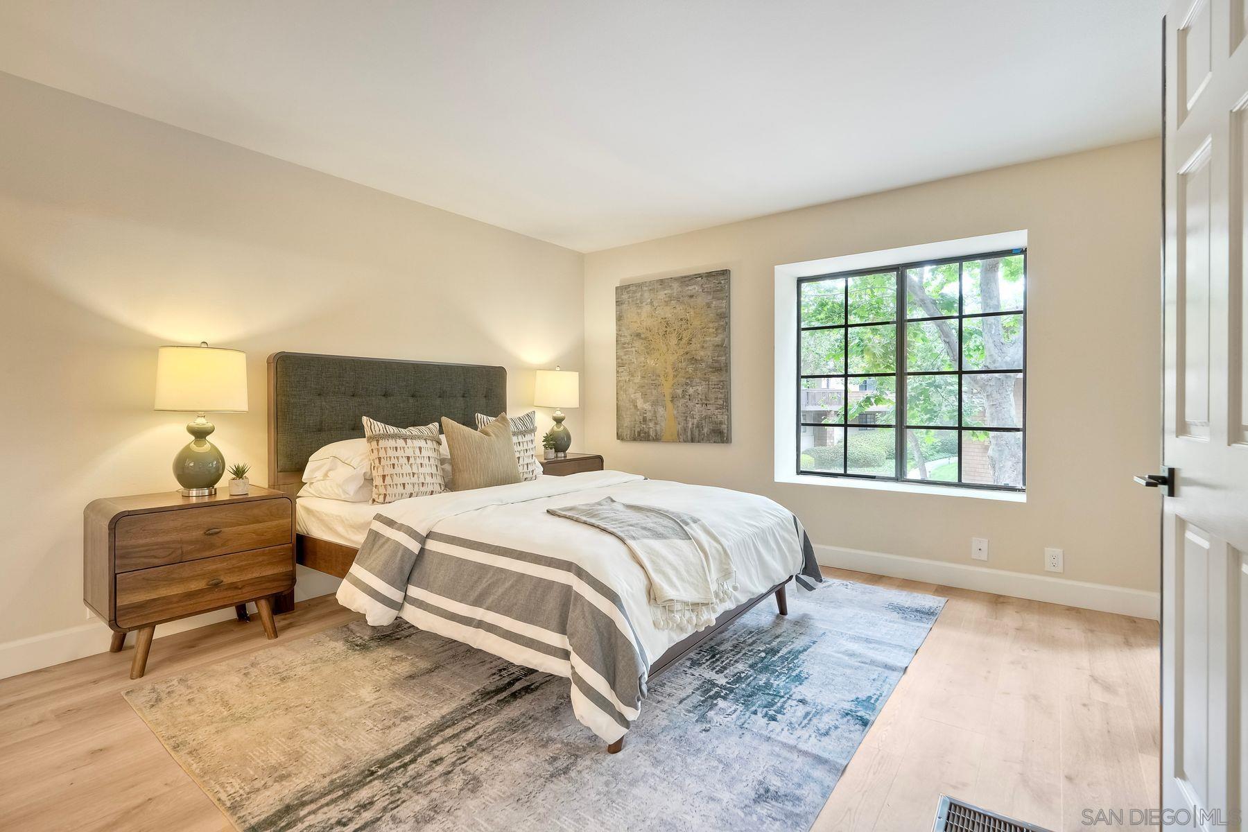This freshly renovated condo in the highly sought after Boardwalk complex is centrally located within walking distance to UCSD, shopping, dining and medical facilities. Updated kitchen and baths include new stainless steel appliances, new bath sinks, quartz countertops, wine cooler, new tiled shower with glass doors in primary bath. Open floor plan has been appointed with new modern plumbing and lighting fixtures, all new hardware and recessed lighting in kitchen and living room. New plank flooring and paint throughout, fireplace with gas starter, dry bar which is plumbed for a sink, and full-sized laundry in unit. Relax outside on your own private, covered balcony accessible from both Living rm and Primary bedroom. Enjoy an active lifestyle with all the resort like amenities right on property (Pool, spa, tennis, billiards, clubhouse) Controlled access building with an elevator and 2 parking spaces in the controlled access garage. Additional storage cabinets in garage above parking spaces. Must see! Ready for immediate move in.Interested in this Listing?