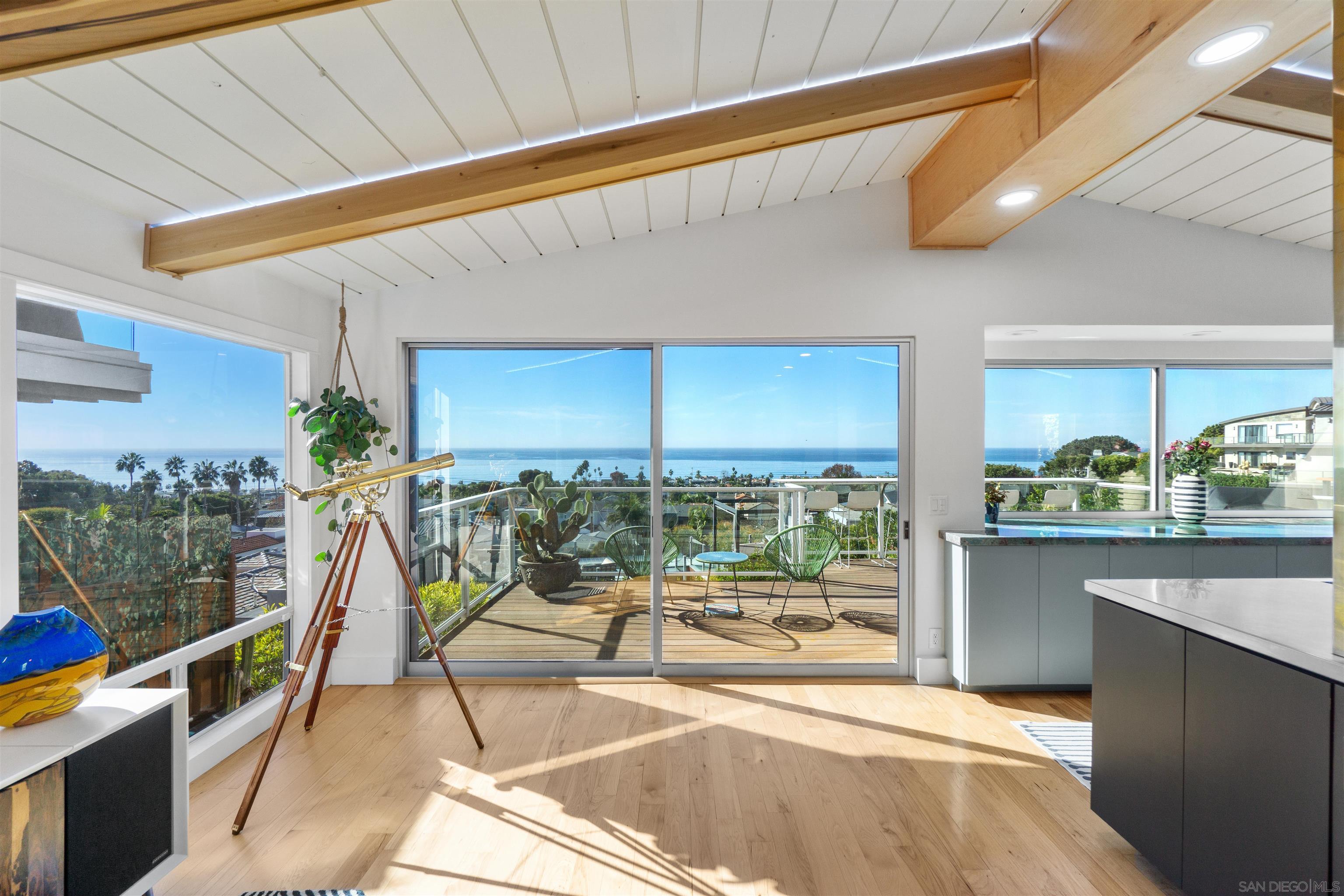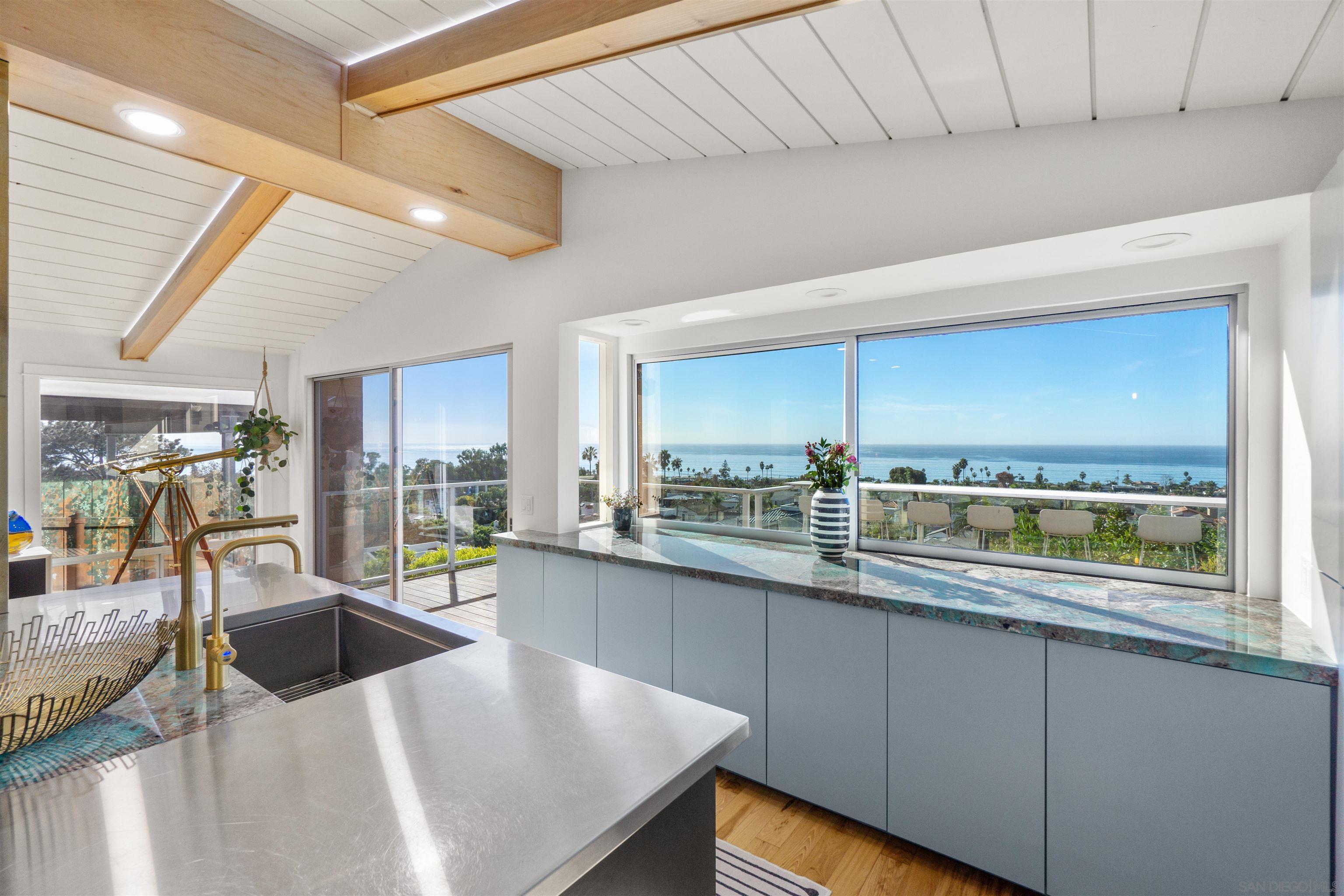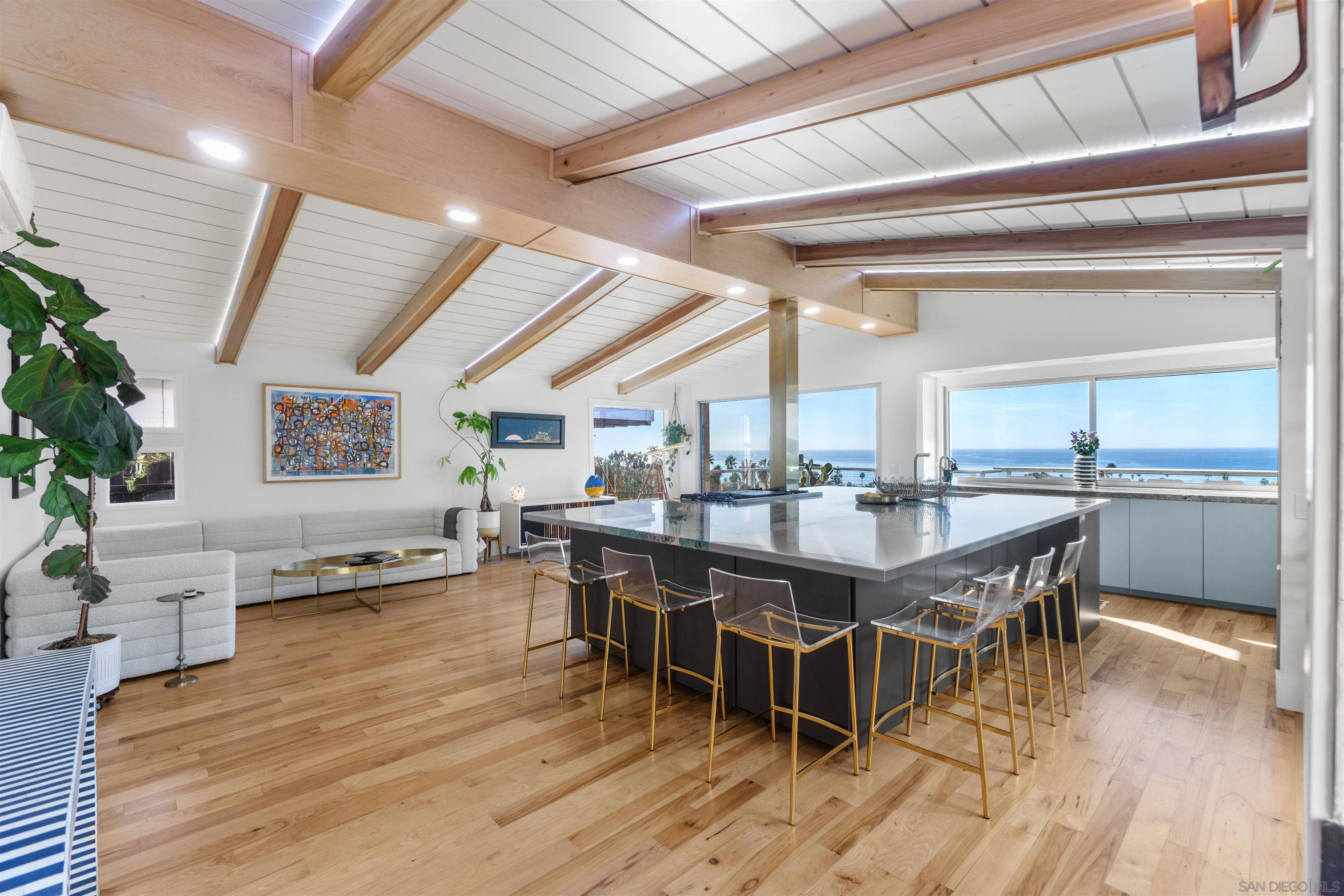 Luxe bespoke interiors and refined coastal elegance highlight truly show-stopping ocean views to create this luxury seaside retreat, nestled in the hills above the shops, dining and world class beaches of La Jolla's delightful Bird Rock. Fully equipped chef's dream kitchen w all the finest, solar energy, wine cellar, heated indoor-outdoor spaces, sauna, outdoor shower, an absolutely stunning primary suite and views, views, views!
