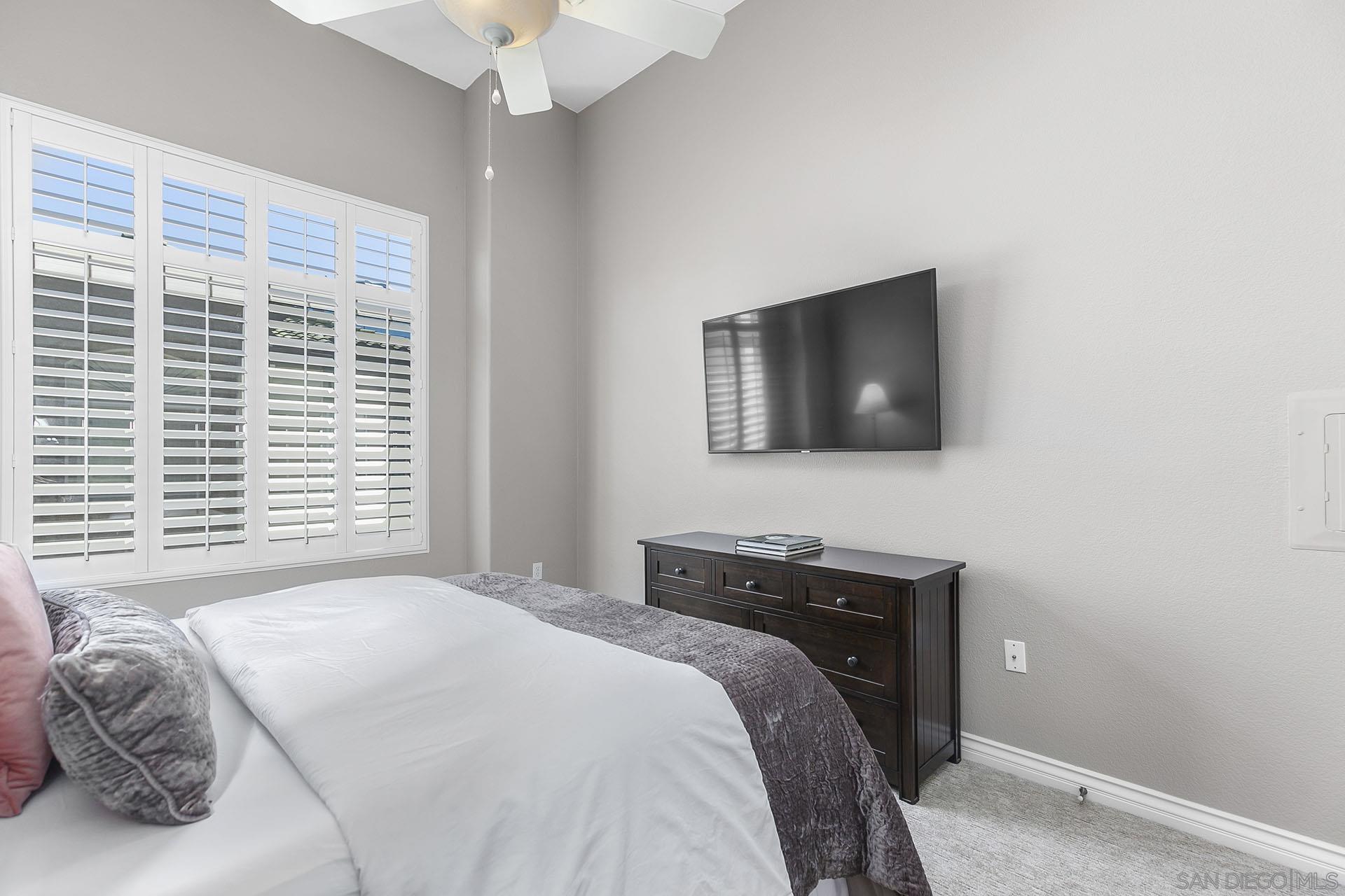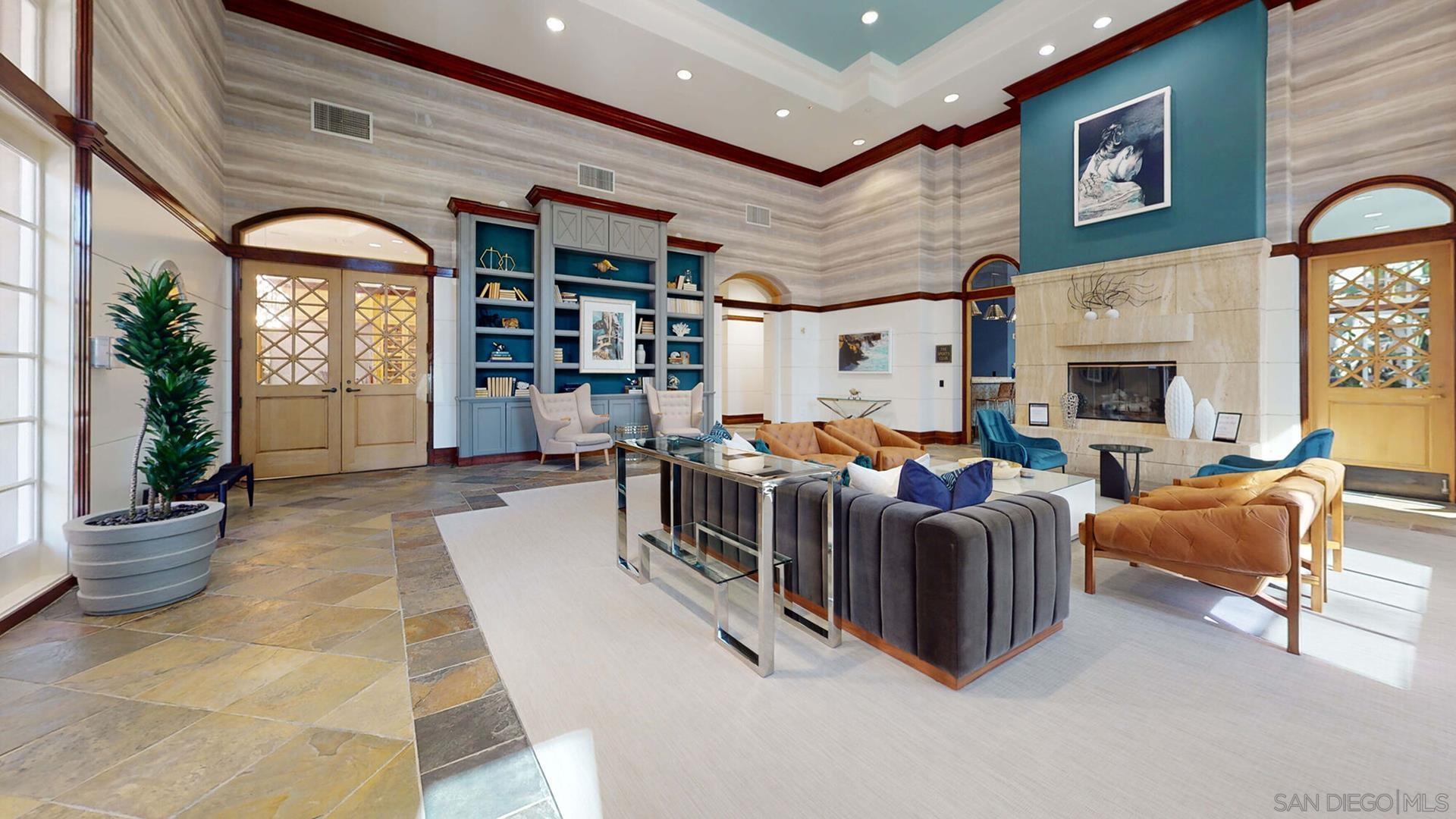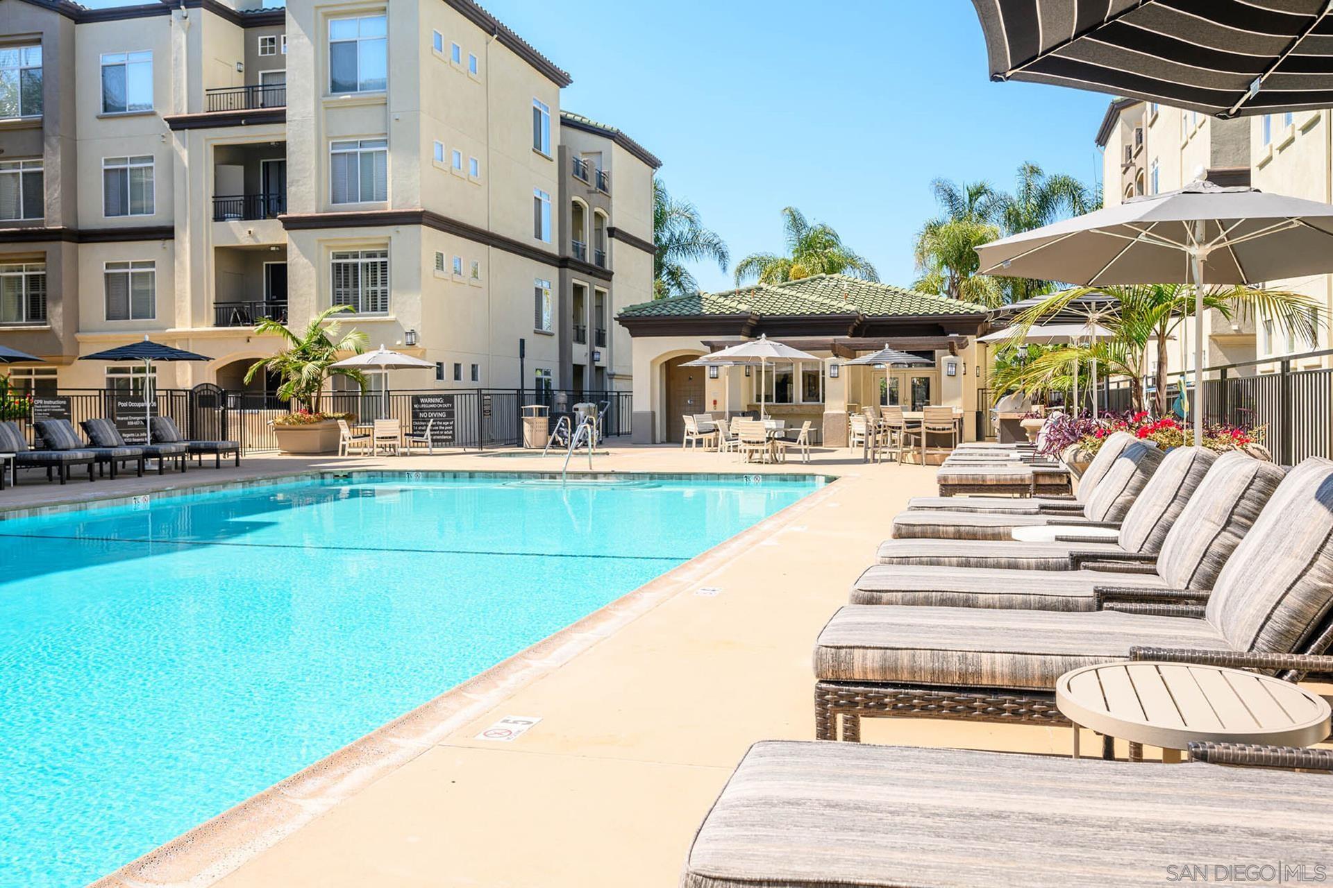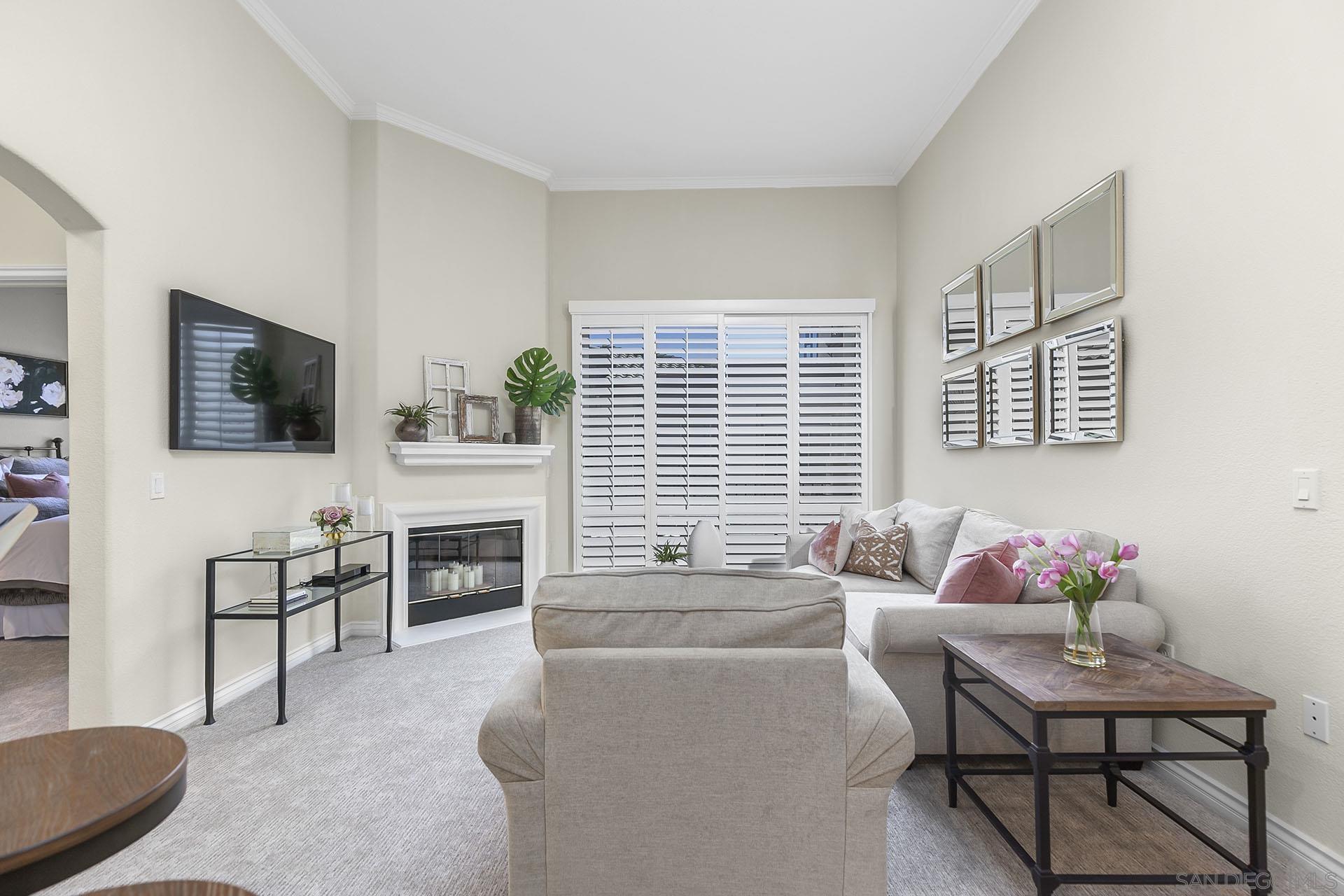 Best location in Complex, Stunning penthouse located in the prestigious Regents La Jolla, situated in the highly sought-after UTC area. Just moments from premier shopping, dining, hospitals, universities, and major freeways, this residence offers unparalleled convenience and sophistication. This penthouse boasts a spacious, open floor plan with 14-foot vaulted ceilings, featuring 2 bedrooms and 2 bathrooms. The light-filled living room complete with a cozy fireplace, opens to a balcony with an additional storage closet. Enjoy the elegance of custom plantation shutters throughout, brand new neutral carpeting, and two dual primary bedrooms with one en-suite bath. The unit includes a stackable washer/dryer in the closet for added convenience. Ceiling fans and ample closet space further enhance the comfort of this home. The immaculate kitchen is a chef's dream, with granite countertops, an eat-at counter and stainless-steel appliances. The Regents La Jolla complex offers a wealth of amenities, including a clubhouse, concierge services, business center, pools, spa, fitness center, game room, movie theater, outdoor community BBQ, package room, pool cabanas, underground garage & two side by side parking spaces next to elevator.
