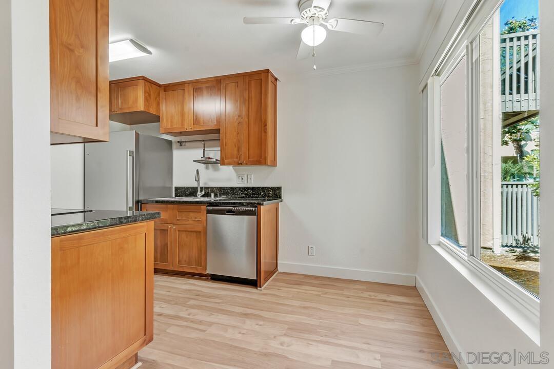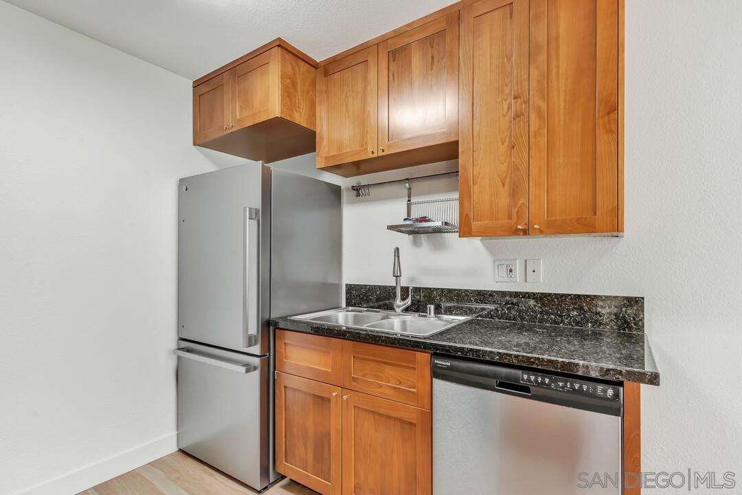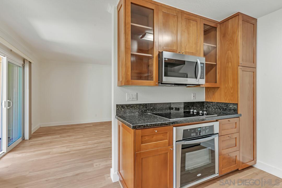 Beautifully upgraded junior-1 bedroom available for lease on 5/5/2025. Move right into this junior-1 bedroom condo that is situated in a quiet garden-style setting. It offers dual-pane windows, new vinyl plank flooring, custom paint, mirrored closet doors, stainless steel appliances and 1 parking spot. There is an extra storage closet off patio. Villa La Jolla offers two swimming pools, two Jacuzzi's, clubhouse and fitness center. Minutes to UCSD, shopping and local beaches, I-5 and SR-52.