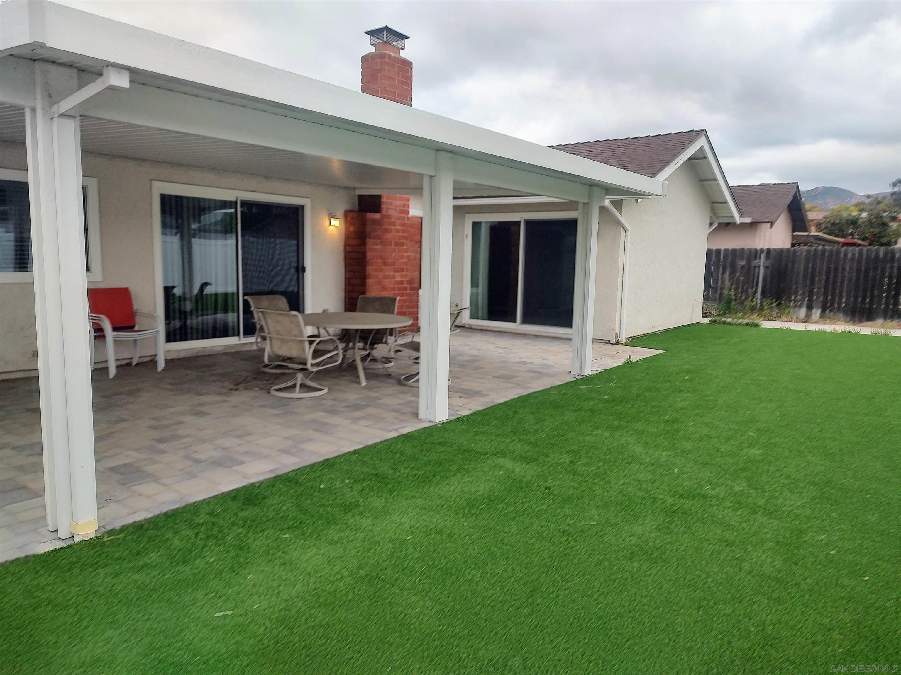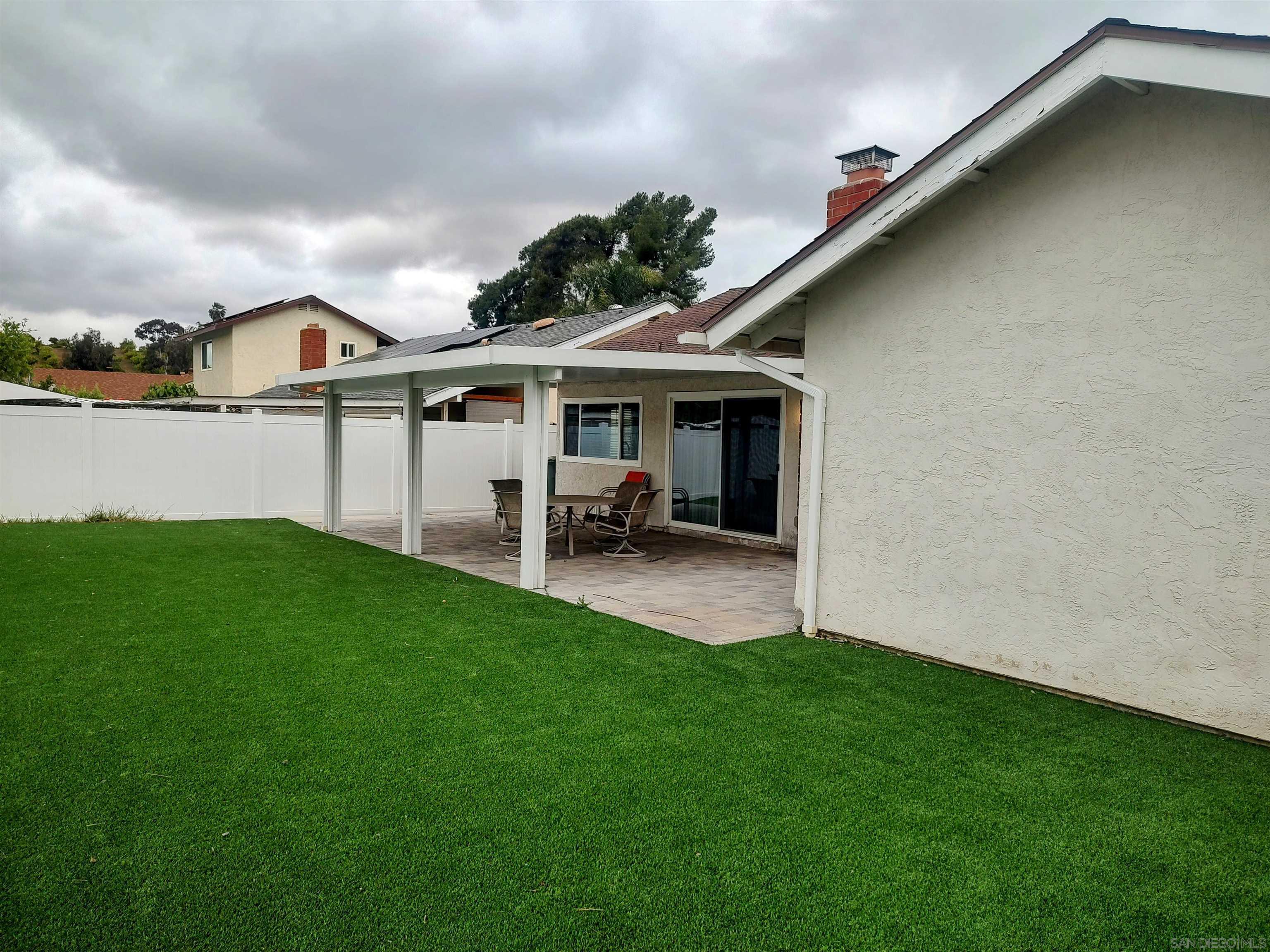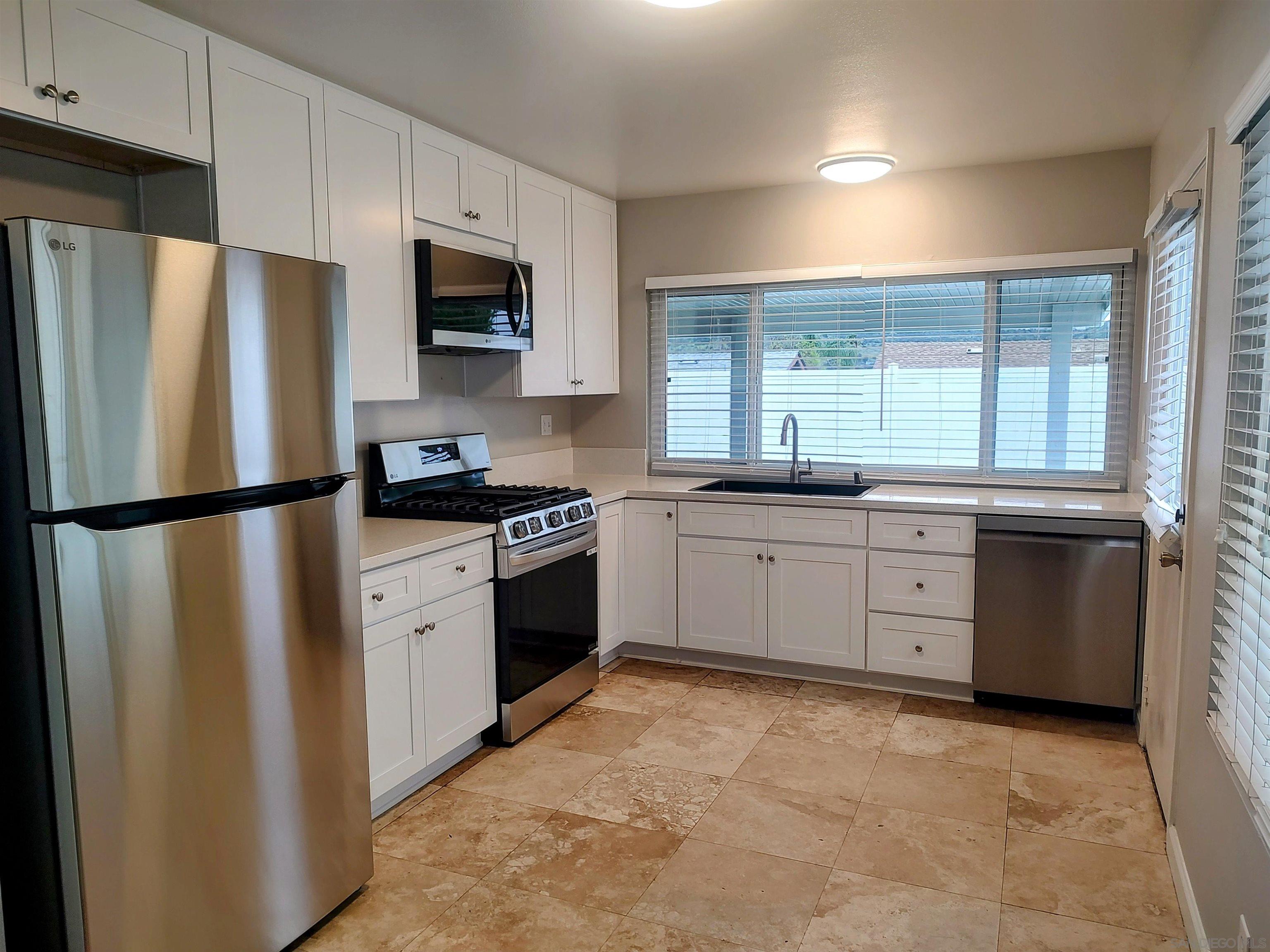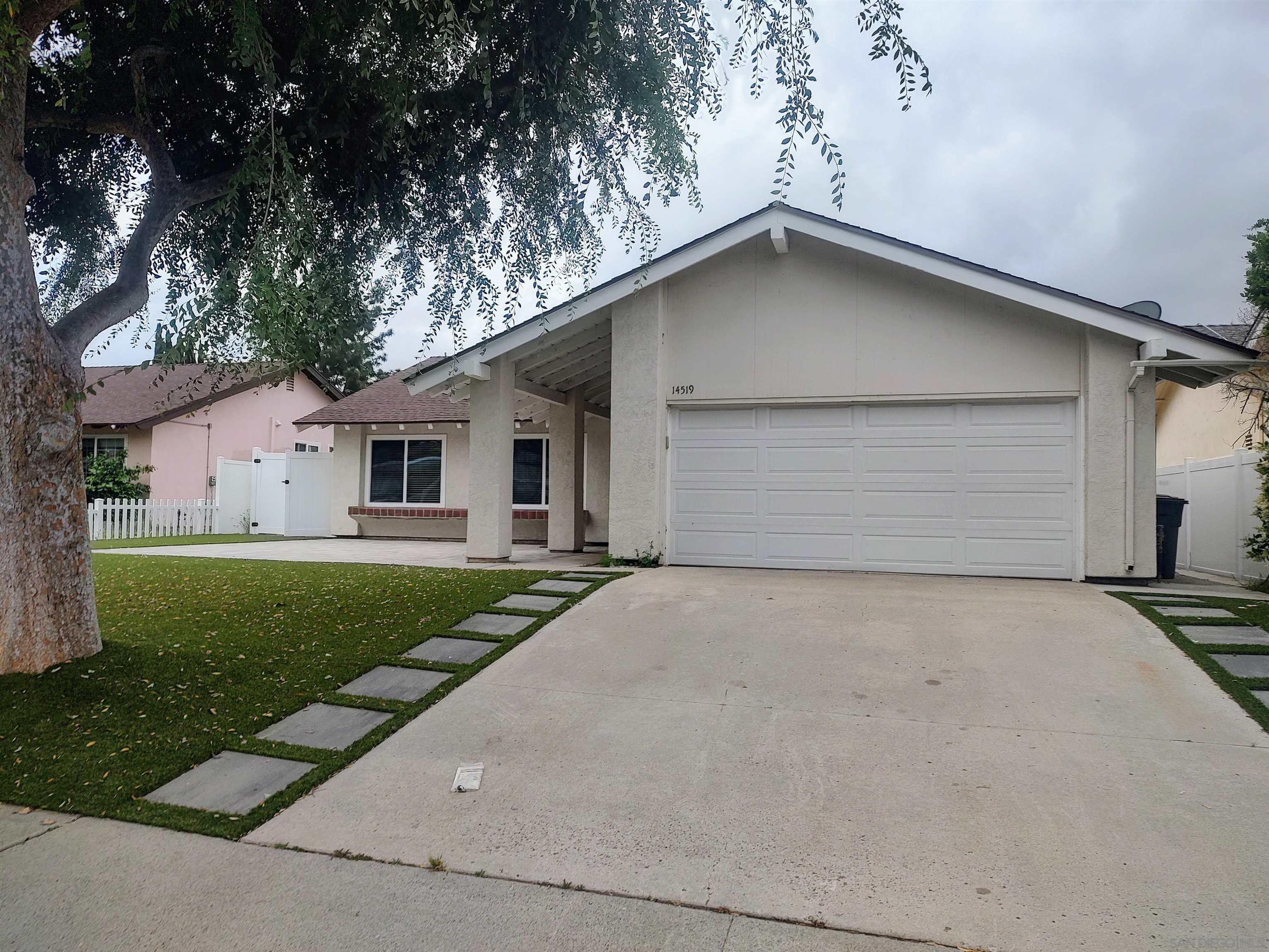 Welcome to this highly desirable single level home nestled in the Garden Road neighborhood of Poway. This 4 bedroom | 2 bathroom home features a newly renovated kitchen with stainless steel appliances, quartz countertops and a farmhouse-style sink. Natural light fills the kitchen through large windows and side door leads to a backyard with newly installed low maintenance turf and privacy fencing. Sliding doors from the living room and primary bedroom open to the backyard and patio. Bedrooms have new carpet and bathrooms feature tiled shower enclosures. Vaulted ceiling in the living room with a cozy fireplace hearth add to the charm of this move in ready home. This quiet community is located in the top-rated Poway Unified School District and close to shopping, dining, entertainment. Historic Poway Midland Railroad, numerous outdoor nature trails and Lake Poway Recreation Area are just minutes away!