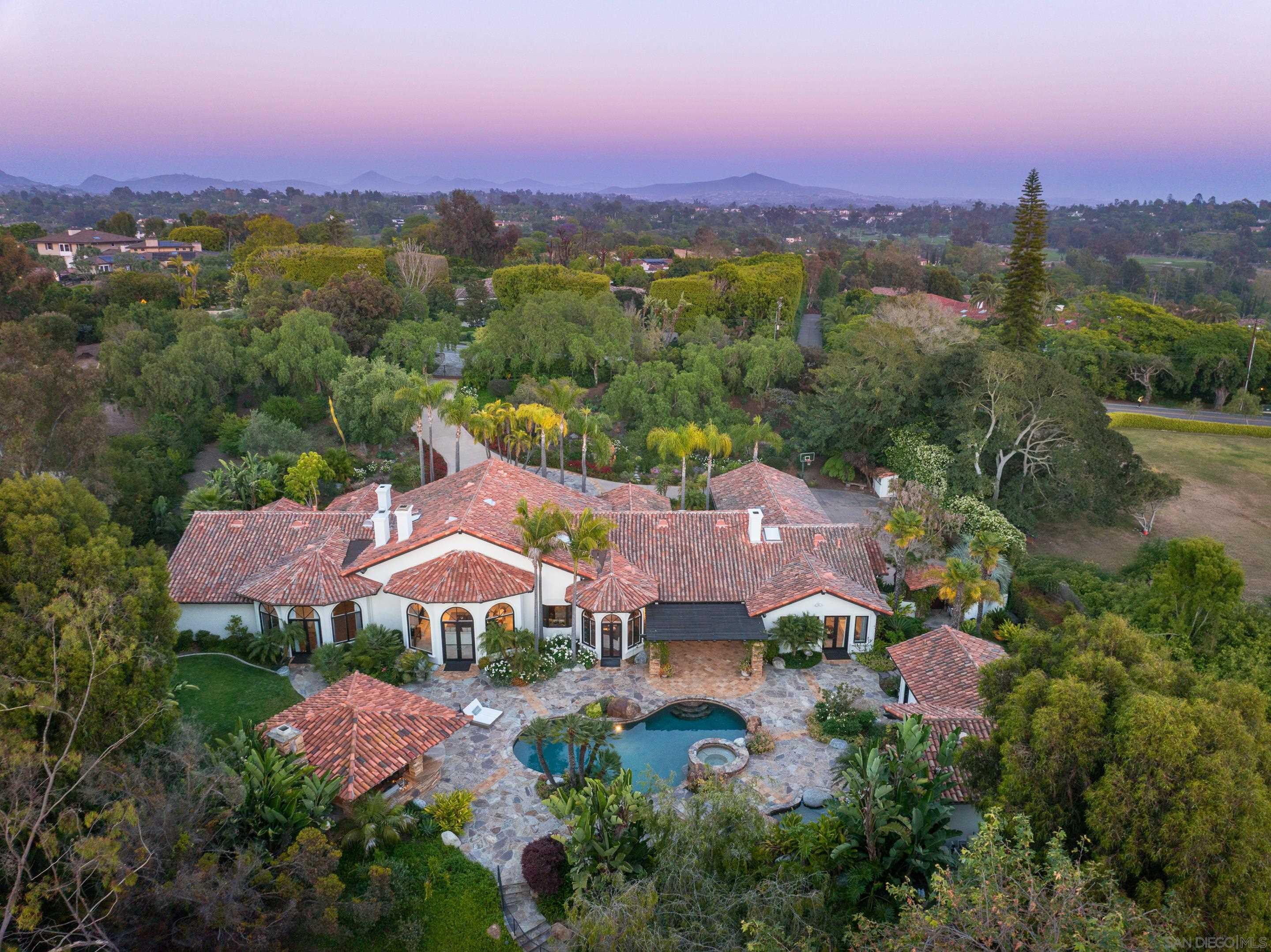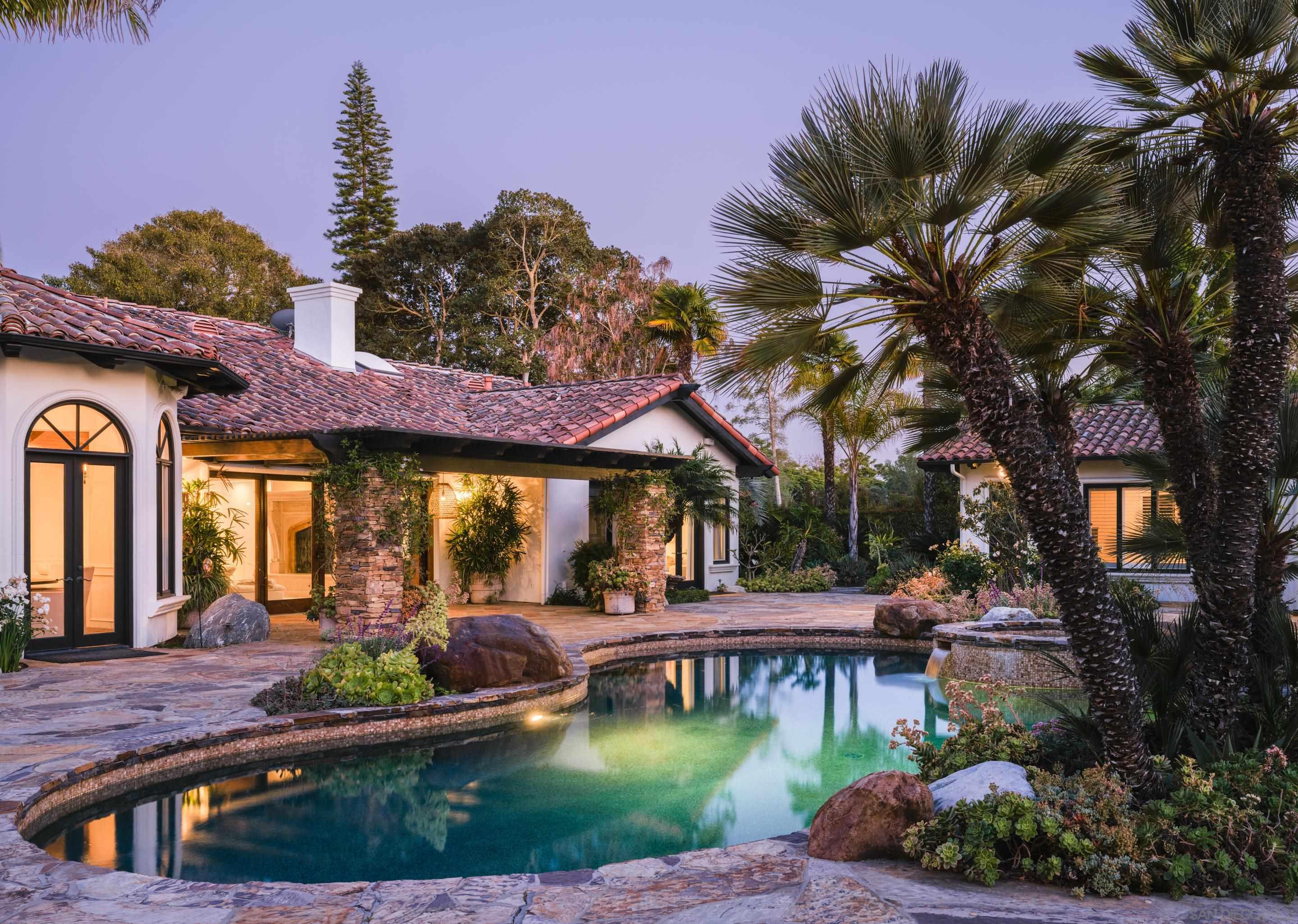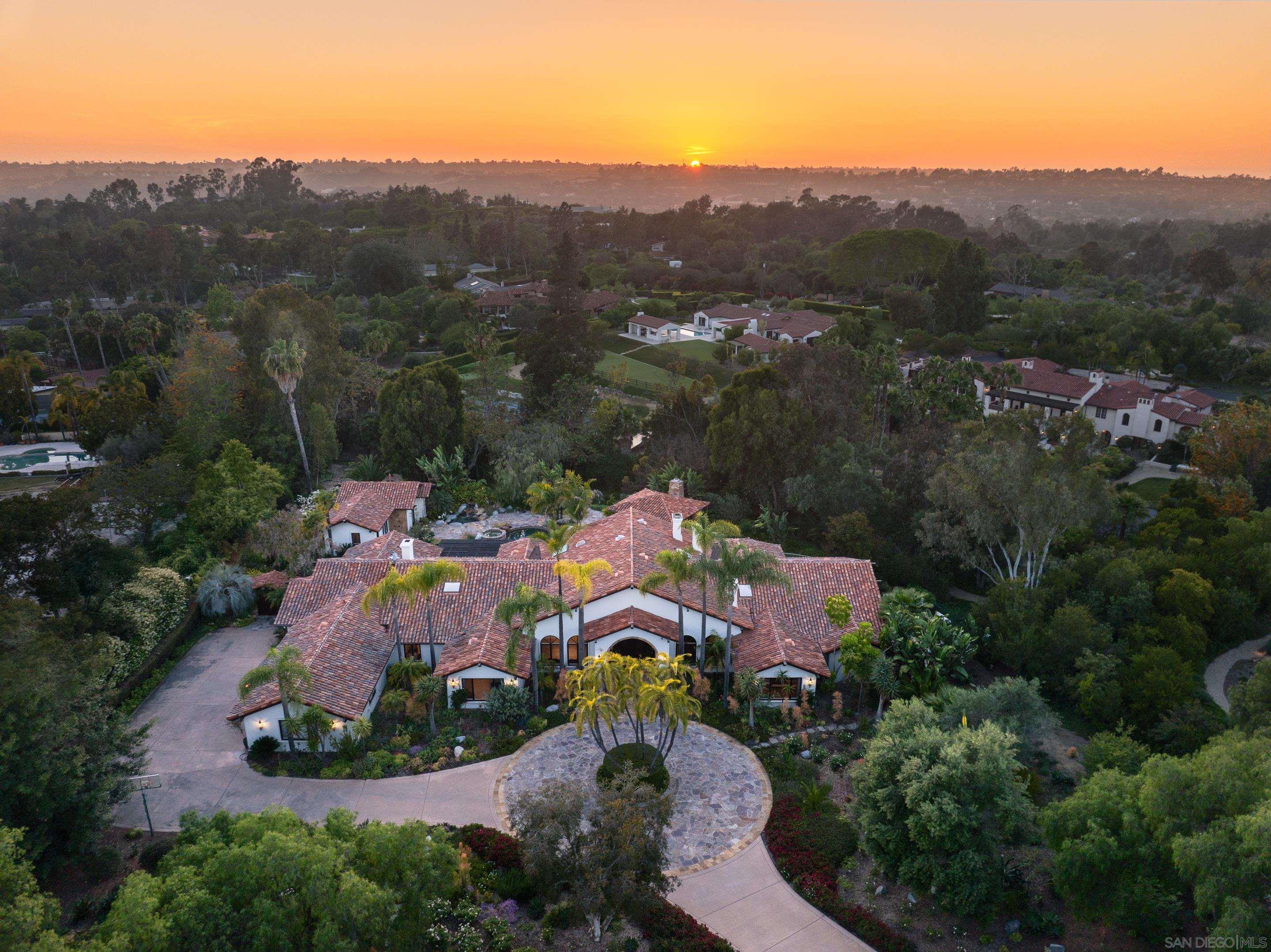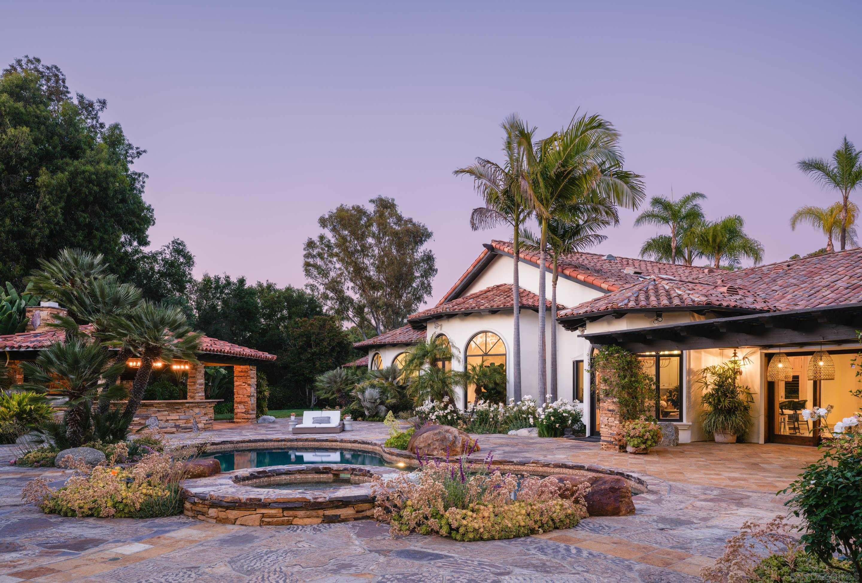 Nestled behind gates on one of the most sought-after streets in the prestigious West Covenant of Rancho Santa Fe, this reimagined single-level Modern Mediterranean estate offers timeless elegance with contemporary updates. Freshly painted inside and out, the home features new herringbone wood flooring, designer lighting, and refined touches throughout. The floor plan is thoughtfully designed, featuring a private primary suite, while a separate wing accommodates flexible secondary bedrooms ideal for family or guests. A dedicated office or library provides a quiet and functional work-from-home environment. Formal living and dining rooms create a refined ambiance, while the heart of the home lies in the open-concept family room that flows seamlessly outdoors and into a gourmet kitchen outfitted with high-end appliances, custom cabinetry, and an inviting eat-in breakfast nook. A fully detached guest house offers incredible functionality, making it ideal for visitors. The resort-style backyard is a private sanctuary, complete with a pool and spa, an outdoor shower, and an expansive covered veranda featuring a fireplace, BBQ, lounge seating area, and al fresco dining. Down below, discover a large grassy area ideal for children, pets, or even the addition of a pickleball court. Lush landscaping, a spacious motor court, and a four-car garage provide ample parking and storage for car collectors and entertainers alike.Interested in this Listing?