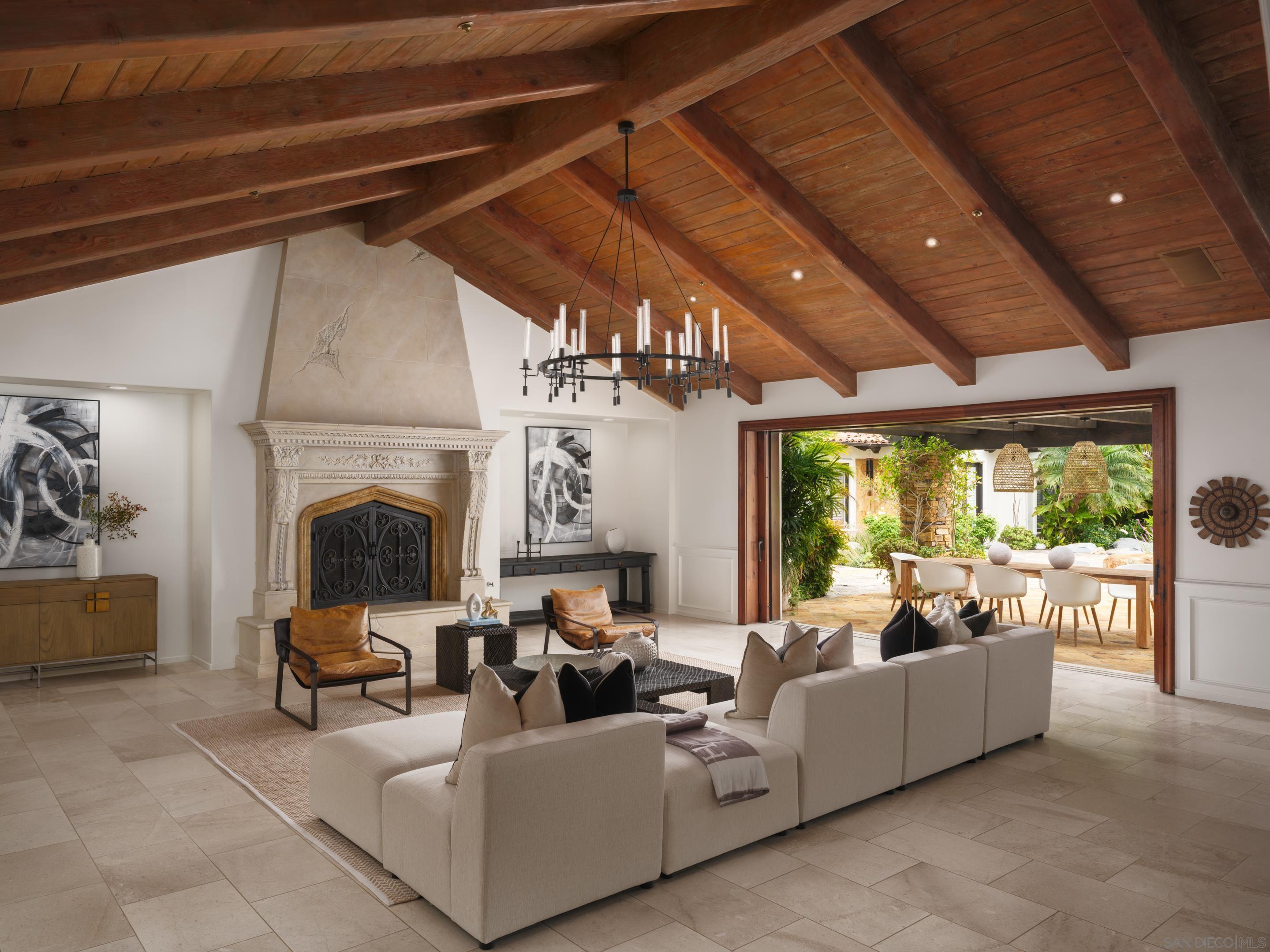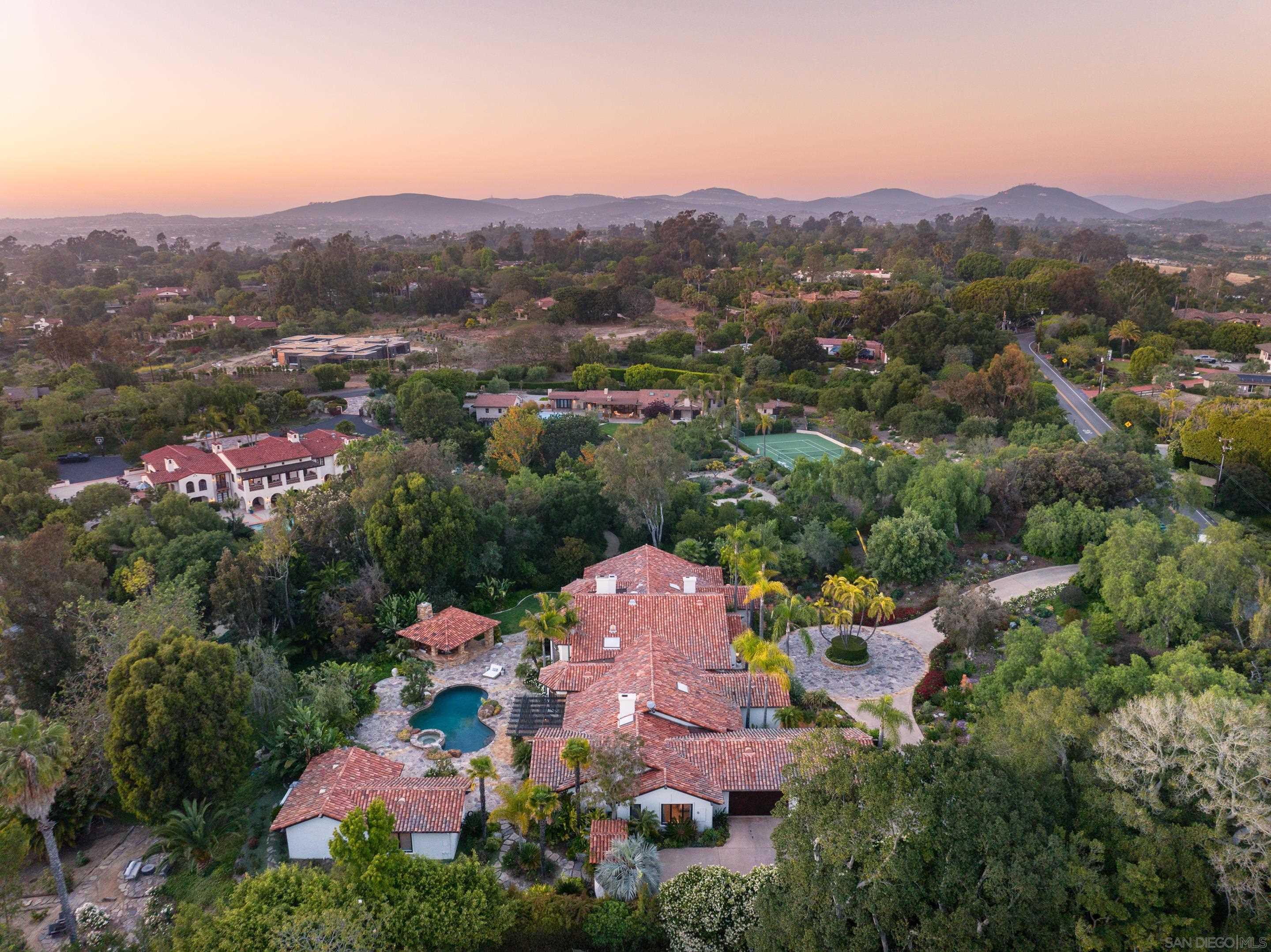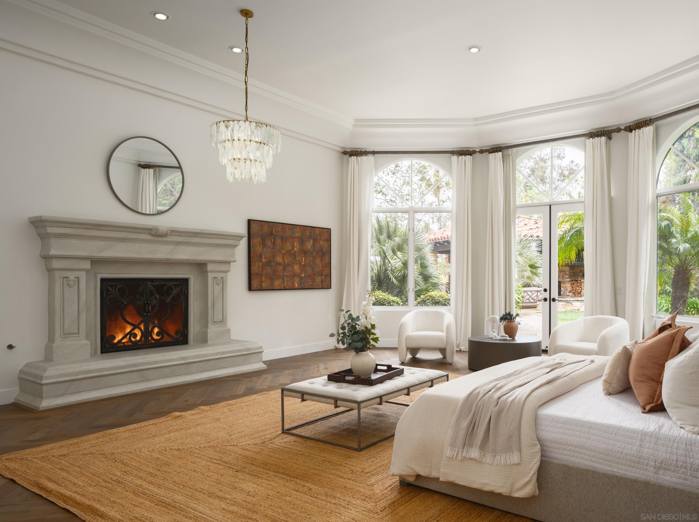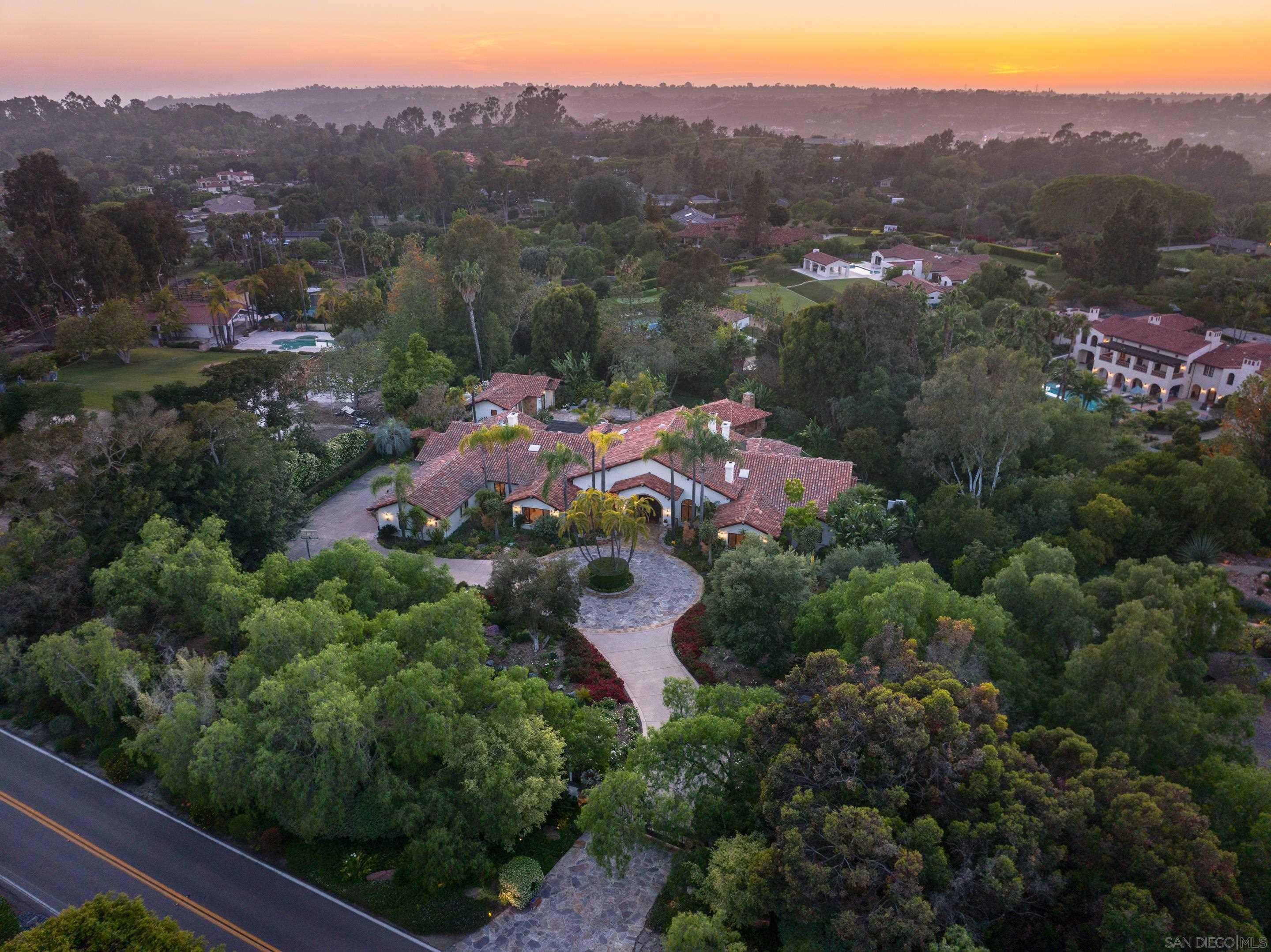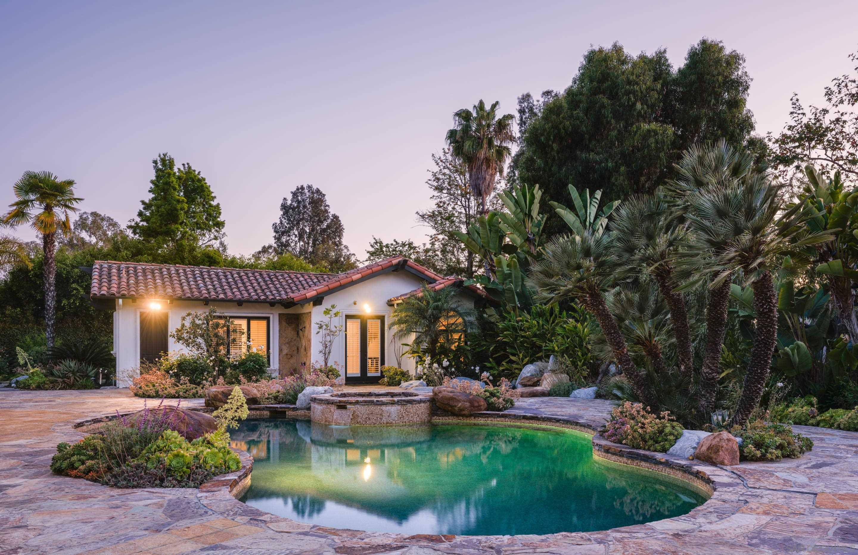 Nestled behind gates on one of the most sought-after streets in the prestigious West Covenant of Rancho Santa Fe, this reimagined single-level Modern Mediterranean estate offers timeless elegance with contemporary updates. Freshly painted inside and out, the home features new herringbone wood flooring, designer lighting, and refined touches throughout. The floor plan is thoughtfully designed, featuring a private primary suite, while a separate wing accommodates flexible secondary bedrooms ideal for family or guests. A dedicated office or library provides a quiet and functional work-from-home environment. Formal living and dining rooms create a refined ambiance, while the heart of the home lies in the open-concept family room that flows seamlessly outdoors and into a gourmet kitchen outfitted with high-end appliances, custom cabinetry, and an inviting eat-in breakfast nook. A fully detached guest house offers incredible functionality, making it ideal for visitors. The resort-style backyard is a private sanctuary, complete with a pool and spa, an outdoor shower, and an expansive covered veranda featuring a fireplace, BBQ, lounge seating area, and al fresco dining. Down below, discover a large grassy area ideal for children, pets, or even the addition of a pickleball court. Lush landscaping, a spacious motor court, and a four-car garage provide ample parking and storage for car collectors and entertainers alike.Interested in this Listing?
