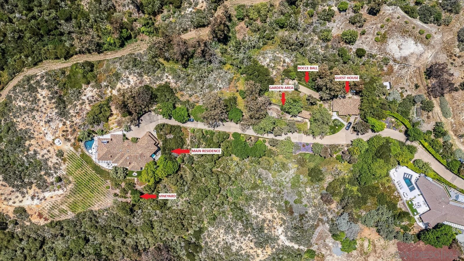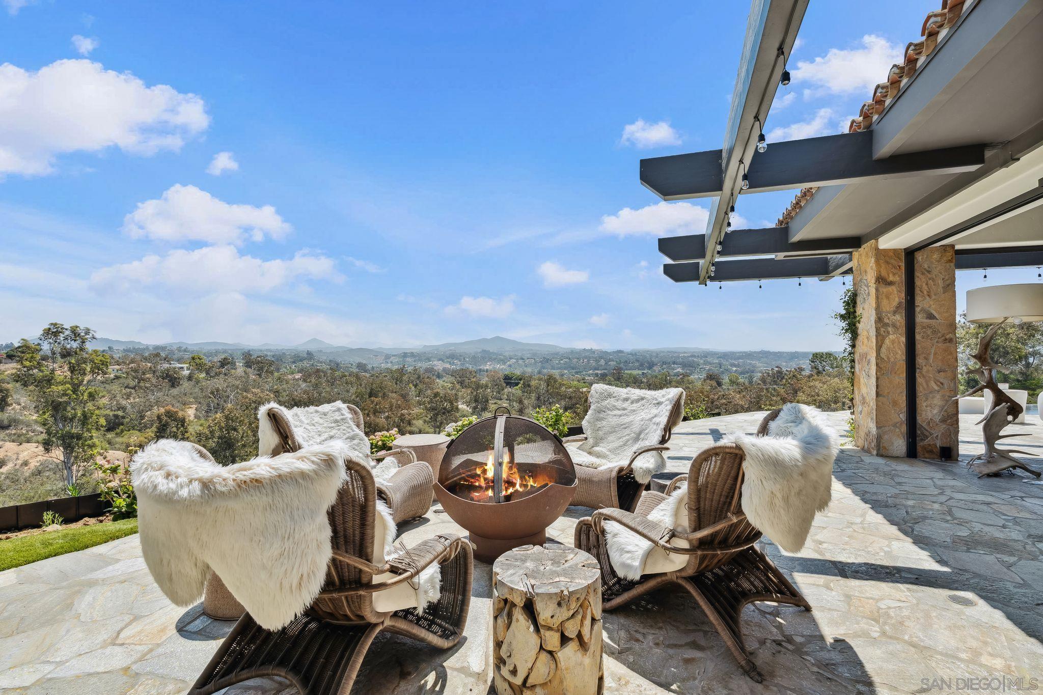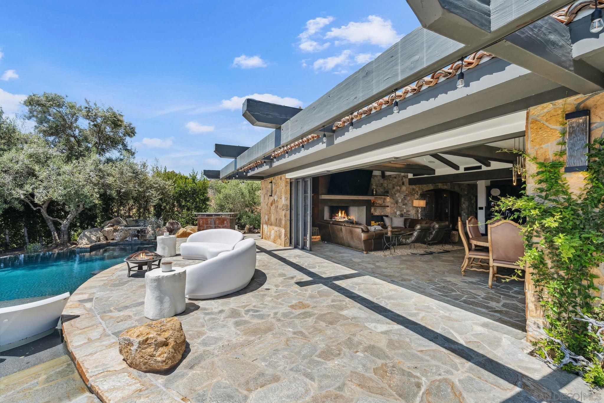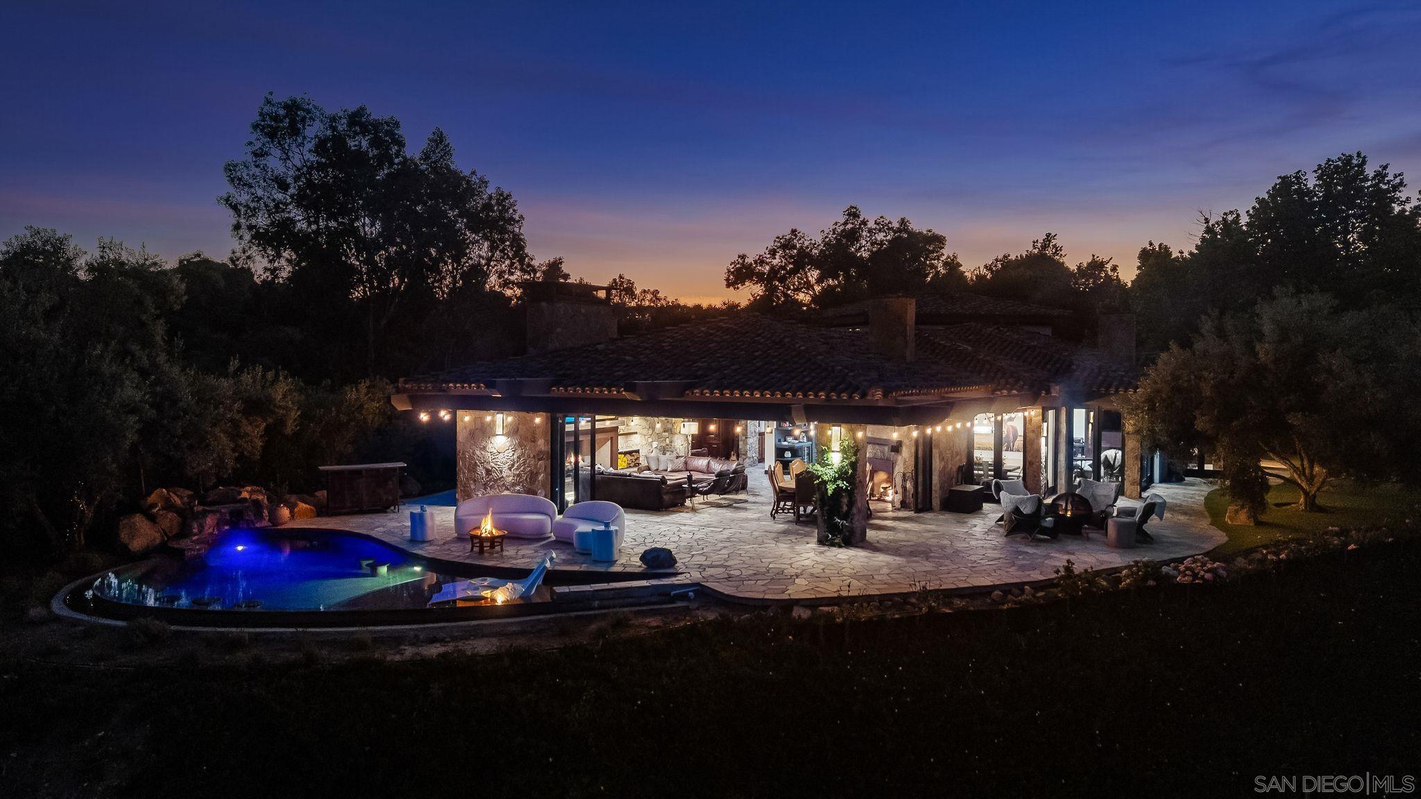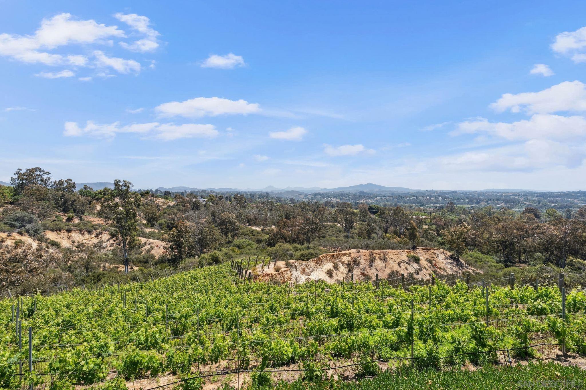 Inspired by the serene elegance of the Post Ranch Inn in Big Sur, this exceptional home has been thoughtfully reimagined to showcase breathtaking views and unparalleled privacy. Known as The Vineyard, the 5.75-acre estate includes 1,000 Cabernet grapevines, fruit trees, bee hives producing fresh honey, and olive trees ideal for pressing your own oil. Primarily single level, the residence sits at the end of a long gated driveway, set apart from the road and adjacent to the peaceful Ewing Preserve and scenic horse trails. Spanning approx. 4,400 sq ft, the main house features 3 bedrooms, 3.5 baths, and an extraordinary great room with disappearing doors that flow onto a wraparound patio and infinity-edge pool creating a flawless indoor-outdoor environment with endless views. The luxe, entry level primary retreat boasts an office and dual spa-inspired baths with walk-in closets, a steam shower connected to a dry sauna, and a glass door leading to a Jacuzzi. Five Corten steel fireplaces, beamed ceilings, and stone walls balance rustic warmth with modern refinement, while a smart home system integrates climate, lighting, sound, and security. The detached 840 sq ft casita offers two separate 1BR/1BA guest suites, one with a kitchenette, providing flexible accommodations. Nearby you will find a bocce court, raised garden beds, and a detached structure originally built as horse facilities with trail access. Its prime western Covenant locale affords amazing proximity to Rancho Santa Fe Village, the coast, and more. The perfect blend of tranquility, beauty and lifestyle awaits.Interested in this Listing?