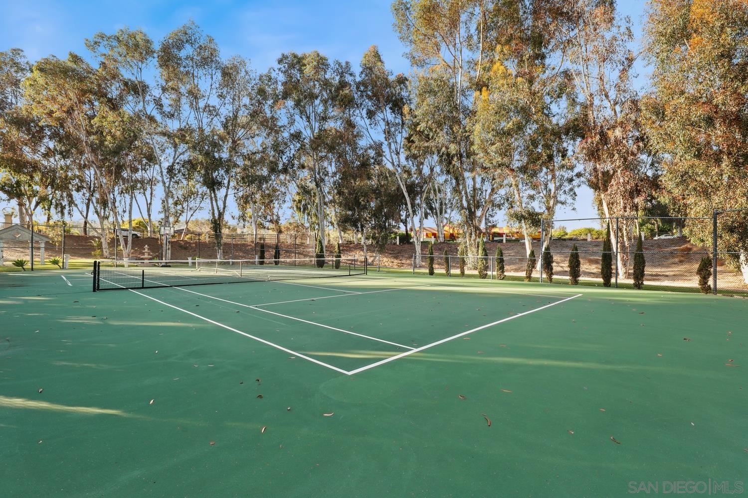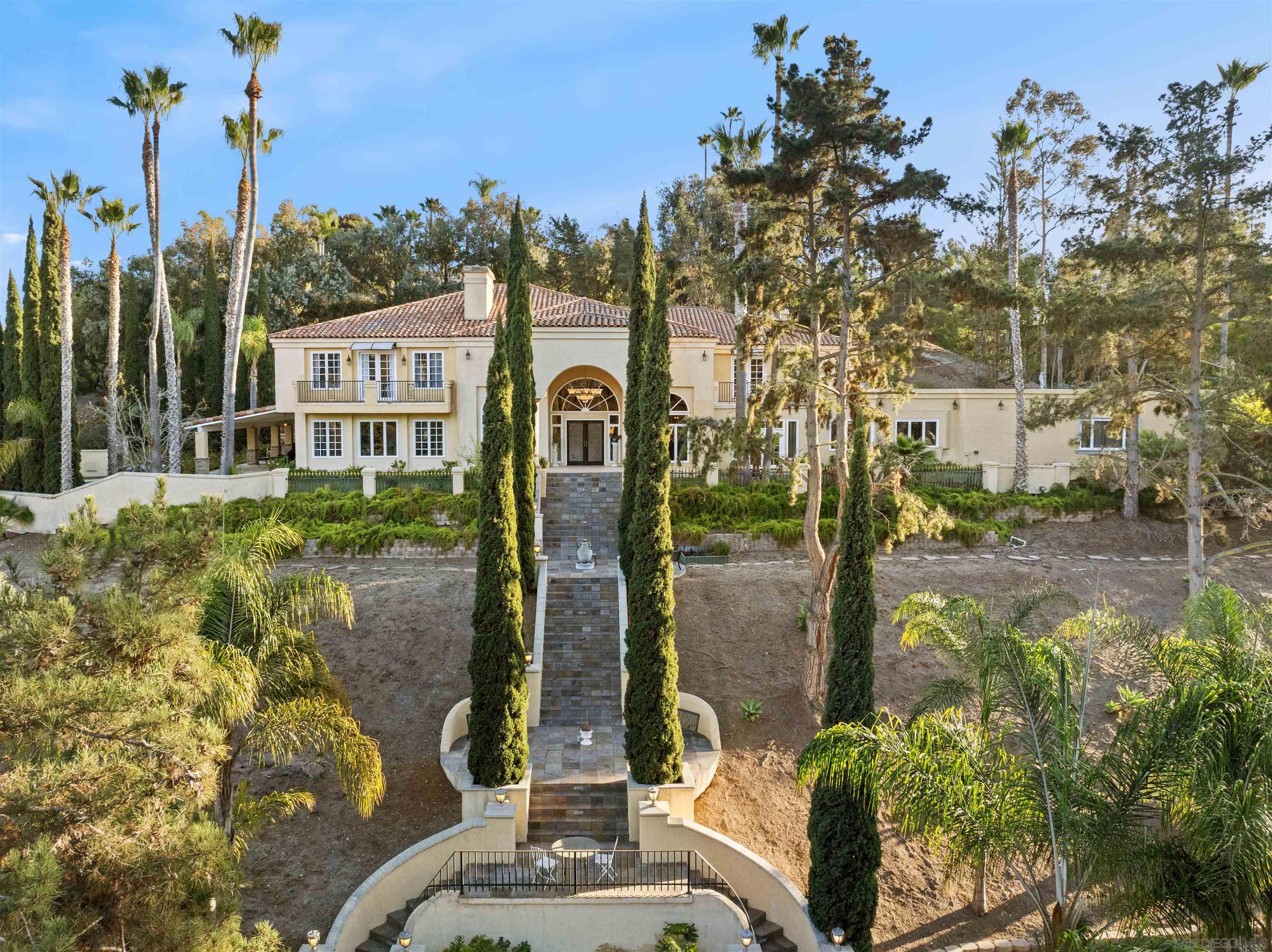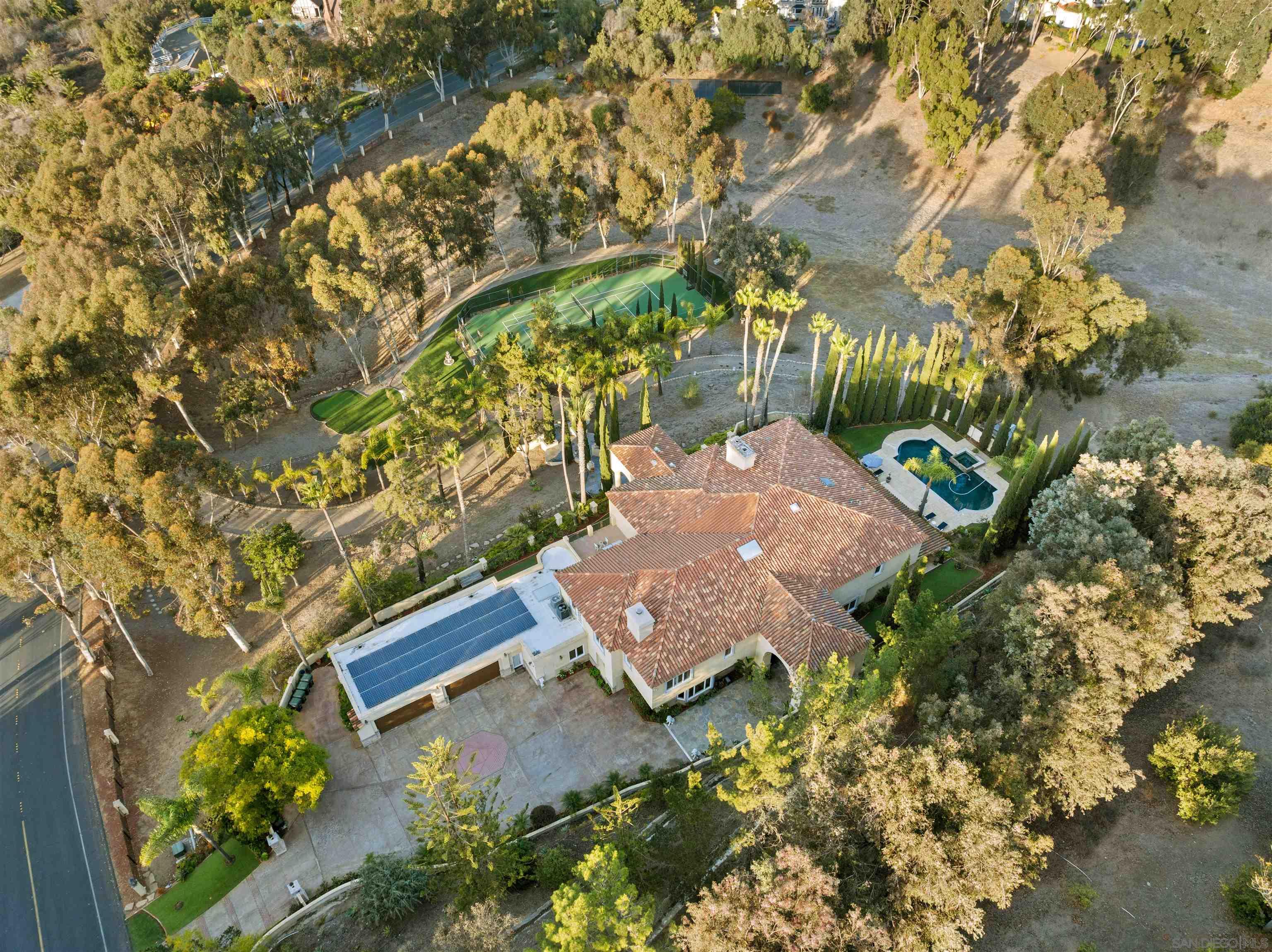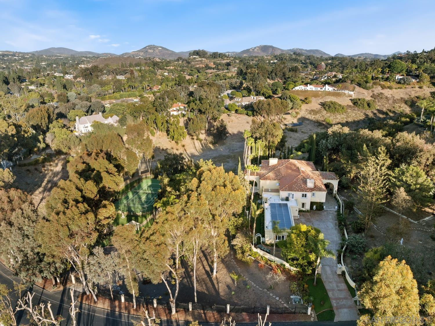 Welcome to your private sanctuary on the coveted West side of Rancho Santa Fe, where luxury and countryside charm blend seamlessly! Nestled on 3.5 private acres of meticulously landscaped grounds, this stunning estate reflects exceptional pride of ownership. Located in the exclusive South Pointe Farms gated community, the property offers unparalleled privacy, abundant natural light, and breathtaking panoramic views from every vantage point. The home features soaring 28-foot ceilings, an in-home elevator, and 48 solar panels among many other upgrades. The attached in-law or nanny suite provides a versatile living space ideal for multigenerational living, or hosting friends and family. Resort-style amenities include a pool & spa for relaxing or entertaining, a covered outdoor living area, and your own private tennis court that could double as a pickleball court. Enjoy the tranquility of nature with walking trails winding through the lush, private property. With these remarkable amenities, this estate embodies gracious living at its finest. Situated just minutes from the sandy shores of nearby beaches, it provides the perfect balance of convenience and serene rural California living.