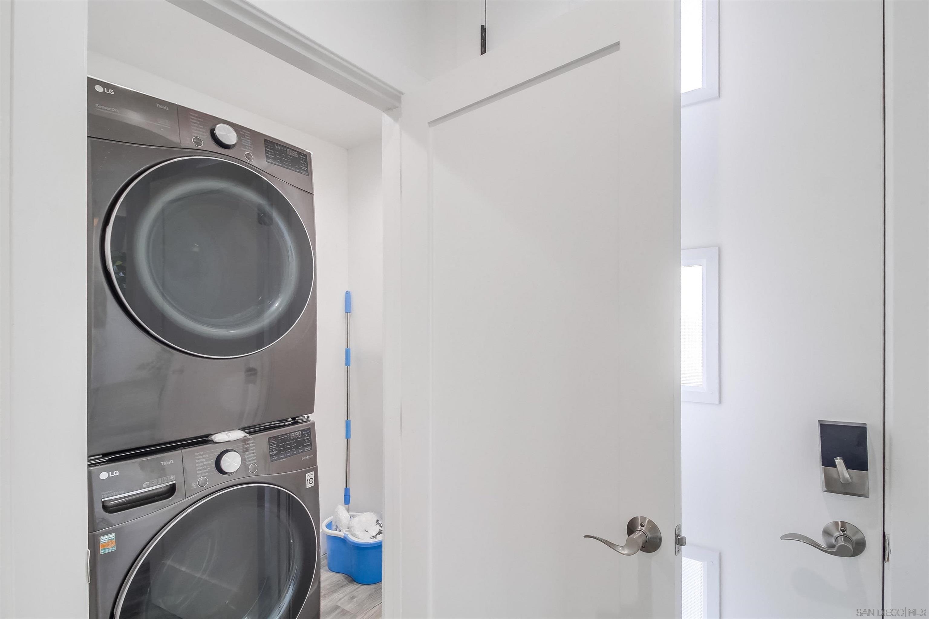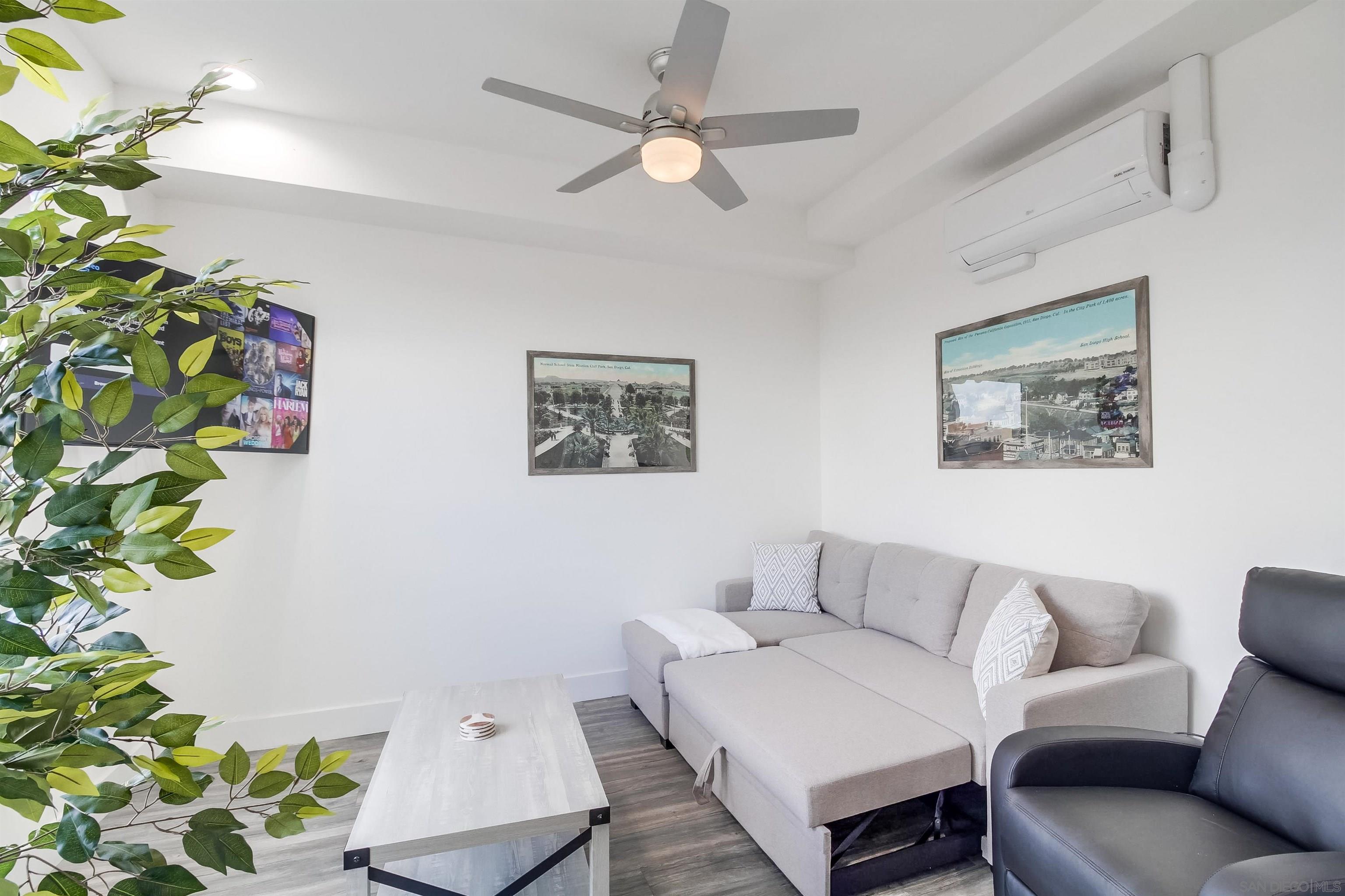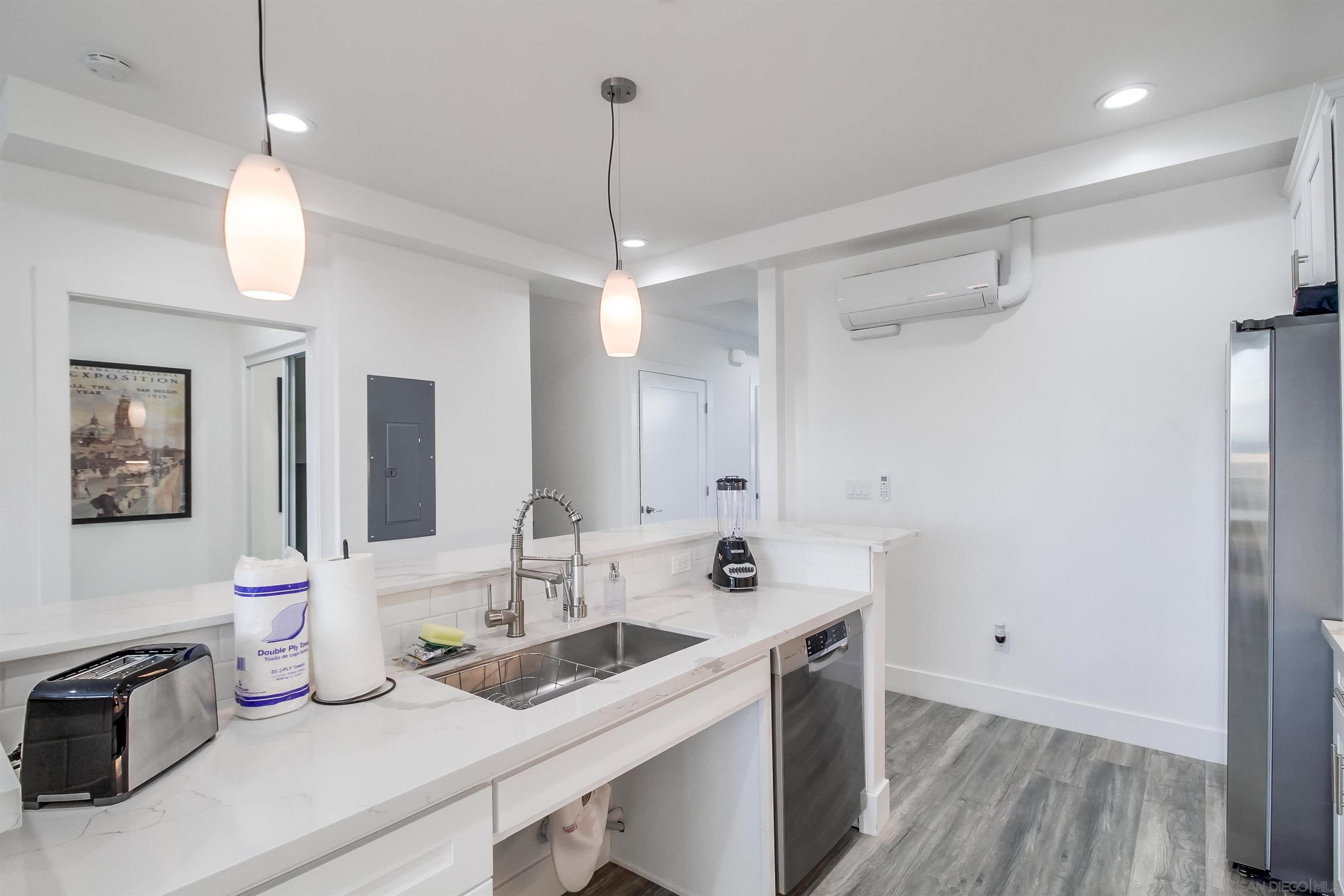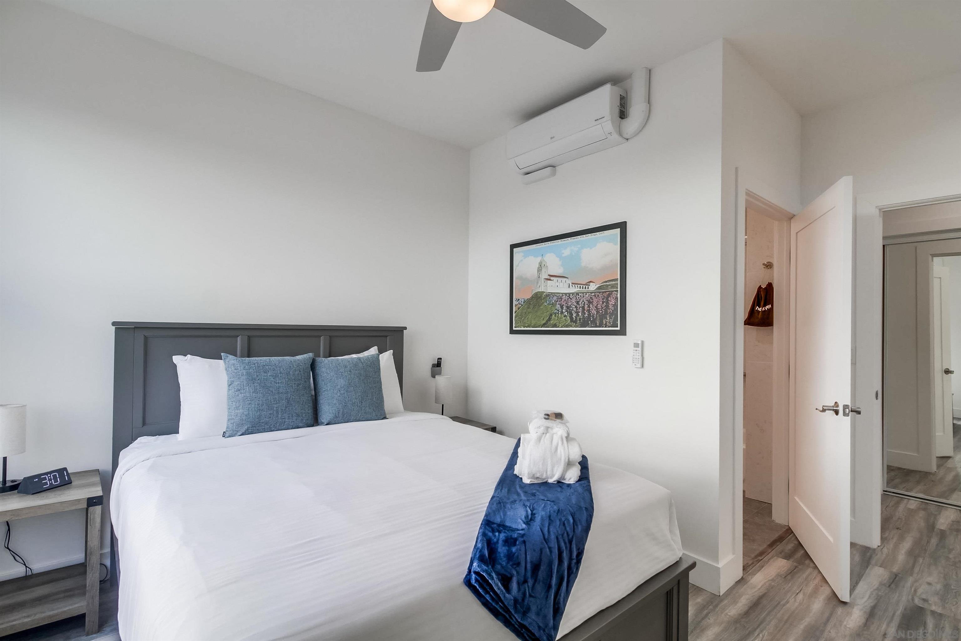 Move in ready 2 bedroom featuring a bright and spacious atmosphere, open-layout, 10-foot ceilings, luxury vinyl plank flooring, central air and heat mini-splits, full-size washer and dryer side by side with well-equipped kitchen, complete with stainless steel appliances, including a dishwasher and a smart Samsung refrigerator. Floor-to-ceiling sliding glass door leading to a private balcony.