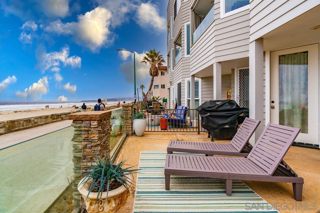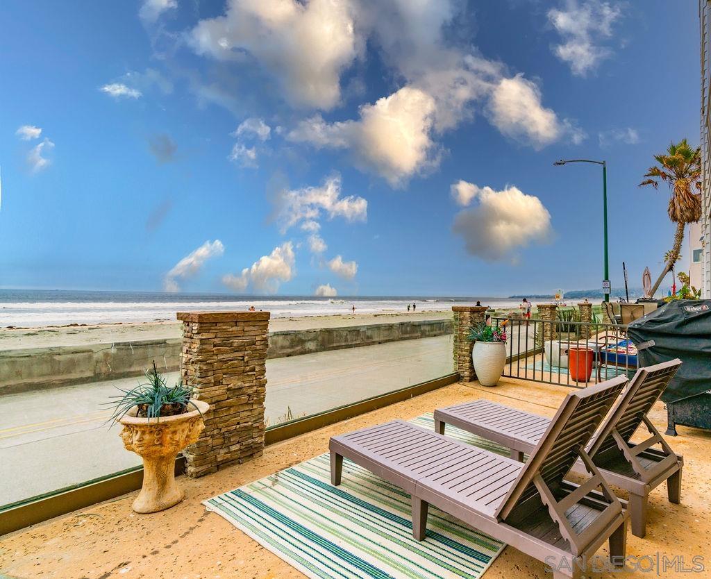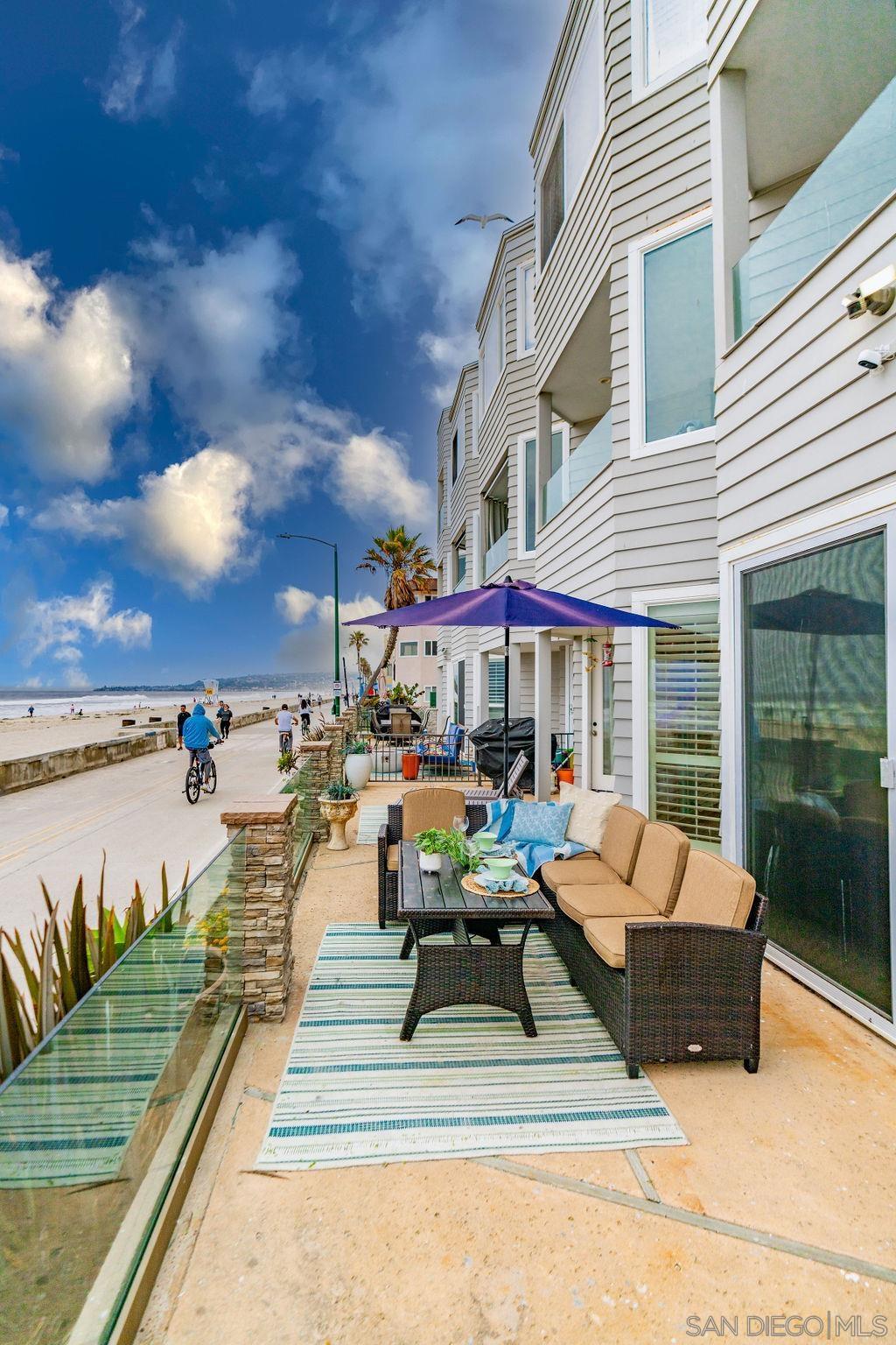 Welcome to this quaint and delightful 2-bedroom, 2-bath oceanfront townhome located right on the famous Mission Beach boardwalk, where you are just steps away from the sand! This beach abode boasts a lovely large patio situated right on the boardwalk, perfect for people-watching and ocean-gazing due to its incomparable location. The outdoor space features ample outdoor seating, an umbrella for shade, and a small table ideal for casual sunset dining. There is also a BBQ grill and lounge chairs for your enjoyment. Inside, the living room offers a comfy sectional couch, a ceiling fan, a flatscreen TV, plus a sliding glass door that opens up to the beachfront patio, blending indoor comfort with outdoor beauty. The updated kitchen is equipped with stainless steel appliances, bar seating for two, and a bistro table for two, making it a seamless space for cooking and dining. The first bedroom features a king bed, a flatscreen TV, and ample closet space. The second bedroom has a queen bed, a flatscreen TV, and a ceiling fan to ensure a comfortable stay. Additional amenities include a stacked washer/dryer for your convenience and parking options with one space in the garage (small car) plus one tandem parking spot in the driveway. Experience the best of Mission Beach living in this oceanfront gem!