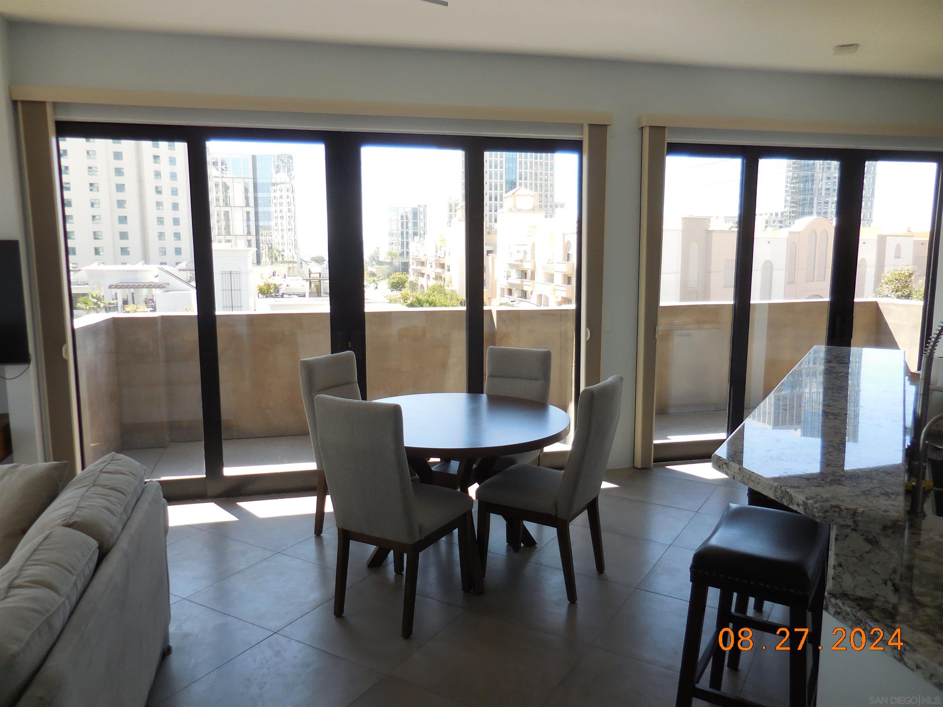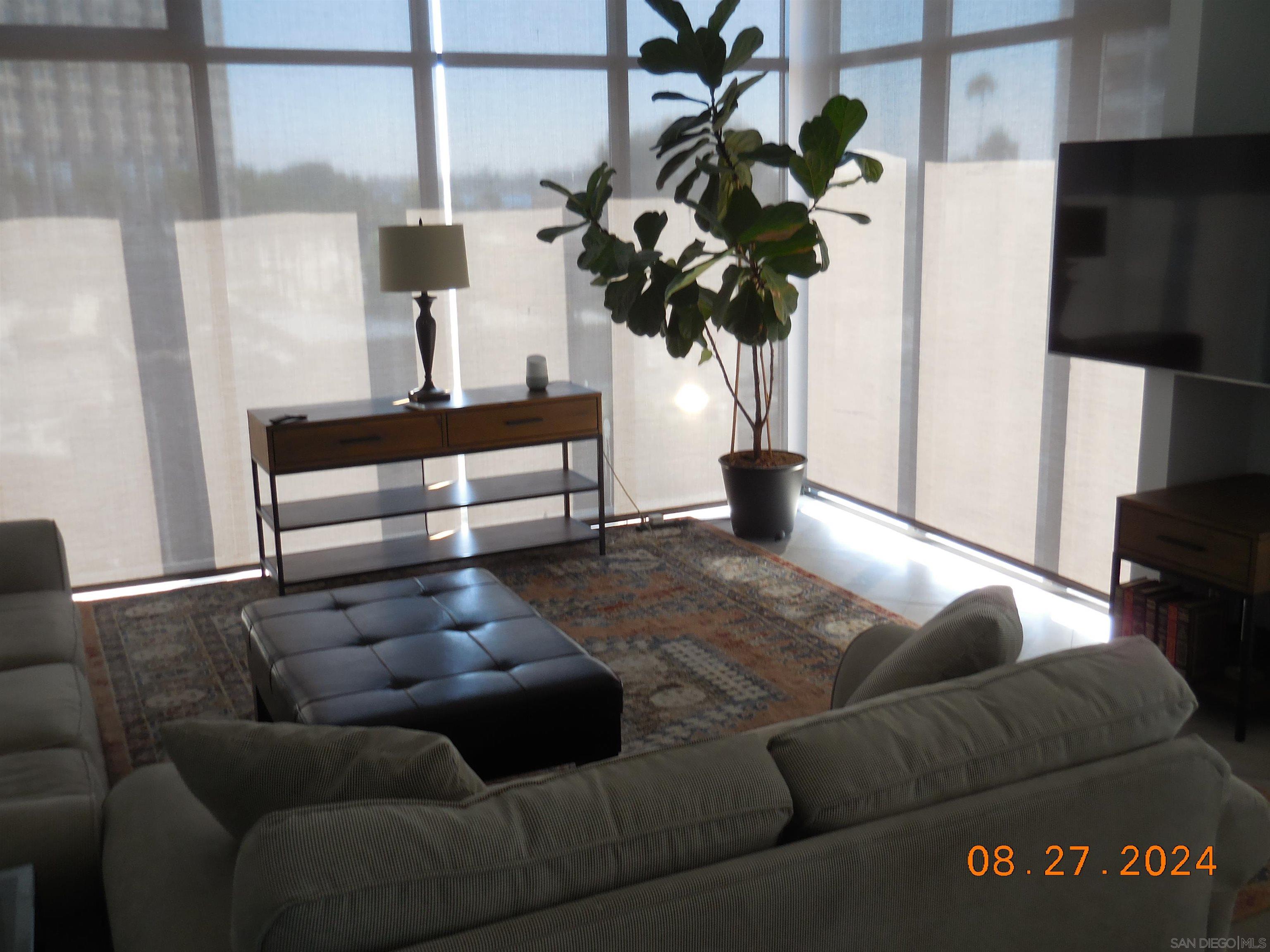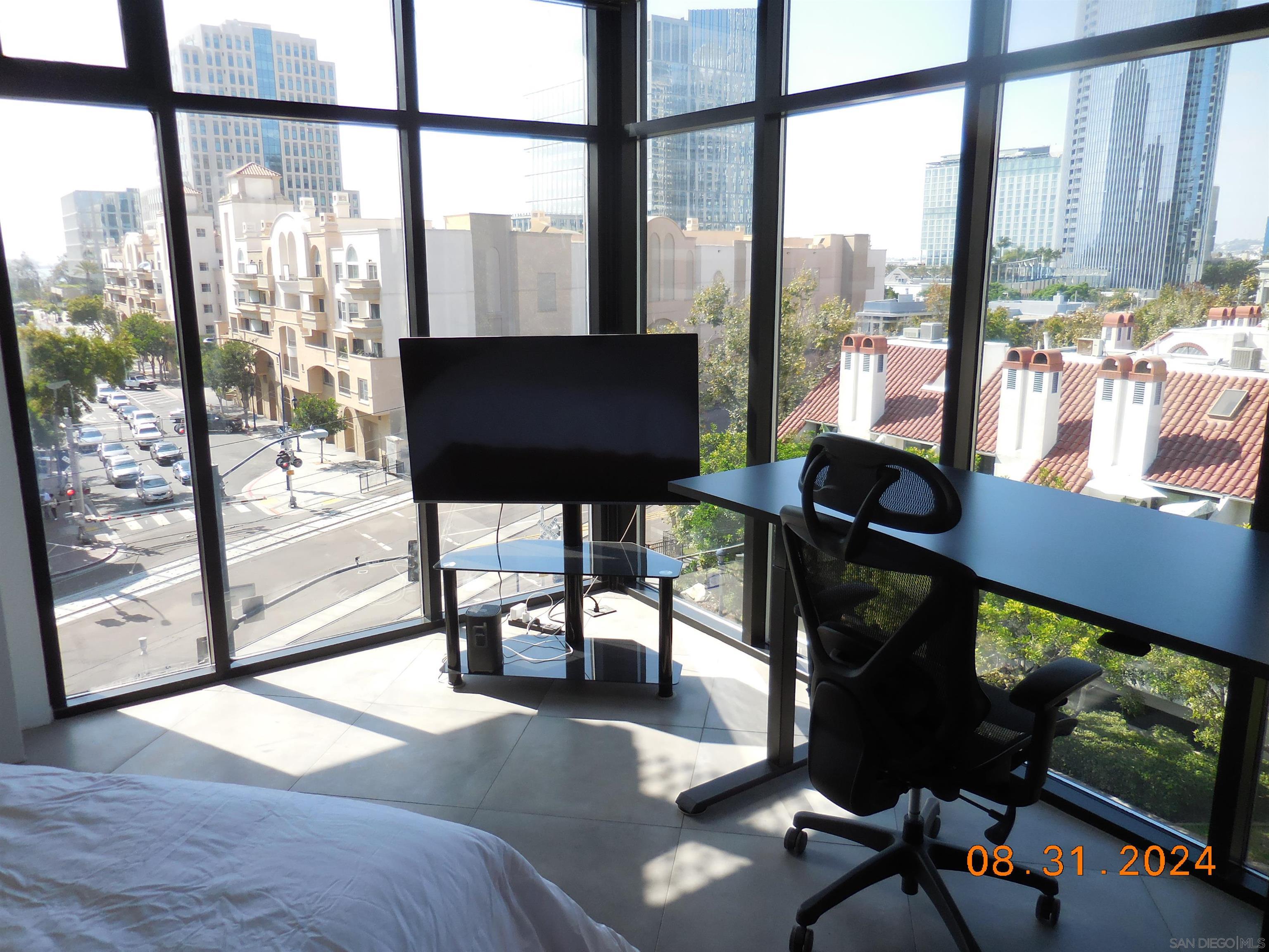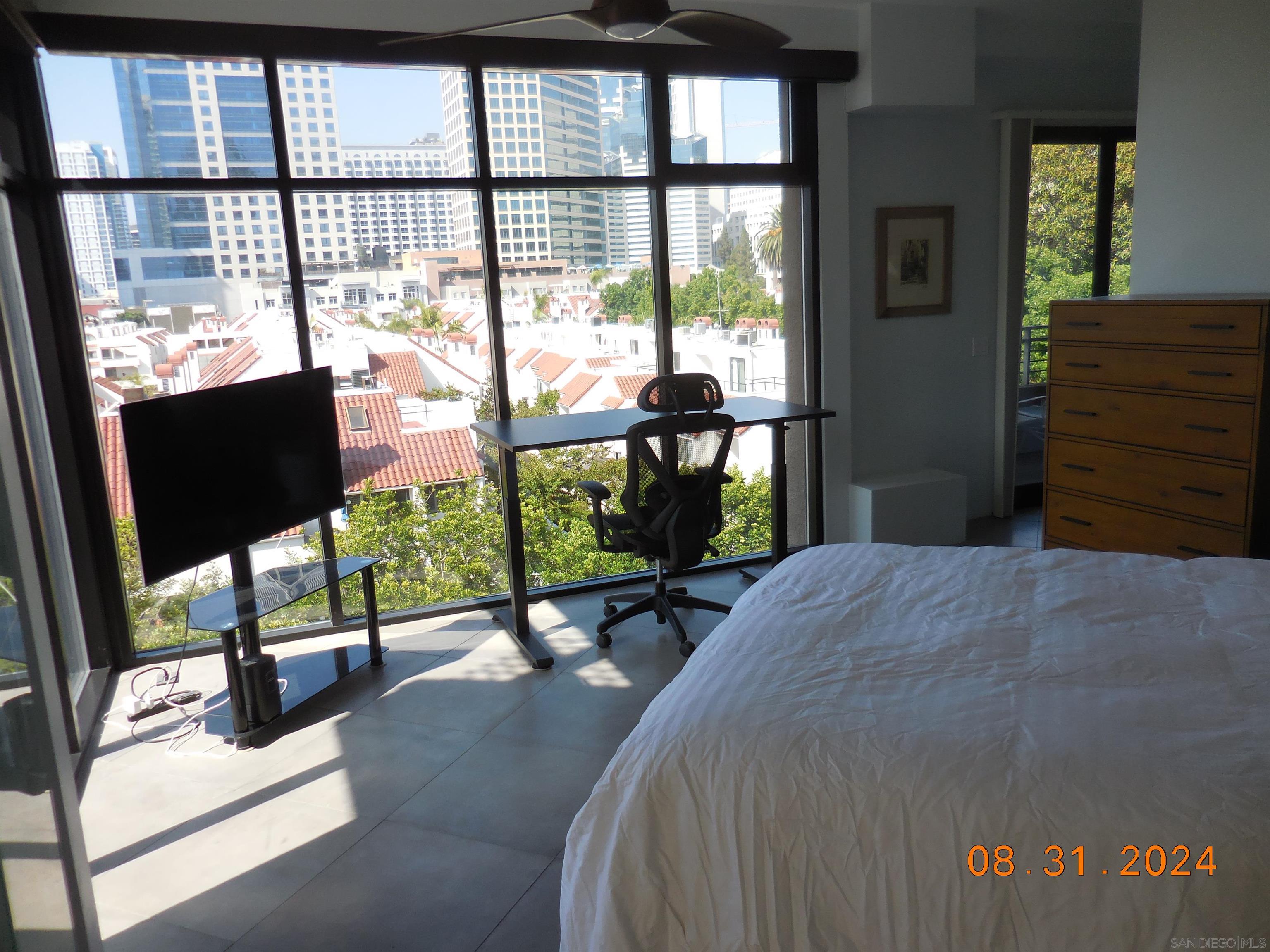 Furnished one of a kind unique loft space with windows on 3 sides (like living in a glass house but with privacy). Corner condo with views to North, West and South with amazing outlooks to the City. 3 decks (one on each side). Ceiling heights 9'6". Very livable space with little wasted space. Flooring is 24" concrete tiles. Kitchen with Thermador 6 burner gas stove, refrigerator, dishwasher, microwave and pantry. Primary bath has oversized shower which overlooks North deck. 2nd bath with corner shower (no tub). Stack W/D. 2nd bedroom has deck overlooking Hyatt. Primary bedroom is on the West and North side (no door to this BR, 3' opening). Primary closet is very large with many built-ins. Fully furnished with sofas, dining table, bar seats, 2 tv's, 2 queen size beds, stand up desk, linens and kitchen ware. You Tube TV, internet and water provided by owner. Tenant pays Electricity. 2 car side by side parking.