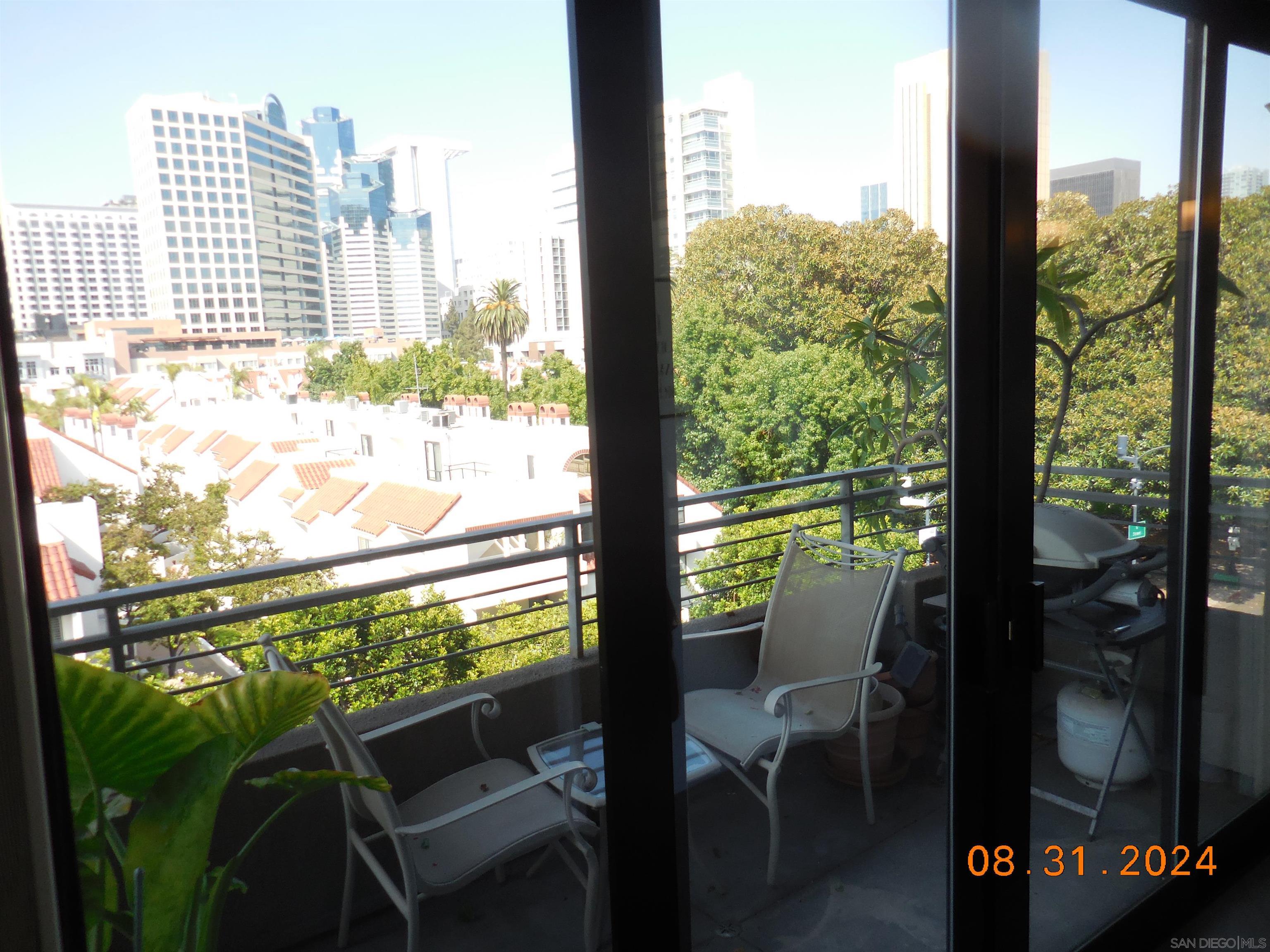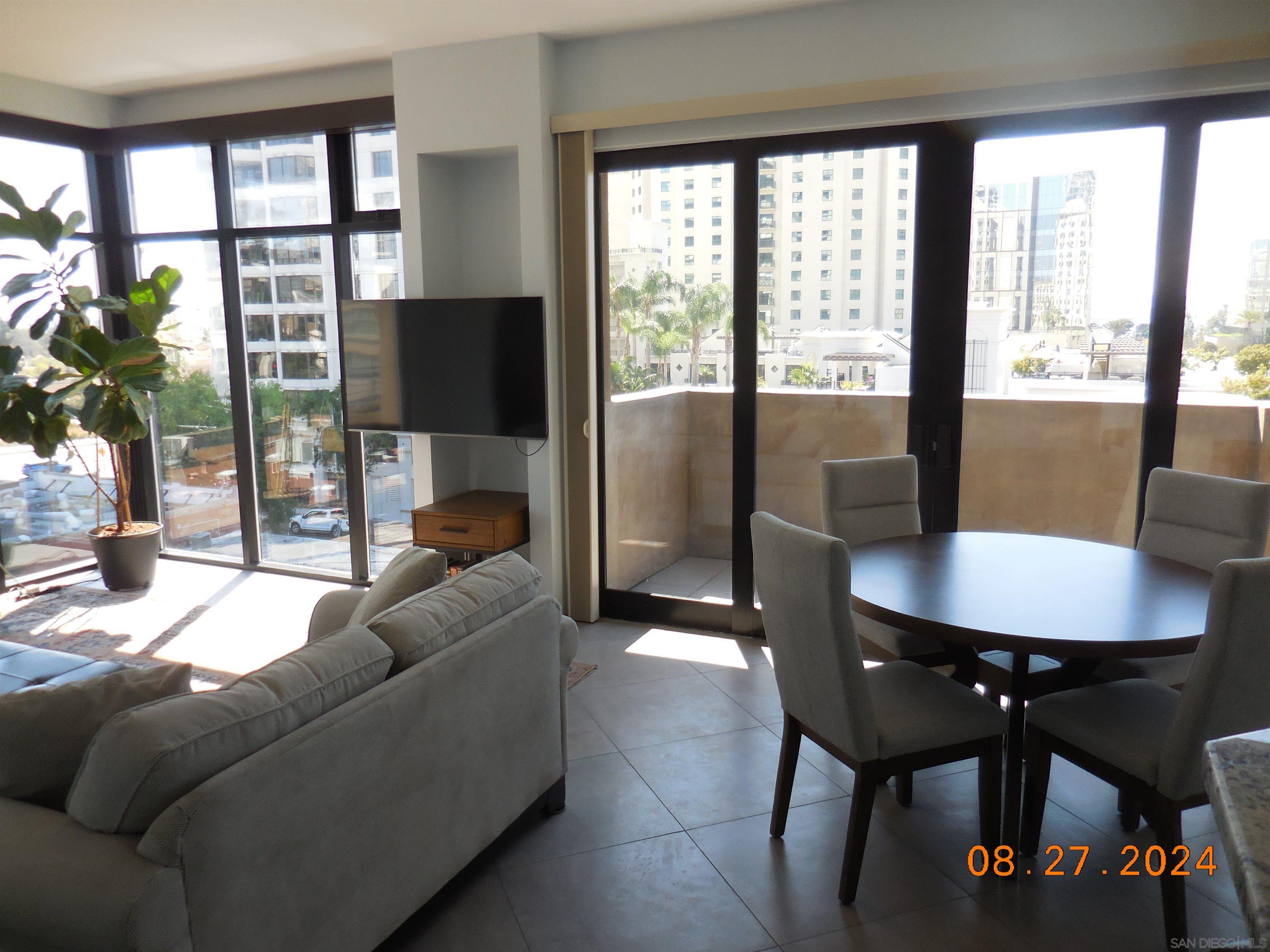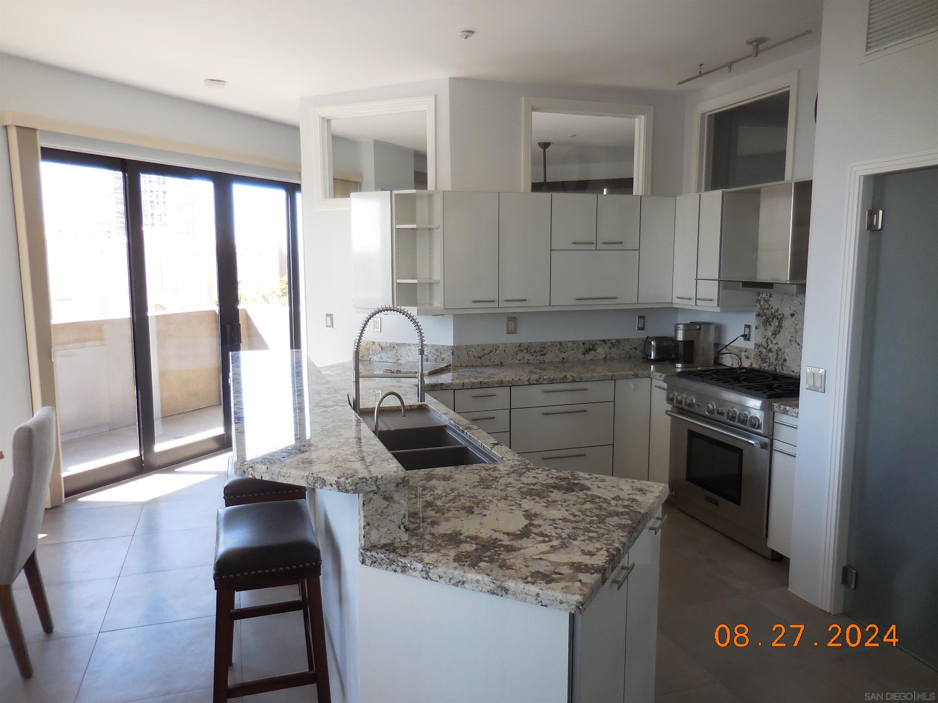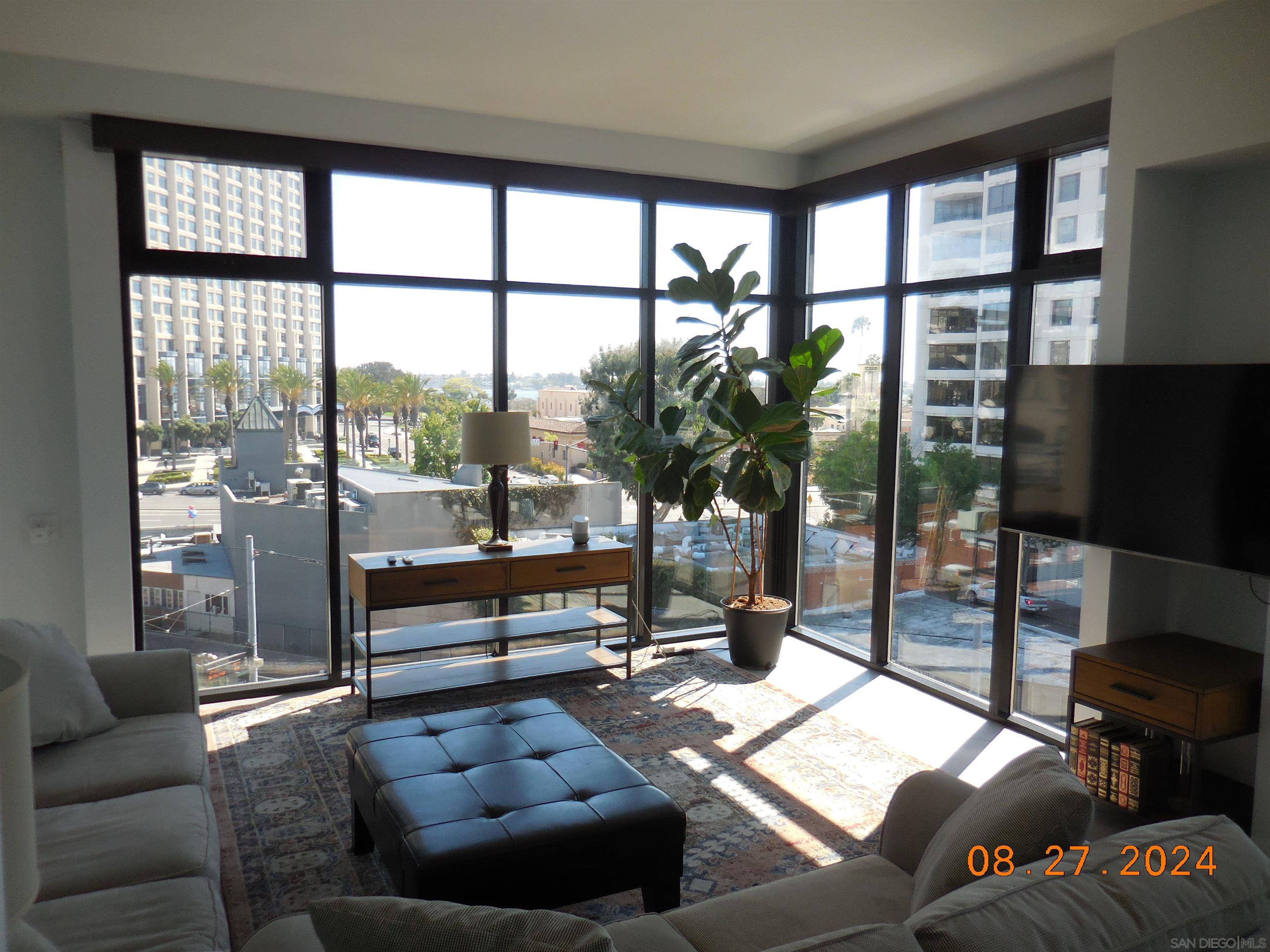 Furnished one of a kind unique loft space with windows on 3 sides (like living in a glass house but with privacy). Corner condo with views to North, West and South with amazing outlooks to the City. 3 decks (one on each side). Ceiling heights 9'6". Very livable space with little wasted space. Flooring is 24" concrete tiles. Kitchen with Thermador 6 burner gas stove, refrigerator, dishwasher, microwave and pantry. Primary bath has oversized shower which overlooks North deck. 2nd bath with corner shower (no tub). Stack W/D. 2nd bedroom has deck overlooking Hyatt. Primary bedroom is on the West and North side (no door to this BR, 3' opening). Primary closet is very large with many built-ins. Fully furnished with sofas, dining table, bar seats, 2 tv's, 2 queen size beds, stand up desk, linens and kitchen ware. You Tube TV, internet and water provided by owner. Tenant pays Electricity. 2 car side by side parking.