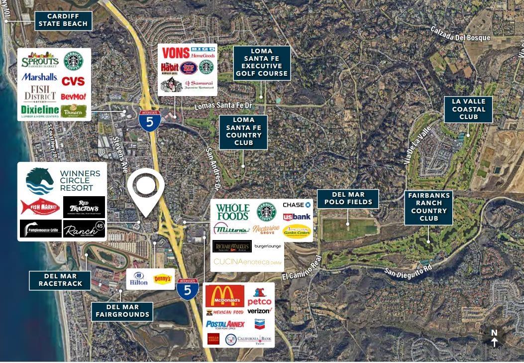 Driveway off of Via De La Valle above Highland Dr. Gated community with code required for access. |
