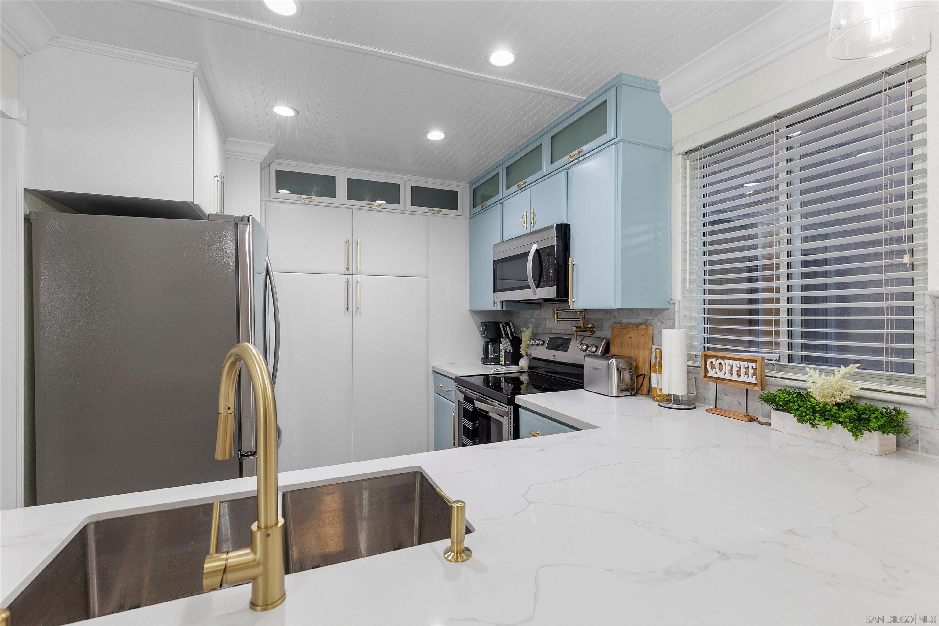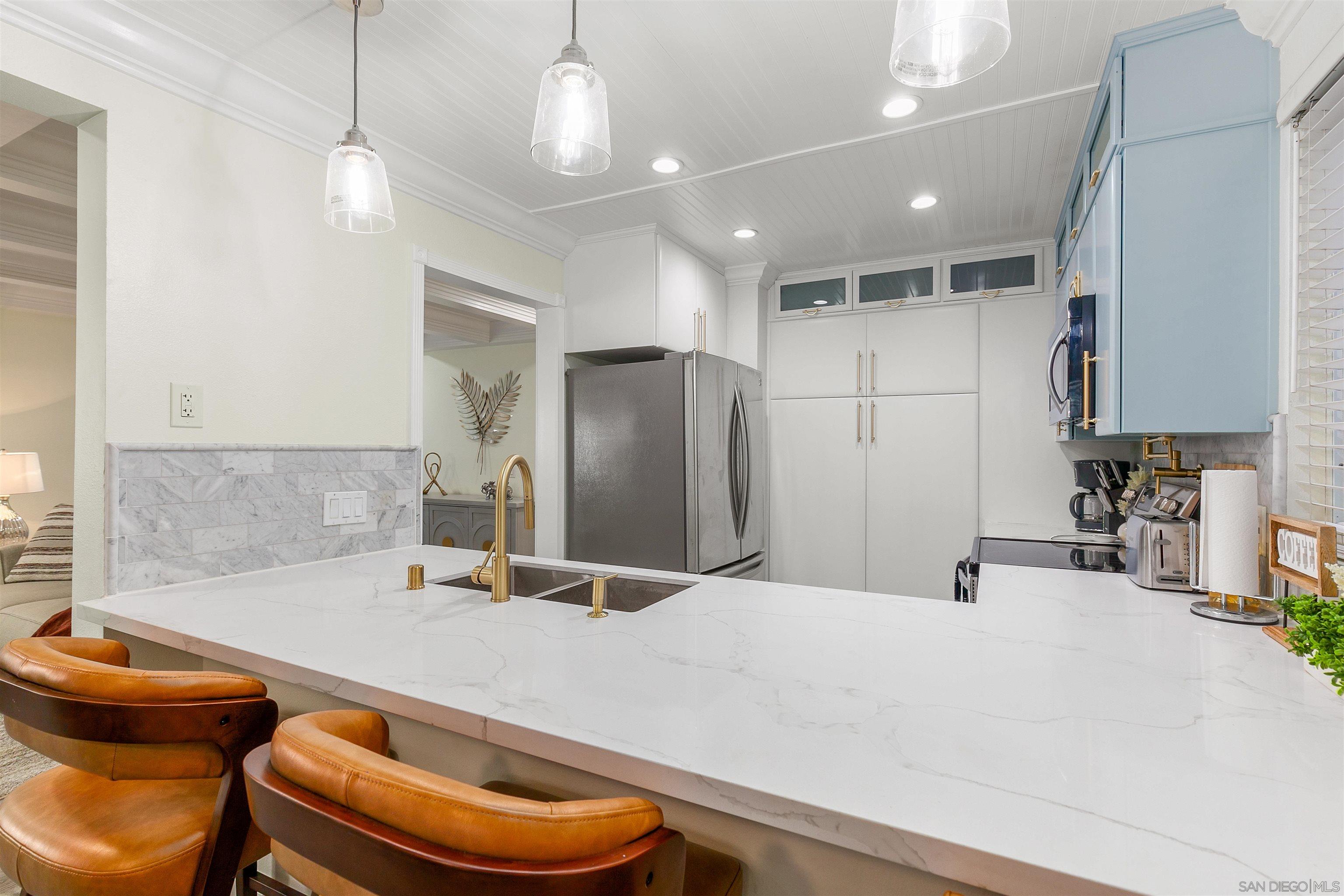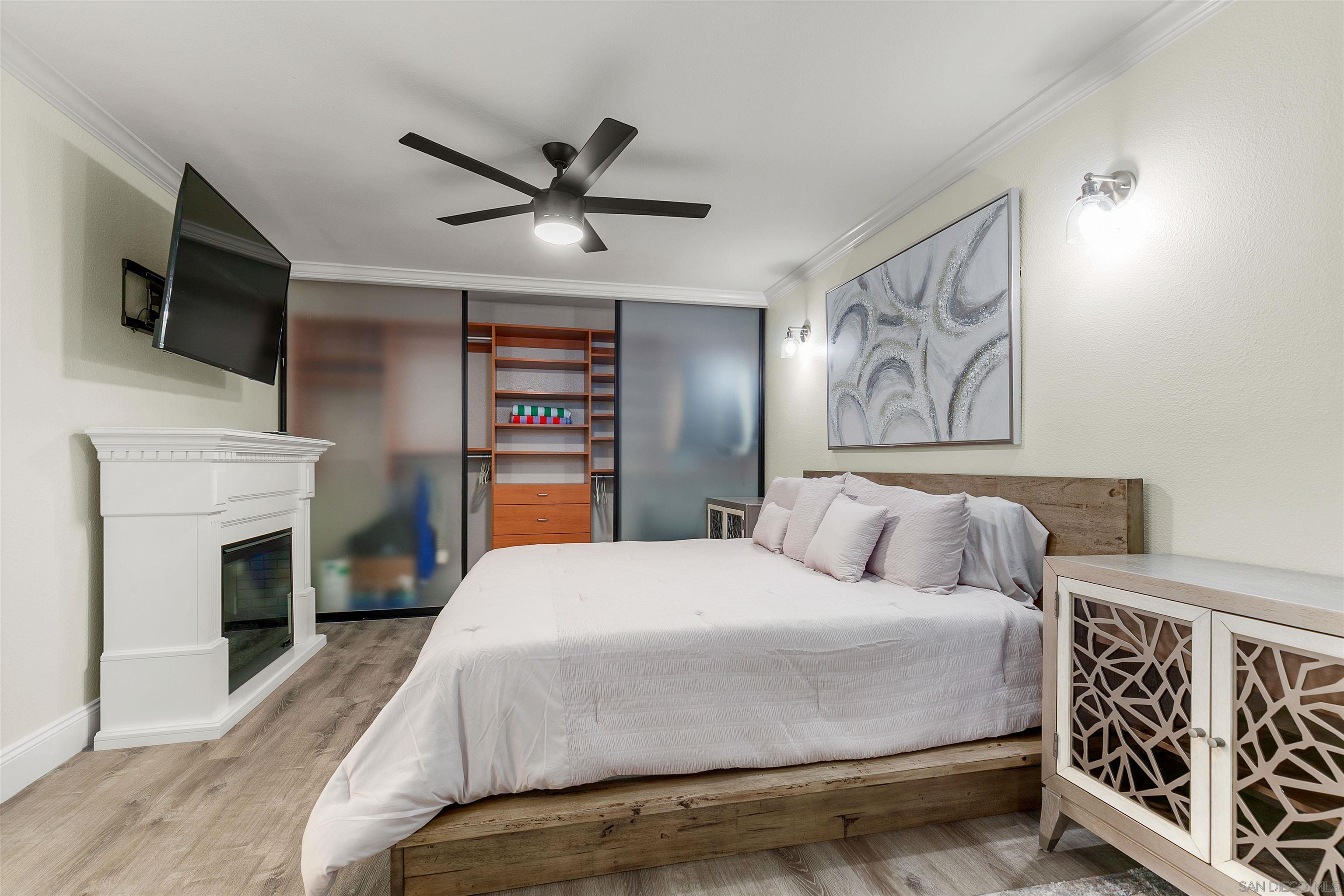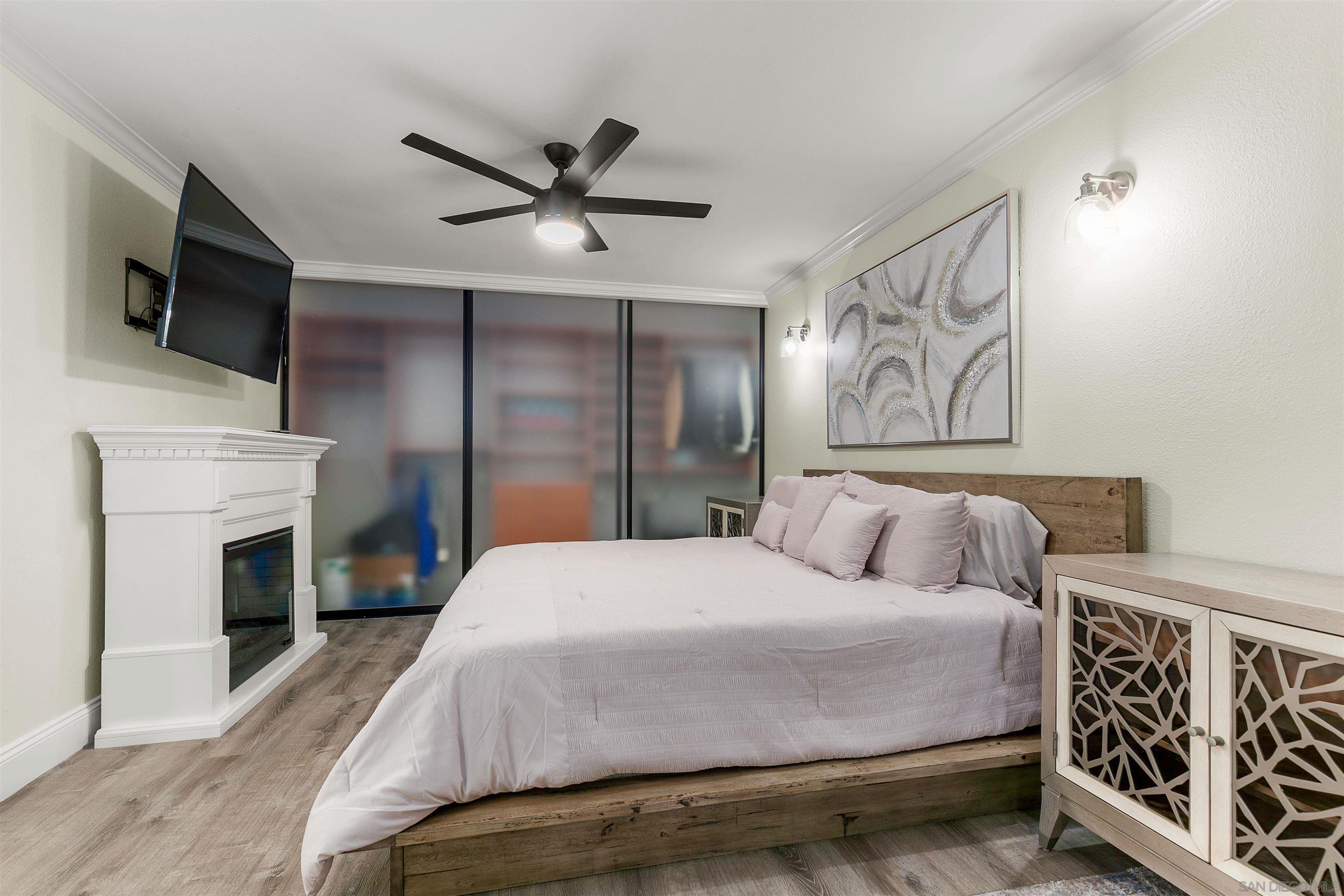 COME ENJOY the luxury of The Villas at Lomas Santa Fe! Located just minutes from the beach, and newly renovated just for you, including CENTRAL AIR (mini-split system) for your comfort and a wood burning fireplace for ambience! The unit has been outfitted well, complete with a fully stocked kitchen, richly appointed w/ gorgeous coffered ceilings, crown molding, wainscoting, and new LED canned lighting! Your kitchen comes complete w/new quartz counters & room for 3 at the bar, a pot filler, lots of cabinets and storage, and all kitchen pots and utensils to make your stay enjoyable! SEE SUPP FOR MORE DETAILS!