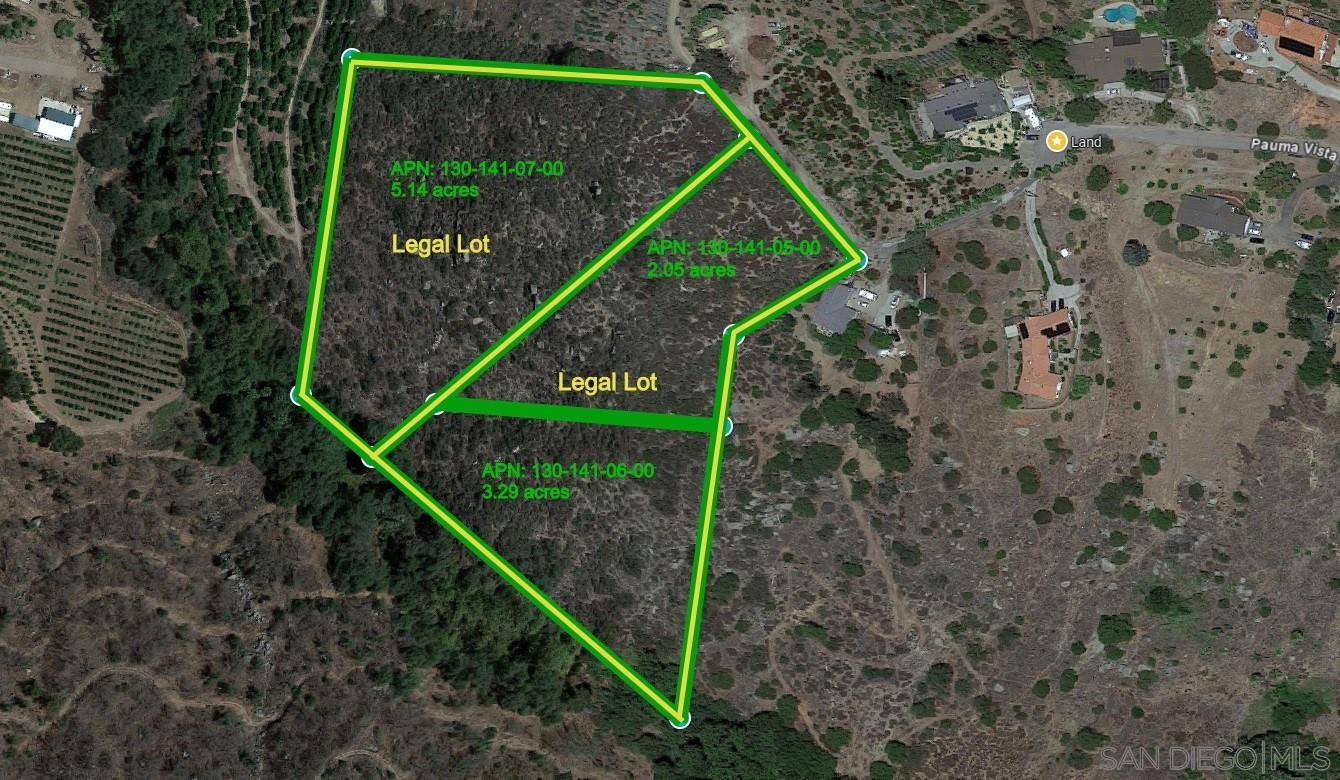 The lot is 5.34 acres! Build your custom home within beautiful Pauma Valley. This stunning private land for sale in Valley Center. Quality, panoramic view lots in neighborhood of fine homes. This is slopping lots that would be great for avocado trees or flowers. This legal lot consists of two APNs: 13014105-00 (2.05 acre), 13014106-00 (3.29 acre). Both lots has sufficient for the construction area at the top with following slope that will be great for the trees, plants and trails. Stunning views onto the valley, easy access, continuous fresh breeze, Palomar Mountain vistas.City water, Electricity and Fire hydrantInterested in this Listing?