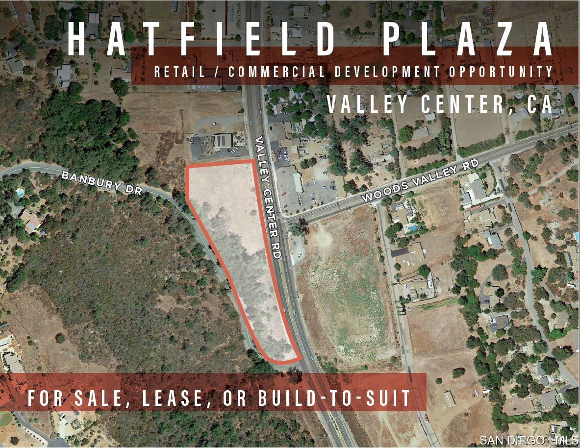 Hatfield Plaza, a 3.36 acre commercial development opportunity in the emerging South Village area of Valley Center, CA in San Diego County, for sale, lease, or build-to-suit. Located at a signalized intersection along highly trafficked Valley Center Road, the site is well suited to a variety of retail, including drive-thru, or office uses. A tentative parcel map (TPM) for 4 separate parcels, each with its own planned building ranging from 2,250 to 7,000 SF, is ready for submittal.Interested in this Listing?