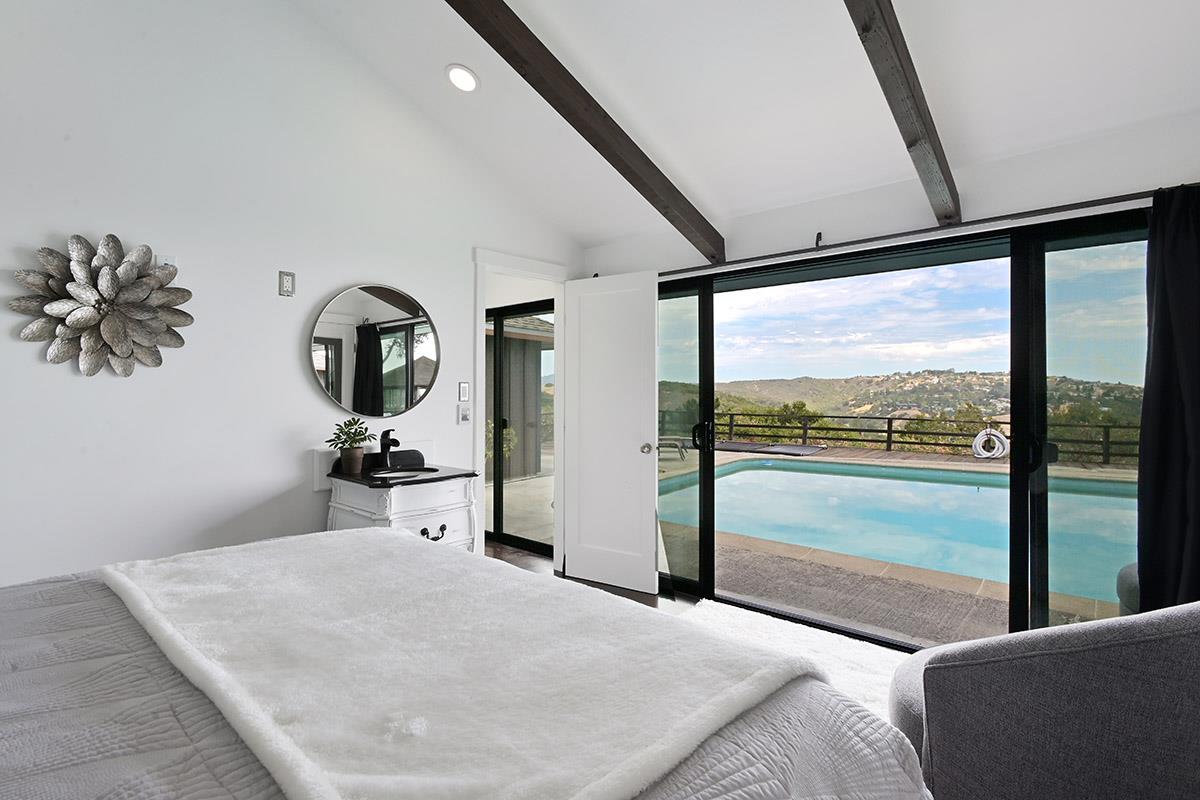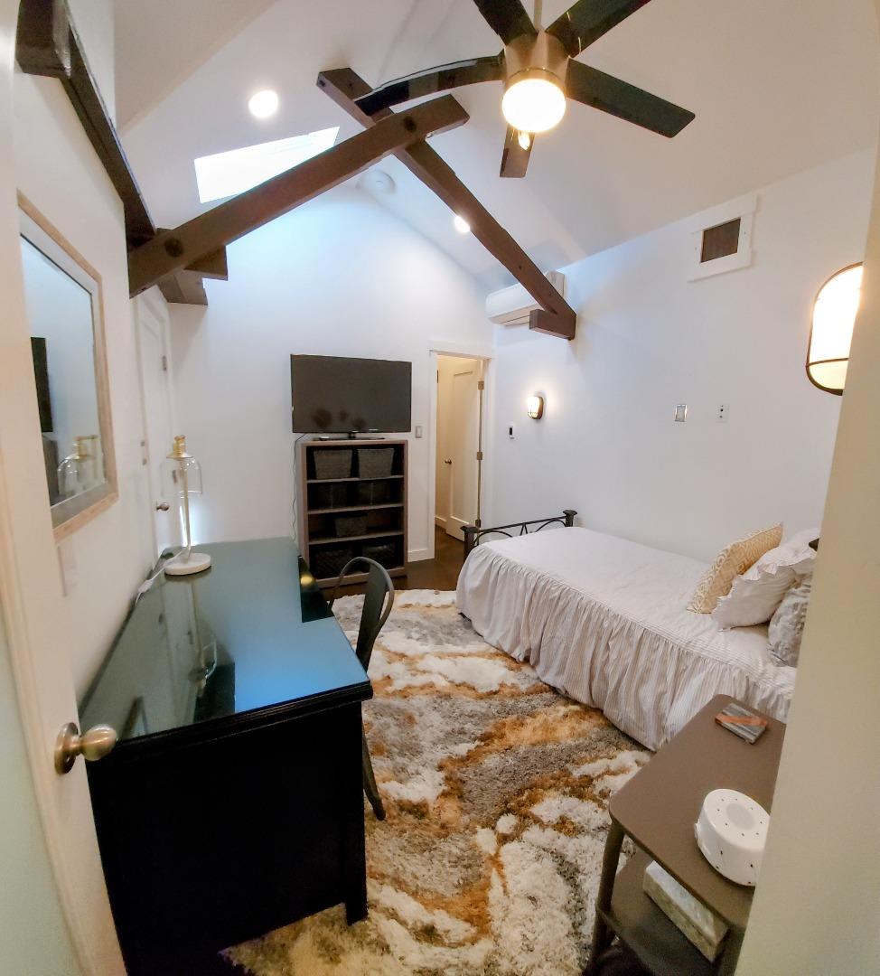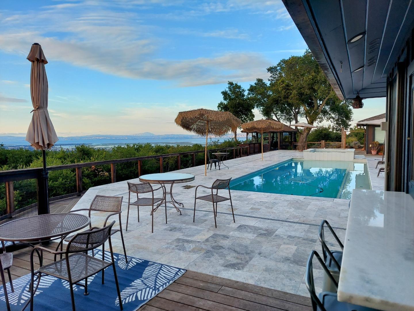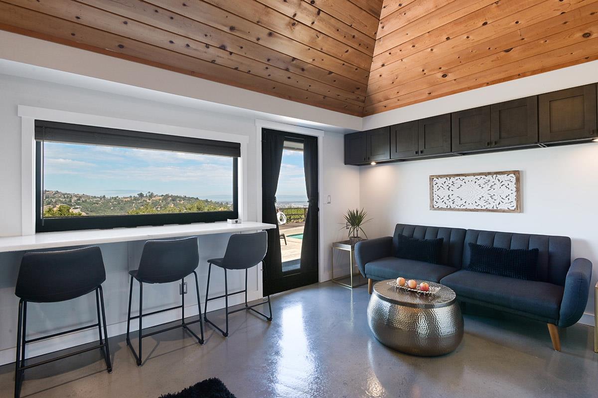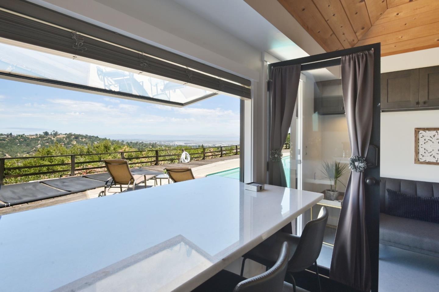 Fully furnished separate guest house with a truly unbelievable view from every room. For one or two people only. Sunsets on the western hills are a nightly spectacle, plus bay and city lights views. This is a country setting. Rustic organic ranch inspired property with a chic, polished interior. Its small but spectacular. Living kitchen, two bedrooms, one queen bed, one twin in the 2nd bedroom which serves as an office. In the hills above Redwood City, 5 Mins to 280, 10 mins to downtown Woodside, 10 mins to downtown Redwood City. Onyx countertops, gas range, stainless steel fridge, range hood and dishwasher, two bedrooms with walk in closets, one bedroom is set up as a home office, primary bedroom with an in room vanity sink, stained concrete floors throughout, recessed lighting, ceiling fans, vaulted, beamed cathedral ceiling, ductless heating and air conditioning, striking panoramic views of bay, bridges, city light AND of the western hills, gated private driveway, two full bathrooms