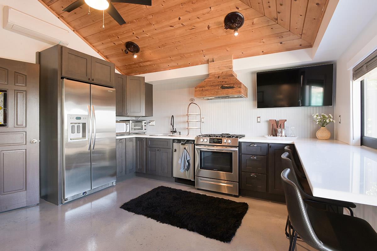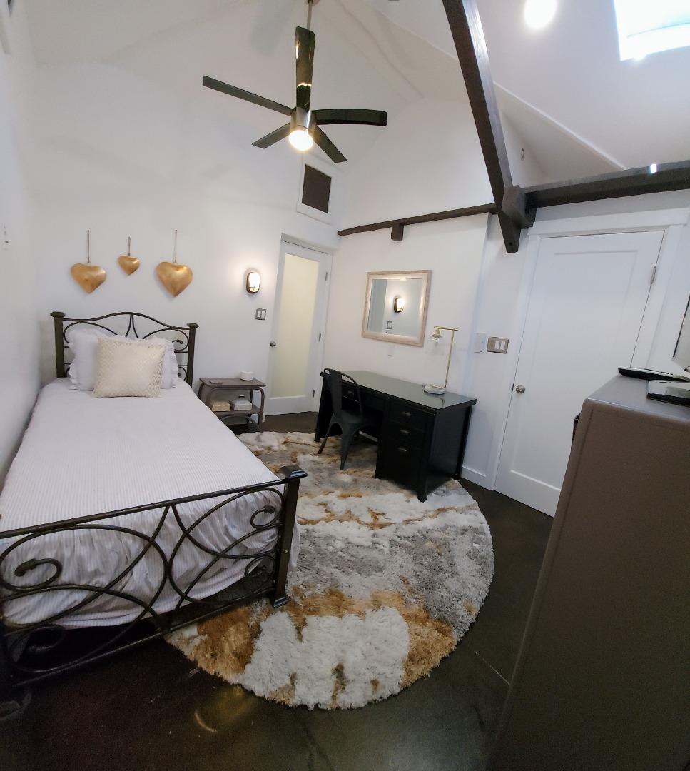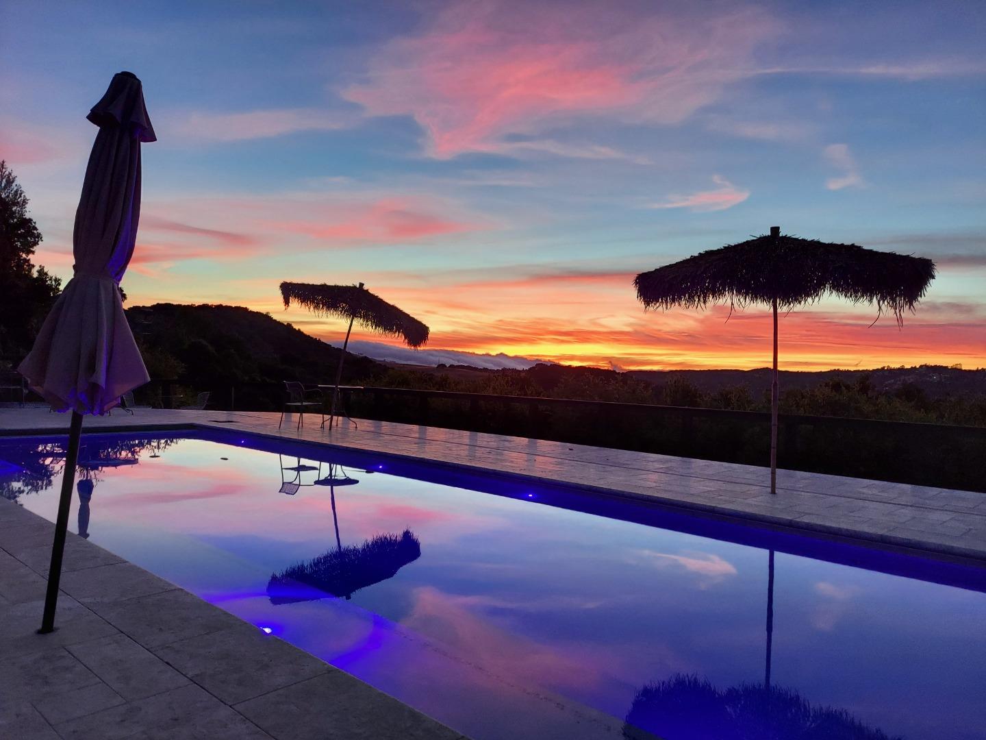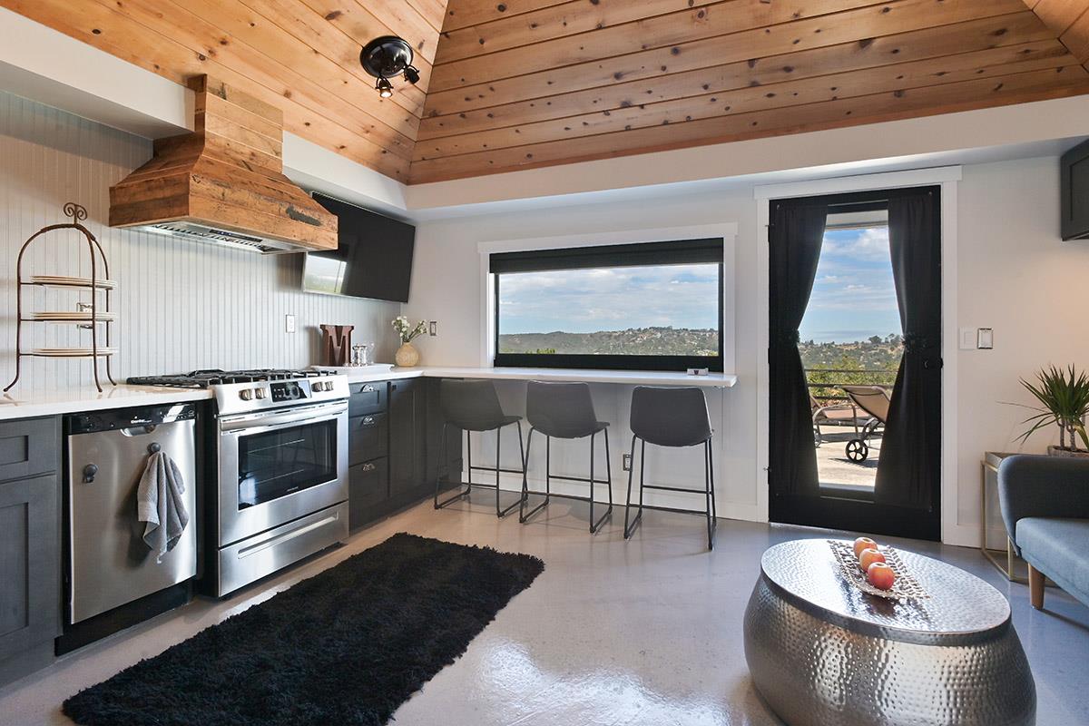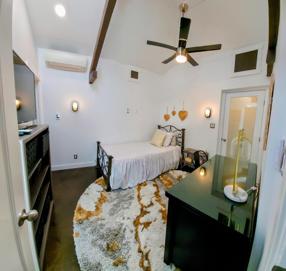 Fully furnished separate guest house with a truly unbelievable view from every room. For one or two people only. Sunsets on the western hills are a nightly spectacle, plus bay and city lights views. This is a country setting. Rustic organic ranch inspired property with a chic, polished interior. Its small but spectacular. Living kitchen, two bedrooms, one queen bed, one twin in the 2nd bedroom which serves as an office. In the hills above Redwood City, 5 Mins to 280, 10 mins to downtown Woodside, 10 mins to downtown Redwood City. Onyx countertops, gas range, stainless steel fridge, range hood and dishwasher, two bedrooms with walk in closets, one bedroom is set up as a home office, primary bedroom with an in room vanity sink, stained concrete floors throughout, recessed lighting, ceiling fans, vaulted, beamed cathedral ceiling, ductless heating and air conditioning, striking panoramic views of bay, bridges, city light AND of the western hills, gated private driveway, two full bathrooms