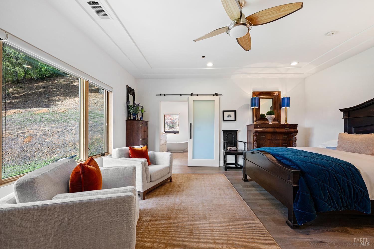 Set on over six private acres in historic Asti, this meticulously reimagined single-level residence seamlessly blends sophisticated design with the serenity of wine country living. Every surface, system, and detail has been thoughtfully upgraded to create a refined sanctuary where modern luxury meets natural beauty. Step through the gated entry and custom Simpson wood door to discover sun-drenched interiors featuring wide-plank Siberian white oak floors, plastered walls, and soaring ceilings. The reimagined kitchen showcases hand-chipped travertine floors, Thermador built-in refrigeration, and custom pantry cabinetry. Both bathrooms have been completely renovated with designer finishes, while the master suite offers expanded windows framing tranquil hillside views and a spa-inspired bathroom with luxurious soaking tub. Outside, professional landscaping creates an intimate retreat with olive trees, raised garden beds, and peaceful walkways. Stained cedar accents complement the smooth stucco exterior, while Andersen wood casement windows flood every room with light. The oversized three-car garage features enhanced door height and built-in cabinetry. Sustainability meets sophistication with solar panels, Tesla Powerwalls, heat pump systems, and tankless water heatingdelivering energy independence without compromise. Located minutes from Geyserville's acclaimed dining and wine tasting, yet cocooned in absolute privacy, this architecturally designed estate offers the rare combination of refined infrastructure, turnkey elegance, and quintessential wine country lifestyle.Interested in this Listing?