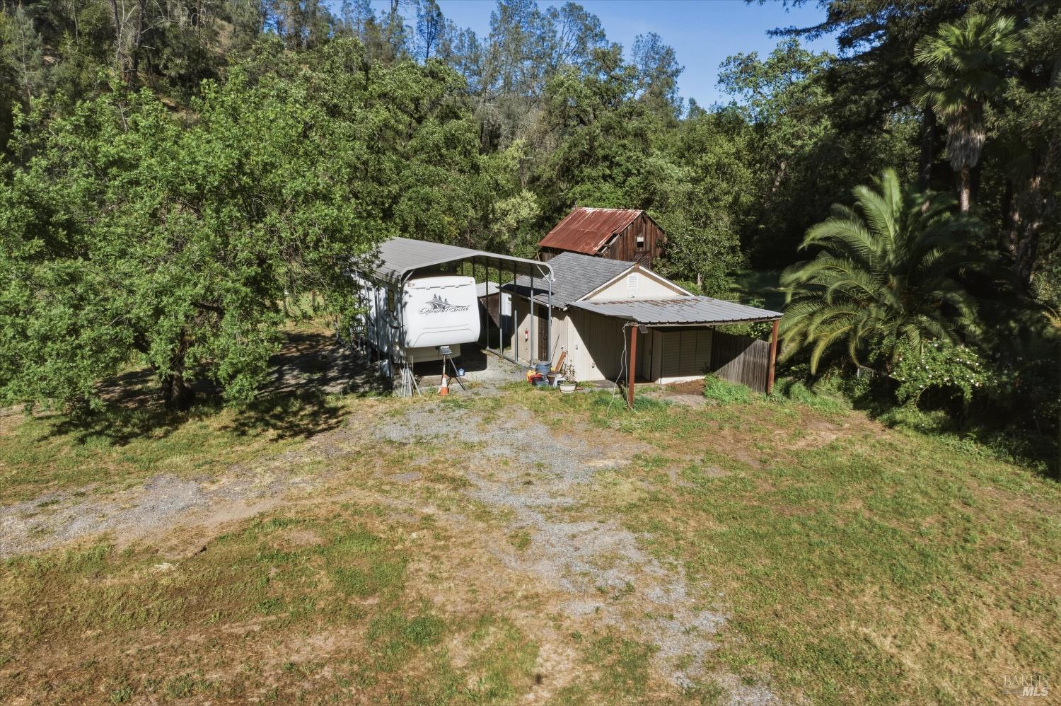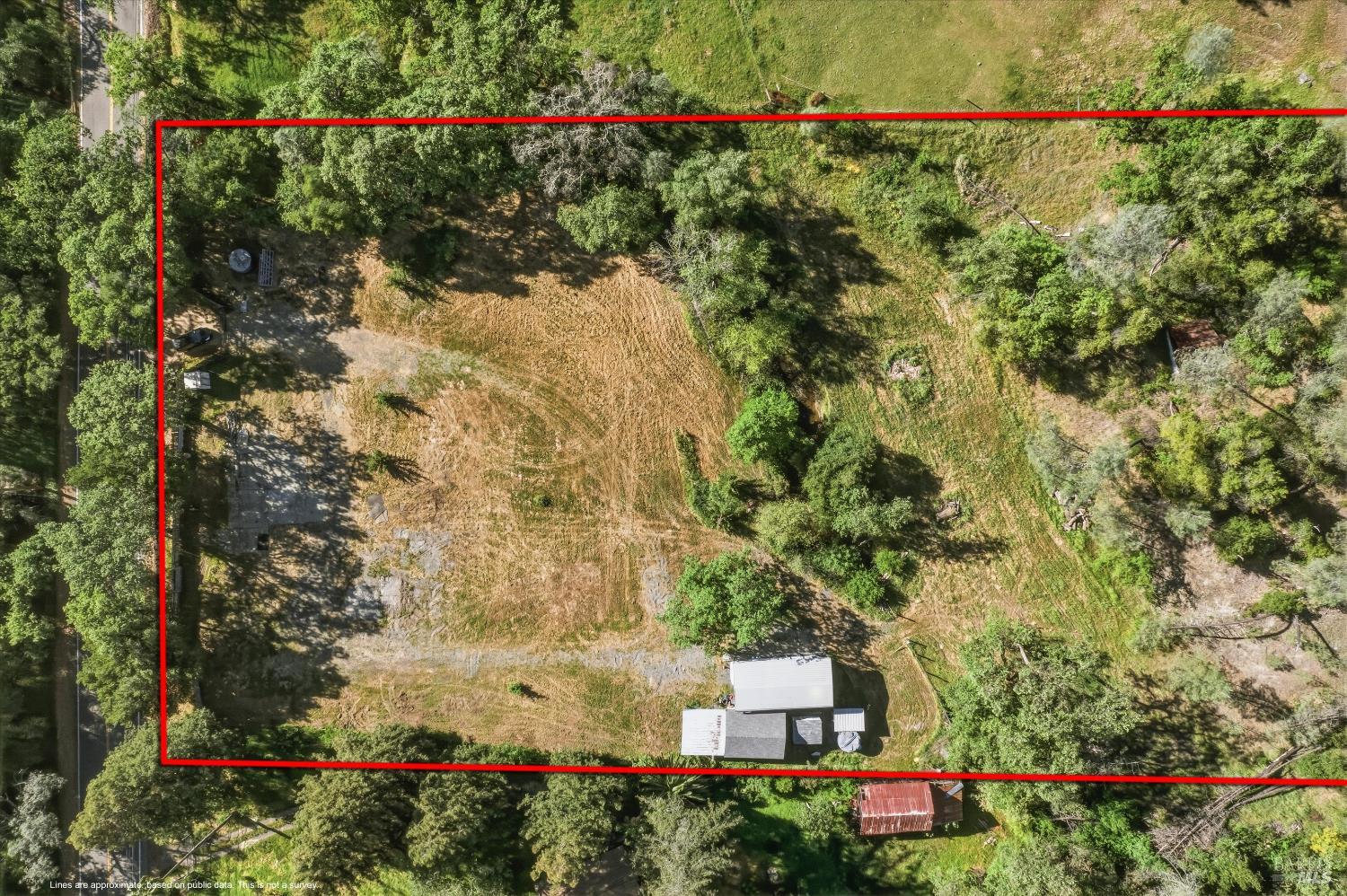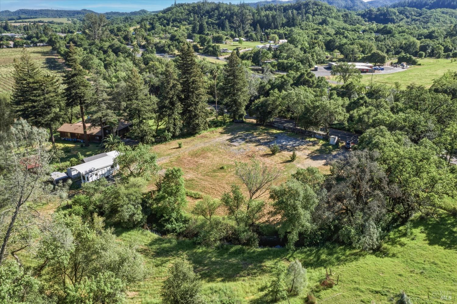 Beautiful homesite at the southern end of Cloverdale. Water well is installed. Septic system is designed and approved, but not installed. Electric available at the road. Pretty site with open, level areas, trees, and Icaria Creek running through. There's a storage shed, another smaller shed and a primitively developed spring on site. *NOTE* The barn with the rusty roof is NOT A PART of our offering. The red lines on the aerial photos run a bit wide!