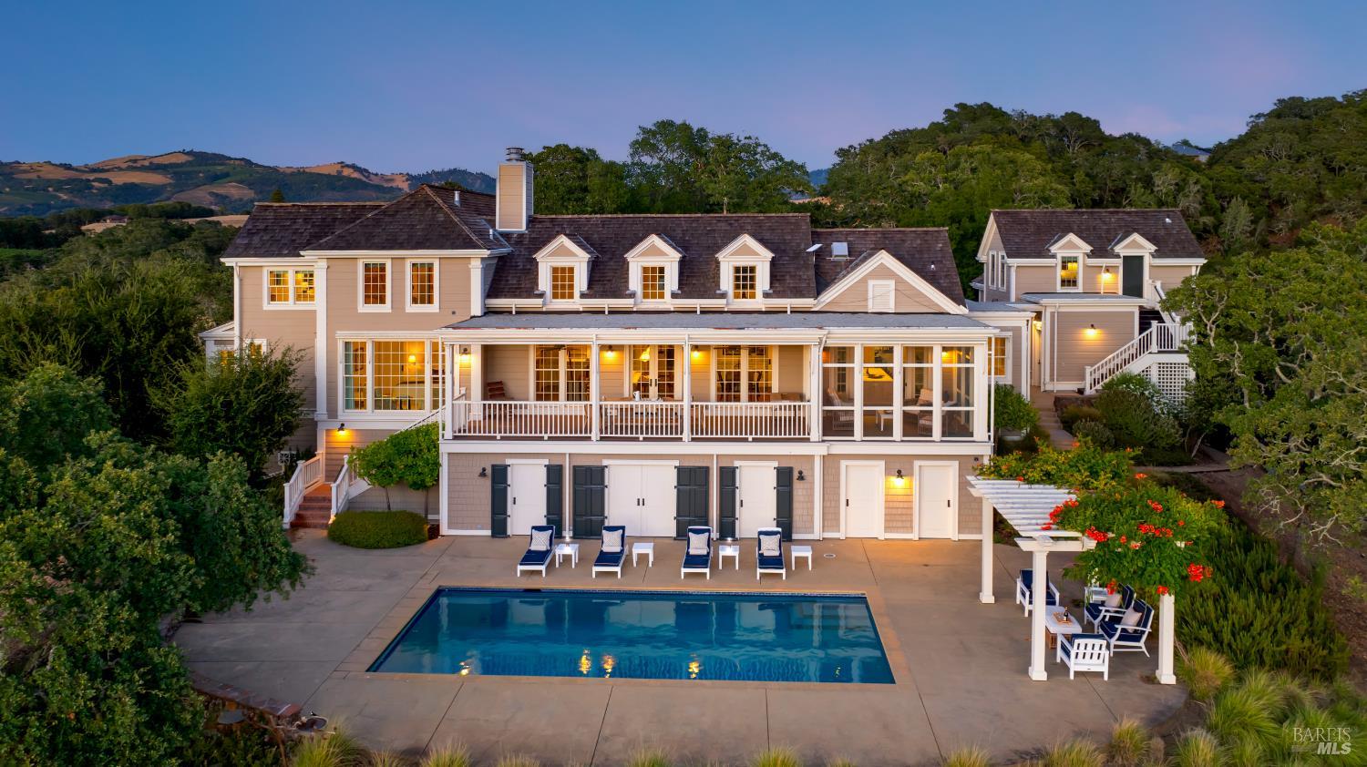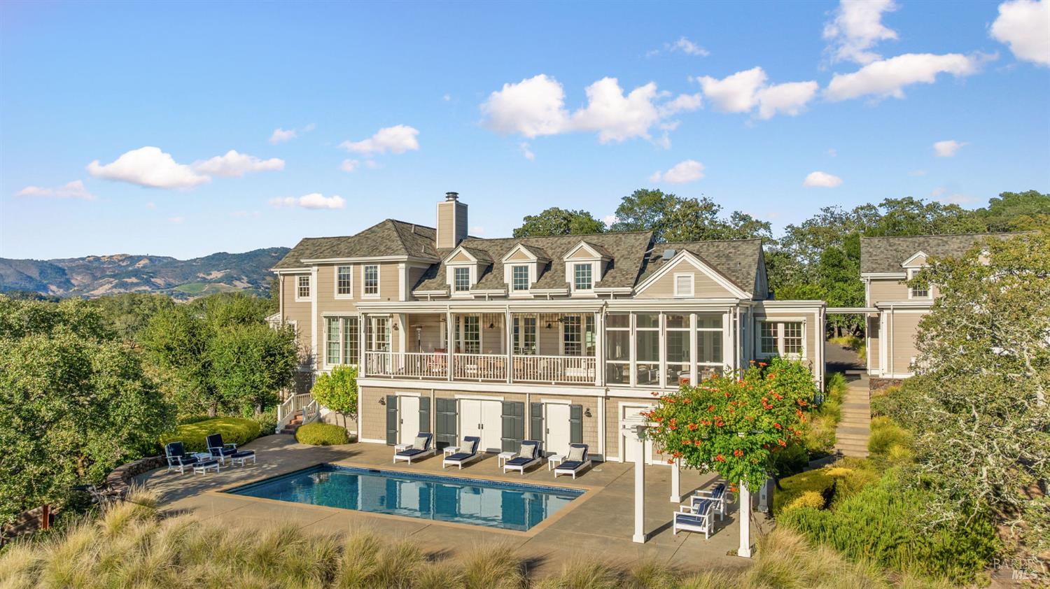 This exquisitely designed four-bedroom home, known as Covey Hill for the quail that frequent its grounds, is located just minutes from the charming village of Glen Ellen. An open living and dining area includes a gas fireplace and French doors opening onto an expansive veranda with spectacular views. A spacious kitchen boasts stainless steel Viking appliances, a dining nook, and access to the screened-in porch. The main-level primary suite provides added privacy, featuring a spa-like bathroom, while three guest bedrooms and bathrooms are located on the second story of the home. Below the veranda sits a built-in saltwater pool and a large patio perfect for gathering. A full bathroom, flex space, and wine cellar are also located on the patio. The detached two-car garage includes a private studio apartment above, providing additional guest lodging or rental income. Set on 22 wooded acres, the property also features two acres of vineyard and a producing olive orchard. With its natural beauty, refined living spaces, and serene setting, Covey Hill at 2220 Warm Springs Road is a tranquil retreat in a dream Wine Country location.Interested in this Listing?