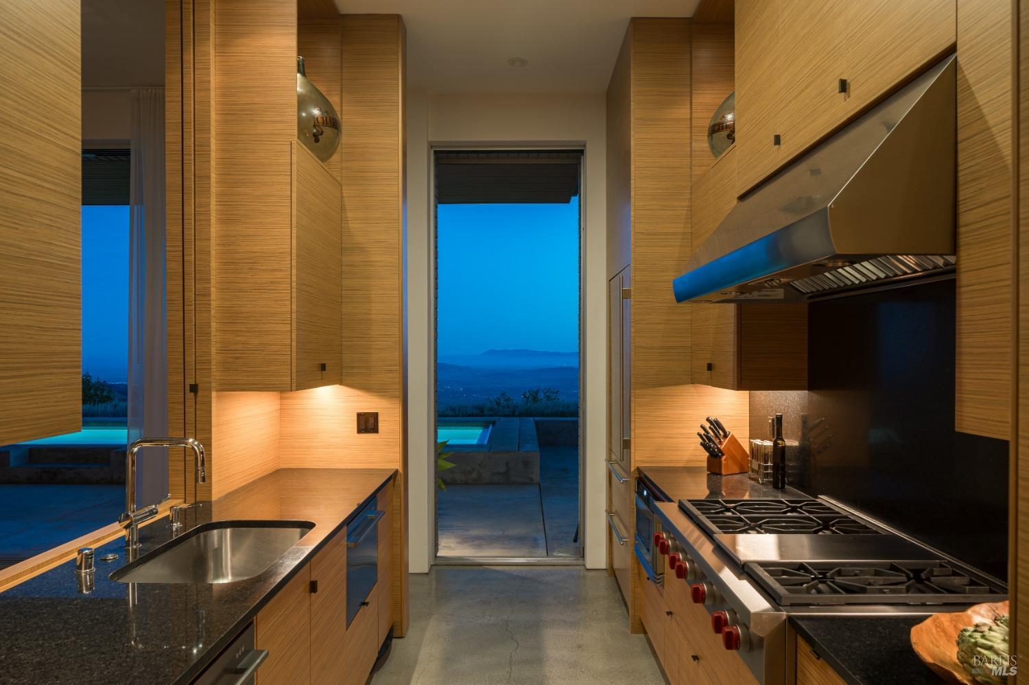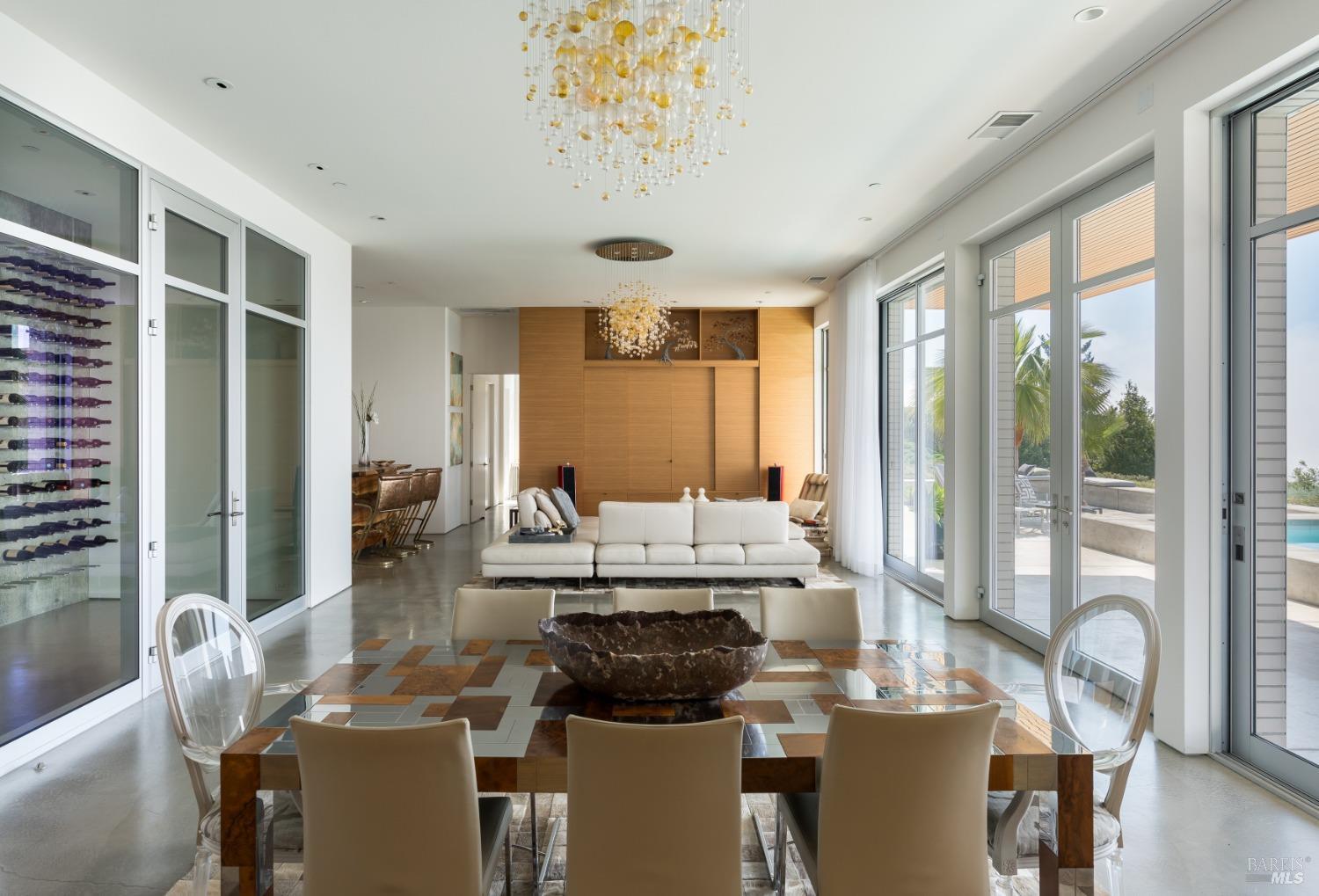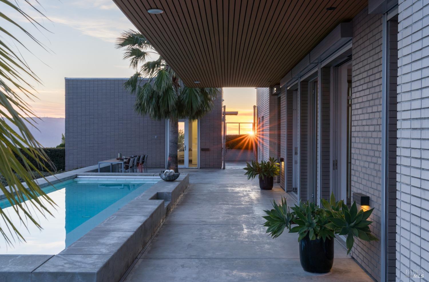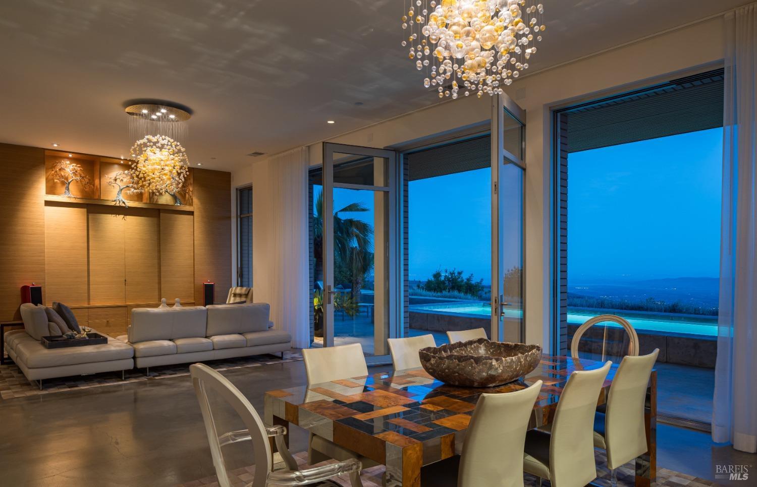 Designed by Portico West, and influenced by Philip Johnson's Glass House, 2947 Cavedale Road is a remarkable property. Built into the hillside, with views of the San Francisco skyline and the iconic Valley of the Moon, you're surrounded by a breathtaking landscape. The security gate to enter the property is made up of corrugated steel panels, and is the first introduction to its modern and industrial aesthetic. The interior of the home features an abundance of creative design elements, including custom teak cabinetry, handblown glass chandeliers, and a wine room with a backlit onyx wall. There are two spacious suites, each with separate entries for added privacy. A private guest house is located near the entry doors to the patio. Separating the patio from the inside of the home are custom ten foot doors, which slide into a hidden wall to allow for a complete open. The outdoor space boasts a built-in pool with bench seating around the perimeter, a bocce court, and mature landscaping.Interested in this Listing?