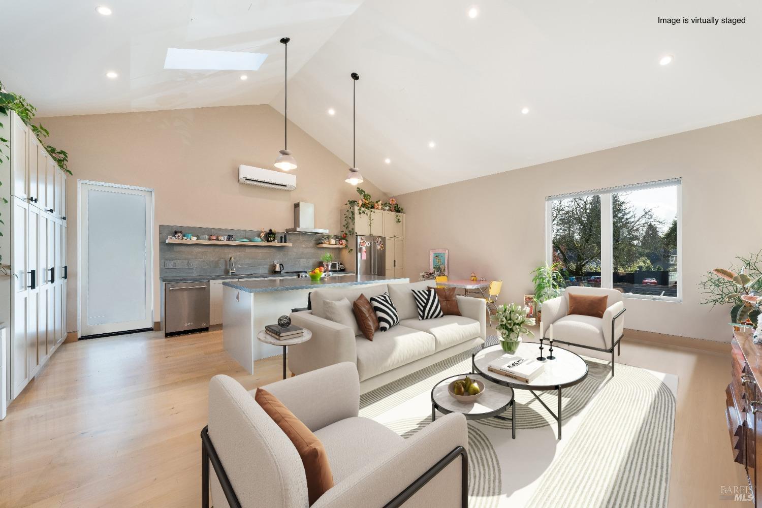 Exquisite 4 bedroom residence with separate 1 bedroom/1 bath ADU situated on approx .3 acres. Recently completed in 2021, this home is an oasis close to the Healdsburg Plaza. The main residence features soaring ceilings, a dramatic centerpiece fireplace, architectural suspended staircase, walls of windows, a sleek modern kitchen with grey tone cabinetry and Miele appliances. The floor plan is ideal comprising 4 bedrooms and 3.5 baths, spacious executive office, chef's kitchen with adjacent breakfast room, large butler's pantry, elegant dining room and living room ideal for entertaining. Strong design elements with soft imbued colors and textures throughout. French doors open to the patio and pergola - an ideal place to put a pool, if desired. The Guest Studio/ADU is great for extended family, guests or caregiver as it includes a spacious bedroom and bathroom, full kitchen, laundry, living and dining area. The shared upper deck adjoins the main residence with the ADU. This home is a showcase of designer style and state-of-the-art construction. The elegant facade and landscaped grounds with the private gated rear driveway, make this a perfect fit for those attracted to sophisticated contemporary style with the convenience of an in-town walkable location.Interested in this Listing?