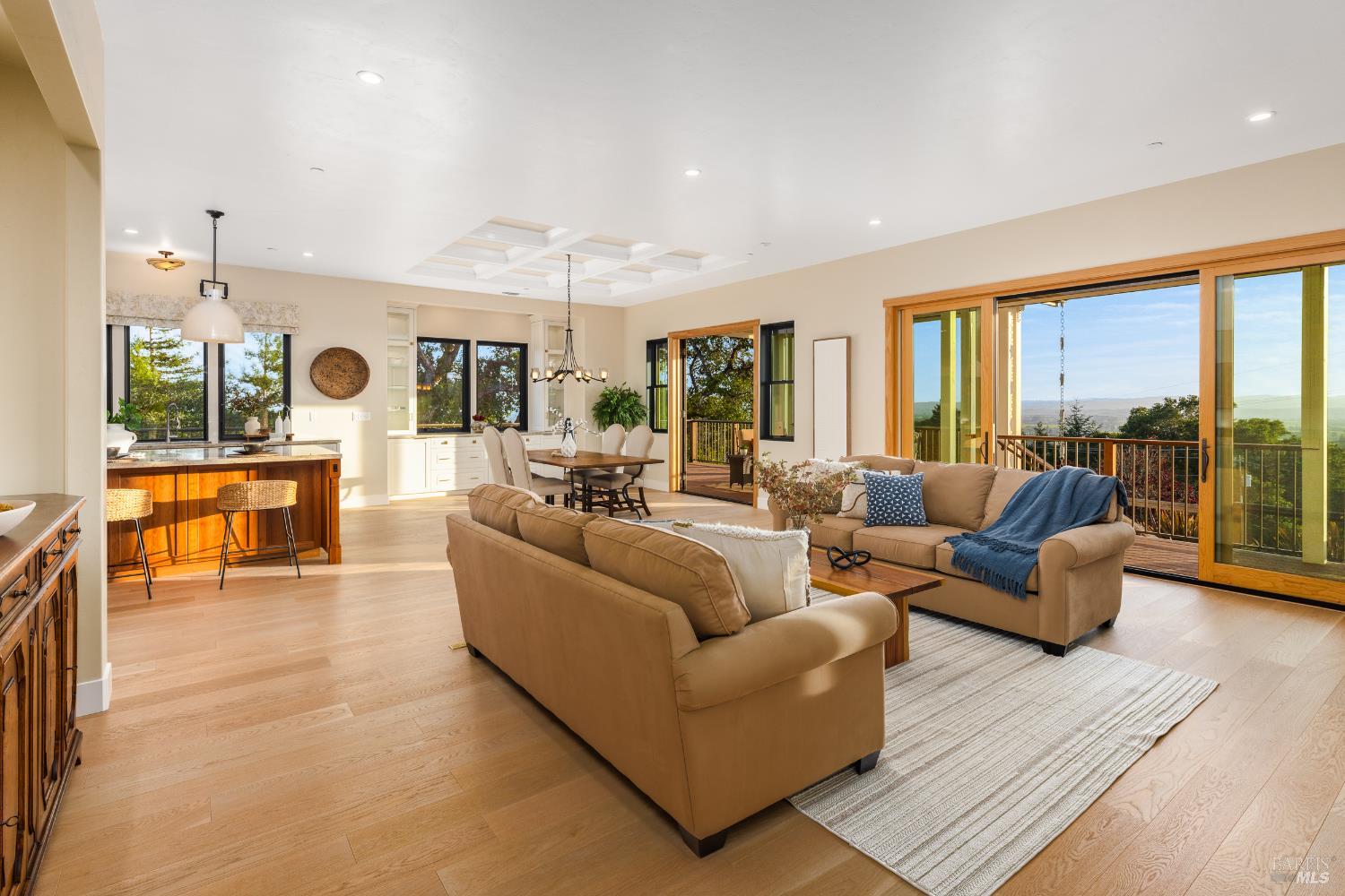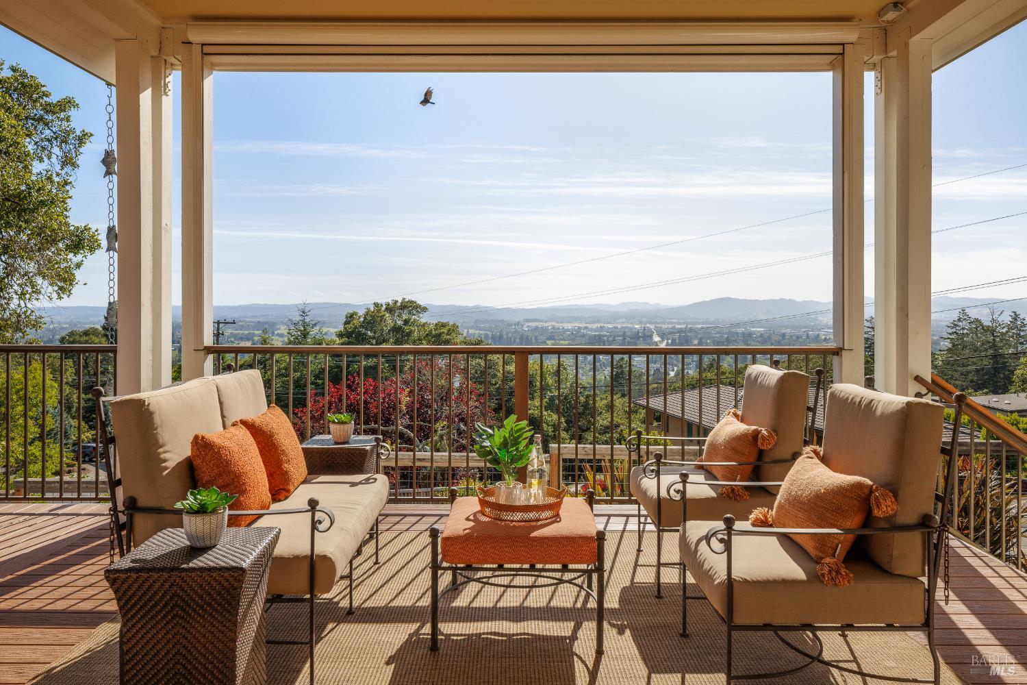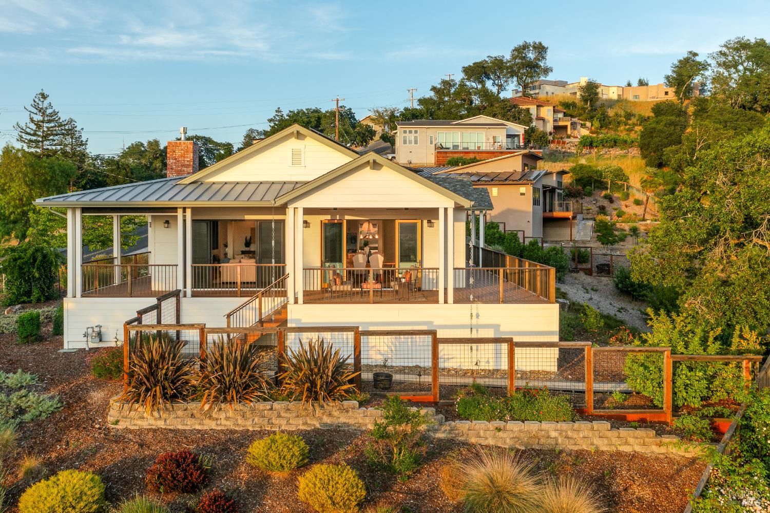 Welcome to exquisite 1335 Wikiup Drive. This captivating single-story custom residence, designed by Farrell Faber in Santa Rosa's beloved Wine Country neighborhood offers breathtaking sunset views. Home features 4 spacious bedrooms, 2.5 luxurious bathrooms, dedicated office space all on a large, beautifully landscaped .59-acre lot. The gourmet kitchen is an entertainer's dream, featuring top-tier BlueStar appliances, a generous walk-in pantry, charming coffee bar & expansive island. The great room is adorned with architecturally appealing coffered ceilings & features a fireplace with walnut surround. The designer appeal showcases solid cherry double entry doors, while extensive white oak flooring adds warmth & elegance. The inviting wrap-around porch boasts breathtaking vistas of cityscape & distance mountains where the fog often rolls in. The primary suite offers views, luxury bath & direct patio access. There's great outdoor entertaining with Trex decking & spacious patio. Professionally landscaped low maintenance grounds with fruit trees and colorful foliage. Enjoy minimal energy bills with paid-for solar & robust battery backup, oversized garage & convenience of being close to shopping, the Wikiup Swim & Tennis Club, Sonoma County Airport, wineries & fine dining.Interested in this Listing?
