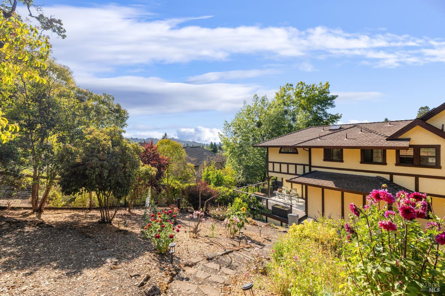 Welcome to this well maintained tudor located in Santa Rosa's best Bennett Valley neighborhood, Fairway View Estates. This multi-level home sits perched on a cul-de-sac. Outside you will find a 3-car garage, complete with a workshop and terraced grounds that beckon the amateur or master gardener alike. Roses, fruit & citrus trees abound, creating a relaxing and private oasis. Inside, the great room has cathedral ceilings, french doors and a gas fireplace w/ enough room to host all your family and friends! The formal dining room has french doors that lead to the deck complete with raised gardening beds below. The breakfast nook is a cheerful sunny spot. The updated kitchen has a gas cooktop, quartz counters and plenty of storage provided by the walk-in pantry and built-in dry bar. The indoor laundry/mud room leads to the back yard. Down the hall you'll find a full bathroom and a bedroom that currently lives as an office with sliding doors out to the deck and dining area. Upstairs, a built-in desk greets you at the landing along with a full bathroom. The lovely guest bedroom has views of Mt. Taylor from the window seat. The primary suite is spacious with views, a double walk-in closet and an updated bathroom. This traditional tudor welcomes you HOME:)Interested in this Listing?