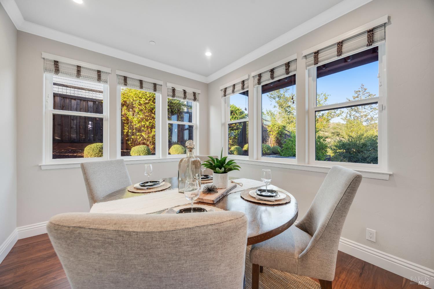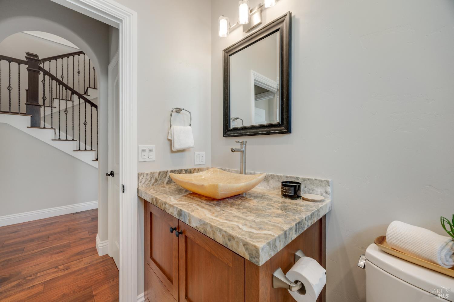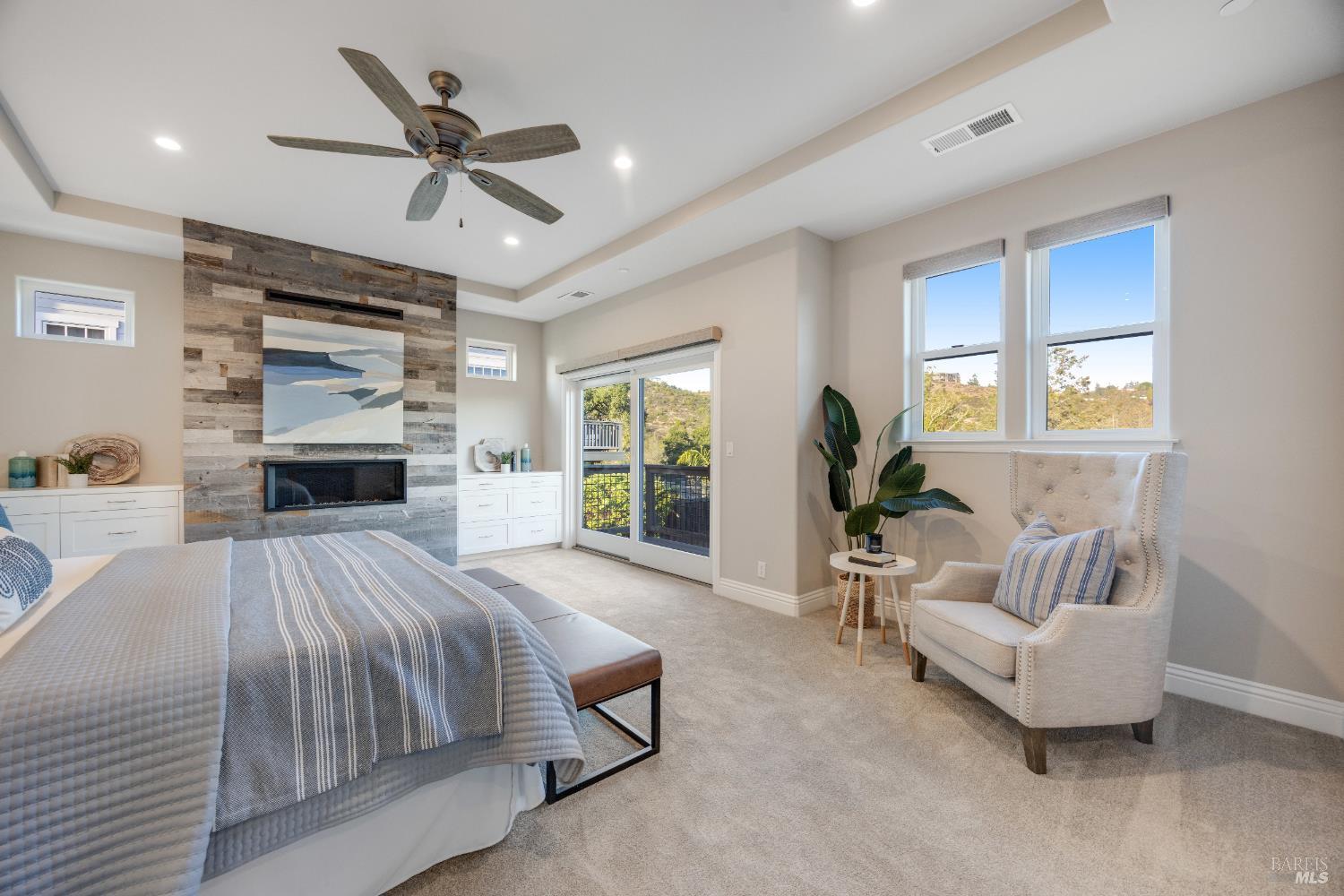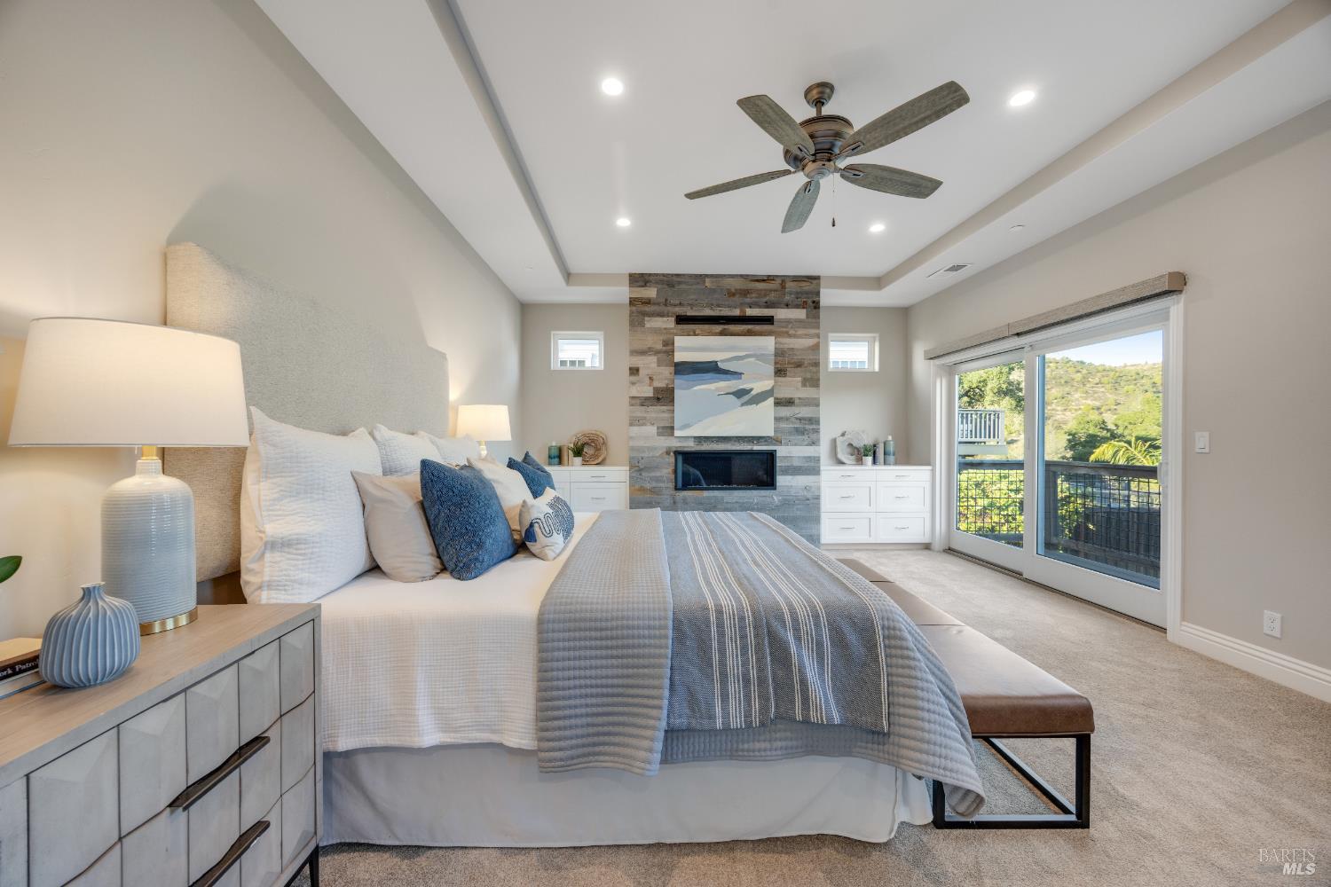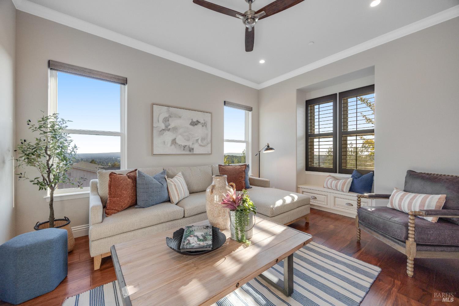 This modern, luxurious Fountaingrove gem blends elegance, comfort, and functionality across 3,818 sq. ft. of meticulously designed living space. Nestled on a generous 0.41-acre lot, this 4-bedroom, 3-bath home features a spacious loft, tile roof, and a 4-car tandem garage perfect for today's lifestyle. Step through the impressive entry to find crown molding and rich Acacia wood floors flowing throughout the main living spaces, setting a tone of warmth and sophistication. The formal dining room invites effortless entertaining, while the serene living room provides a peaceful retreat with tranquil views. The expansive great room centers around a stunning gas fireplace framed by custom built-ins and surround sound, seamlessly opening to the chef's kitchen. Culinary enthusiasts will love the granite countertops, soft-close cabinetry, pendant-lit island, Wolf double ovens and range, Sub-Zero refrigerator, KitchenAid dishwasher, and butler's pantry with wine storage plus a walk-in pantry with decorative glass door. The luxurious primary suite offers a private sanctuary featuring a cozy gas fireplace, coffered ceilings, dual walk-in closets, custom built-ins, private deck, spa-like bath with soaking tub, glass shower, and dual granite vanities. A dramatic staircase leads to the versatile upstairs loft, ideal for a media room, home office, or play space. Additional amenities include upstairs laundry, central heat/air, soft water system, owned solar, alarm system, and a whole-home Generac generator for ultimate peace of mind. Step outside to beautifully landscaped grounds with a paver patio, gas firepit, flagstone pathways, and a relaxing luxury spa all backed by open space for added privacy. A rare opportunity to experience elevated Fountaingrove living refreshed, refined, and ready to welcome you home.Interested in this Listing?