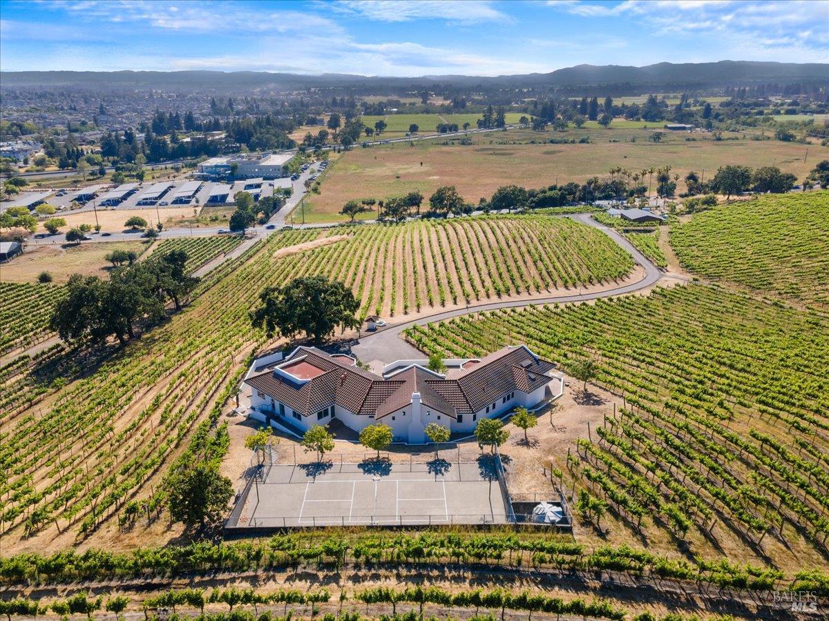 Perched atop a gently rising knoll with dramatic views of Santa Rosa's renowned Wine Country is an extraordinary 26.21-acre vineyard estate offering an unrivaled blend of luxury living & boutique wine production. A fusion of lifestyle & legacy, the property includes a custom-built residence, tasting room & event venue, seasonal pond, building pad, billboard & thriving vineyard. Built in 1998, the sprawling 4,094 SF custom home boasts 4 bedrooms, 3.5 bathrooms & top of the world views. Expansive windows frame panoramic west-facing views beneath soaring vaulted ceilings. A chef's kitchen & large dining & living room with bar area for hosting and your very own pickleball/basketball court. The 2,000 SF tasting room offers granite counters, restroom, an insulated finished storage area & a pergola-covered patio with seating for up to 40 guests. The estate holds a rare use permit allowing multiple events per year. The Russian River Valley AVA vineyard includes 9 acres of Chardonnay & 7.5 acres of Pinot Noir with separate irrigation well with 10,000 gallon storage tank. A separate building pad offers potential for expansion or a guest house. With high visibility along Old Redwood Highway, the billboard rental income provides for added revenue.Interested in this Listing?
