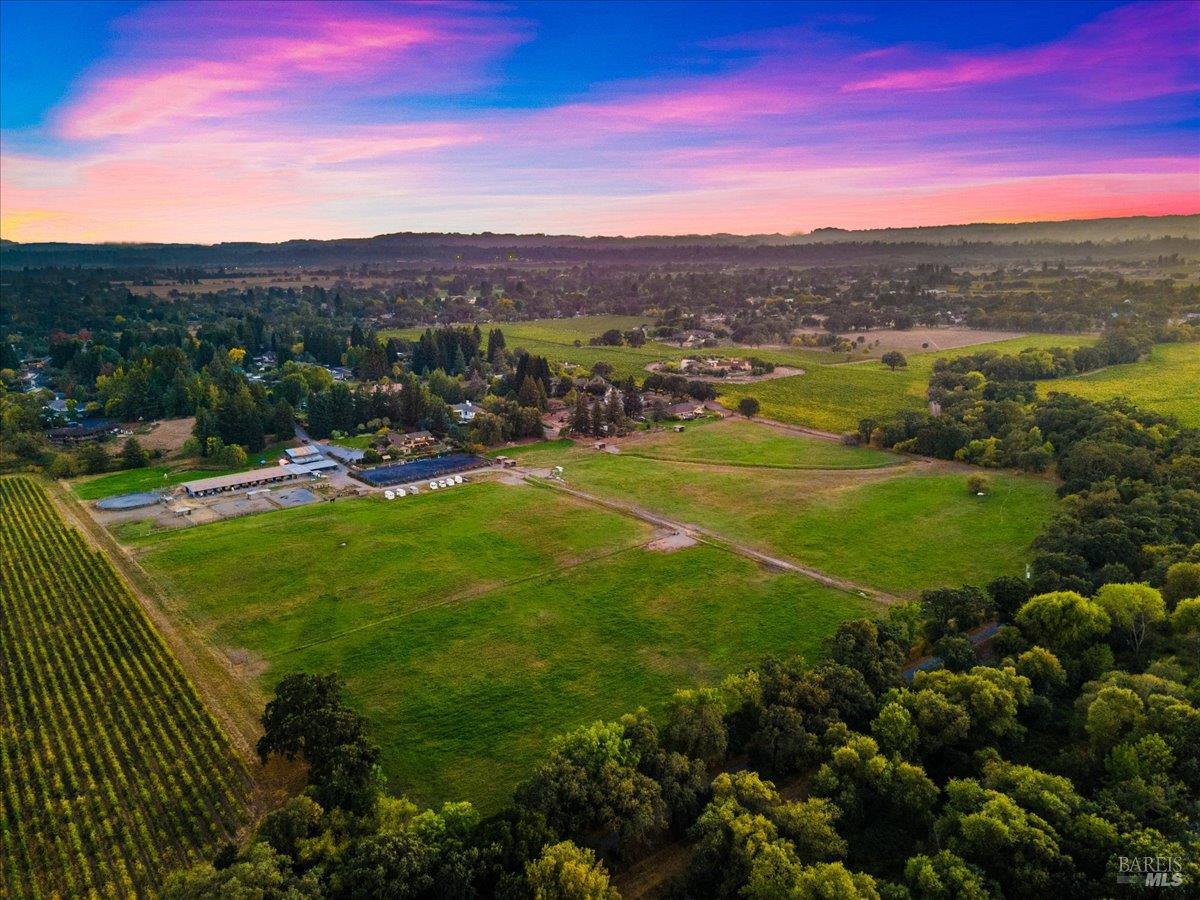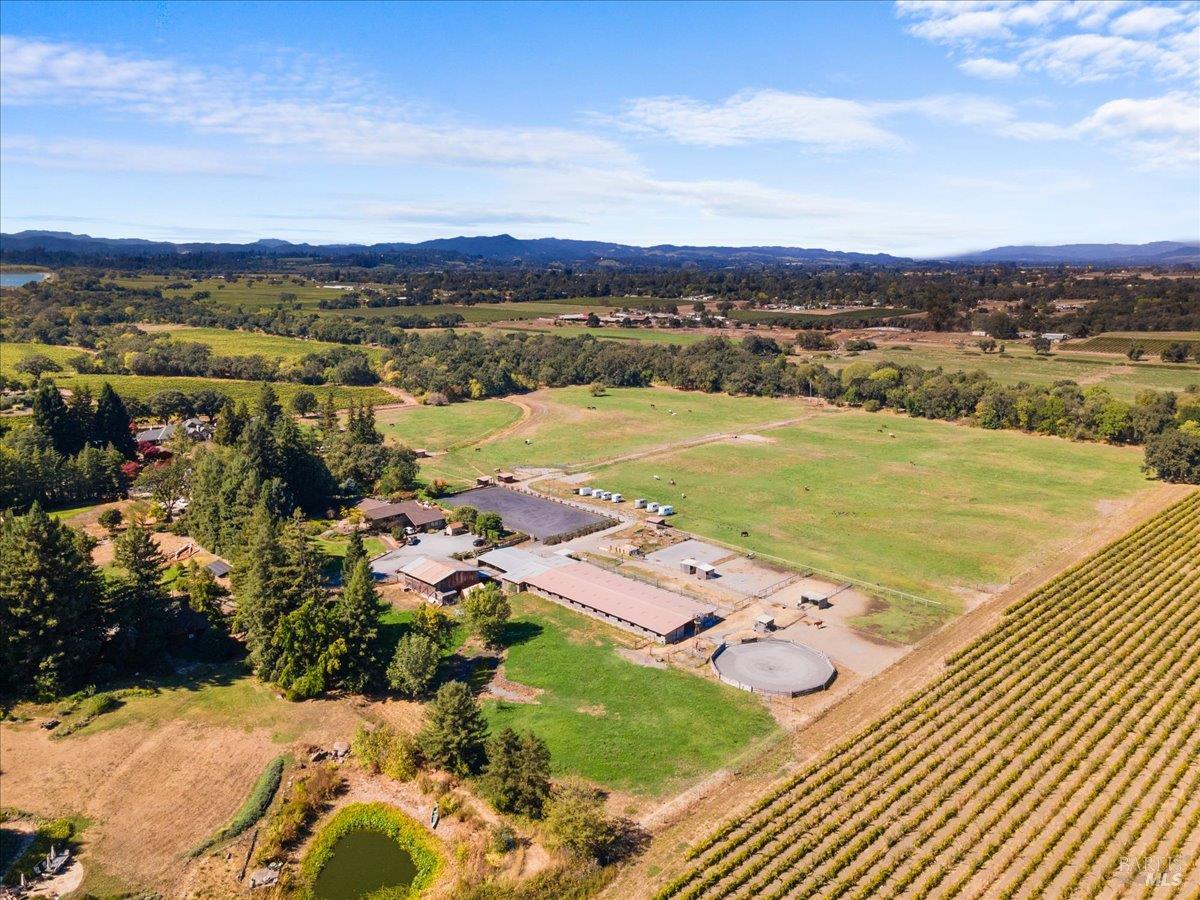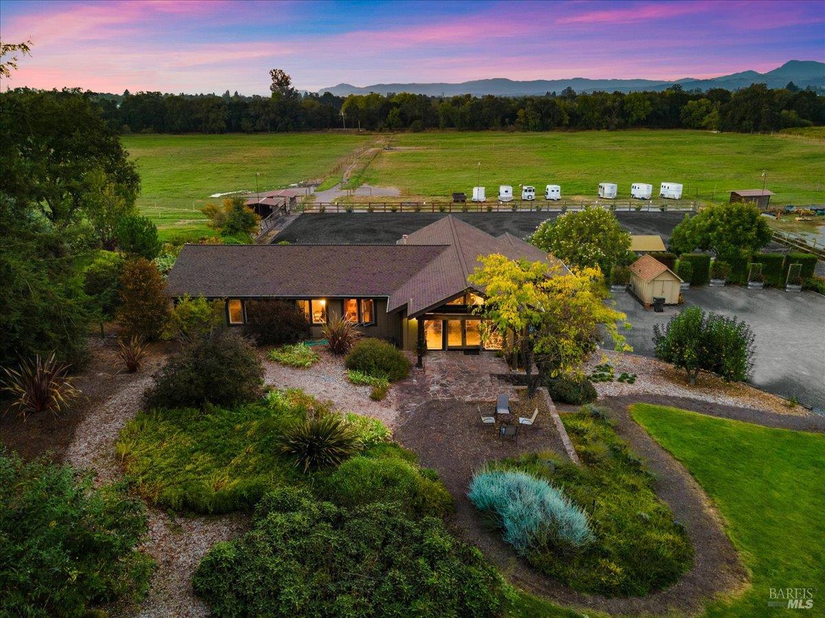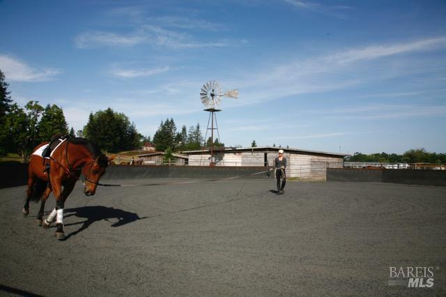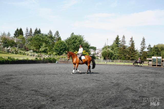 Hidden at the end of a private road in West Santa Rosa wine country lies a beautiful 23.89 acre (2 parcels) equestrian paradise with direct access to Santa Rosa Creek Trail. Permitted income producing equestrian boarding facility includes a 100'x190' lighted arena & 72' round pen, both with all weather shredded rubber/sand footing, redwood barn with 24 12'x18' rubber-matted stalls, 12 with attached 12'x24' runs, tack & grain storage, covered tack up area and vet/farrier paddock. Second barn for hay/shavings/equipment, 9 paddocks with shelters, 5 irrigated pastures, turnouts, hot water wash rack, automatic waterers & chicken area. Access to reclaimed water to irrigate pastures reduces hay costs & allows lush year-round grazing. The private sunny home features tall beamed ceilings, expansive views of mountains, pastures, vineyards, sunrises & sunsets. Updated roof, siding, windows, kitchen, decks and primary suite along with generator hook up, well and septic upgrades. A lower-level studio with kitchenette, separate entry, and patio offers flexibility for family or staff. Enjoy decks, views, wrap around water-wise veggie/flower gardens, and nearby access to Sonoma wine country, farm-to-table lifestyle, coastal beaches, park trails, airport, and country club.Interested in this Listing?
