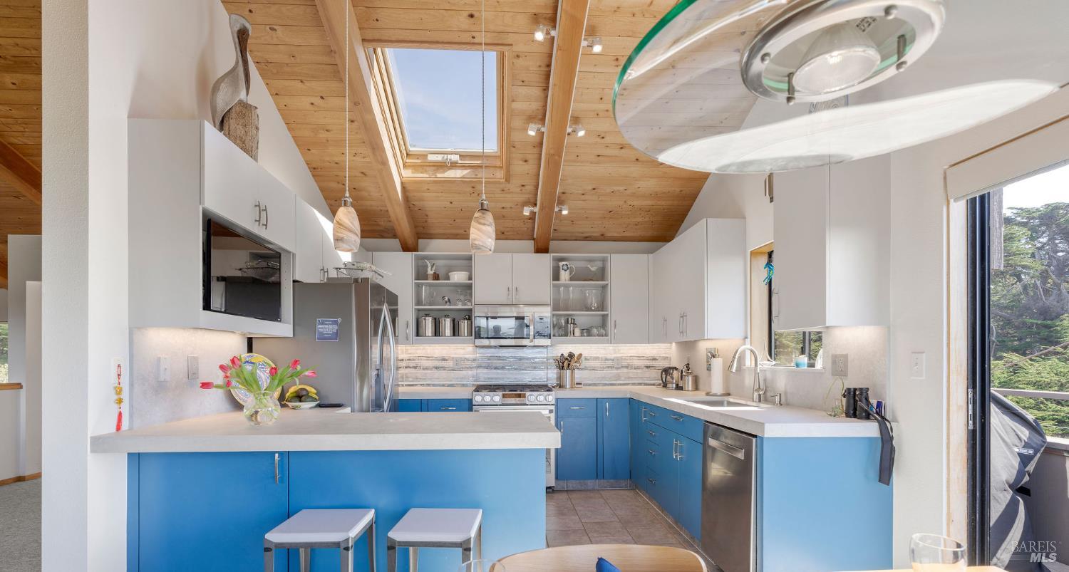 Welcome to The Sea Ranch and desirable unit 28. Perched to capture sweeping ocean views from the upper level, this thoughtfully designed 1996 home designed by Matheson and built by Contractor Carreiro blends coastal inspiration with flexible living spaces and serene outdoor retreats. Step into the beautifully updated 2019, ocean-inspired kitchen, where clean lines, natural light, and calming tones evoke the rhythm of the nearby sea perfect for both quiet mornings and effortless entertaining. The home's versatile layout offers a second living space/media room, complete with a cozy woodstove and an attached full bathroom, ideal for guests, extended family, or a private retreat. From here, enjoy tranquil hedgerow views that create a sense of privacy and calm. The home features two spacious primary suites on the first floor, offering comfort and convenience. One suite includes its own woodstove and direct access to the peaceful courtyard. A dedicated office with built-in cabinetry provides a refined workspace for remote work or creative pursuits. At the heart of the property is the Zen-like courtyard - a true outdoor oasis with lush gardens, an outdoor shower, and a hot tub perfectly positioned for soaking while taking in ocean views. With two bedrooms plus a den, a large office, and three full bathrooms, this home offers exceptional flexibility to live, work, and relax while surrounded by the beauty and tranquility of the coast. Walk to some of the best beaches at The Sea Ranch incl. Walk on Beach, Tide Pool and Shell beaches plus enjoy everything One Eyed Jacks has to offer just steps away from this property. The seal rookery is a very special place tucked into a cove just beyond a magic hedgerow leading from One Eyed Jacks to the ocean. Enjoy natures magic here every spring in a safe distance from the bluff top perch. Other amenities at The Sea Ranch include 60+ miles of trails and private roads ideal for hiking and biking from the redwoods to the sea; 3 recreation centers with outdoor heated pools, sauna, tennis, pickle ball and more. We have a private airstrip for members to arrive in speed and style. From Unit 28, you are almost equal distance to the village of Gualala for all needed services and the Sea Ranch Lodge for your retreat at the ocean. Come visit the beautiful Sonoma Coast and experience life at The Sea Ranch.