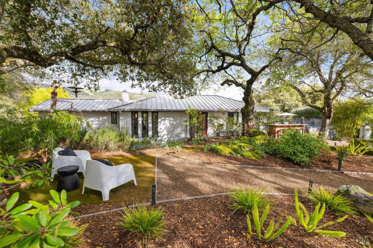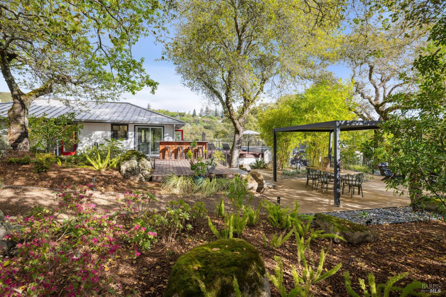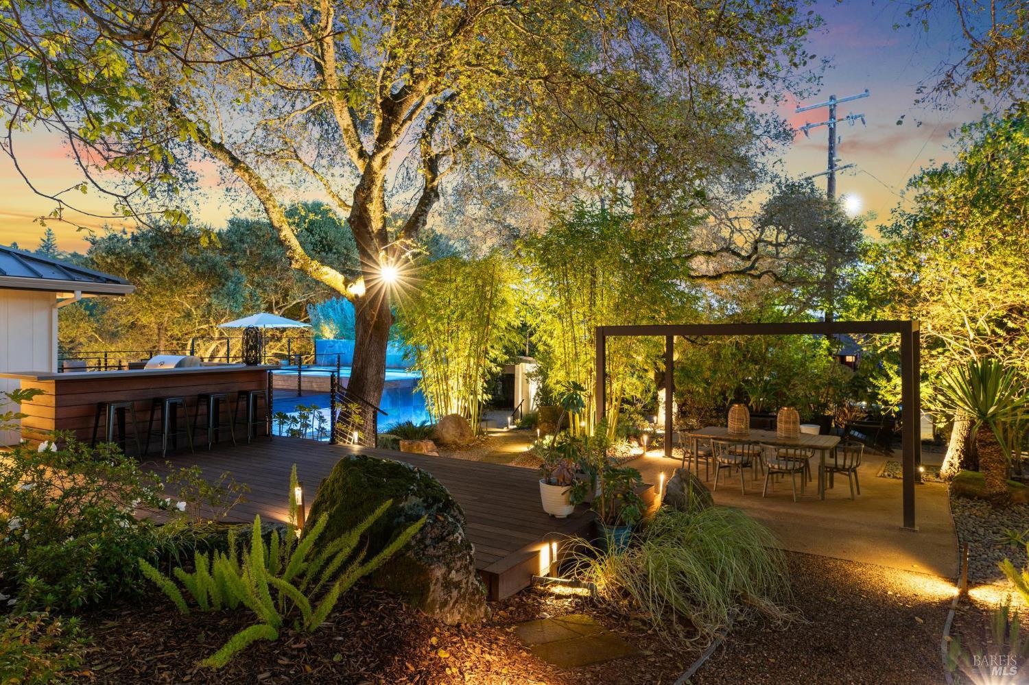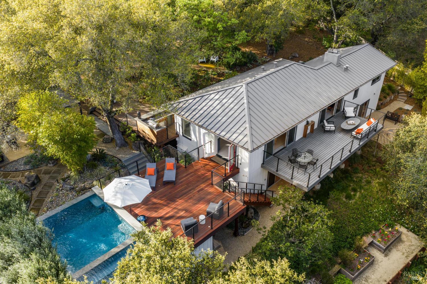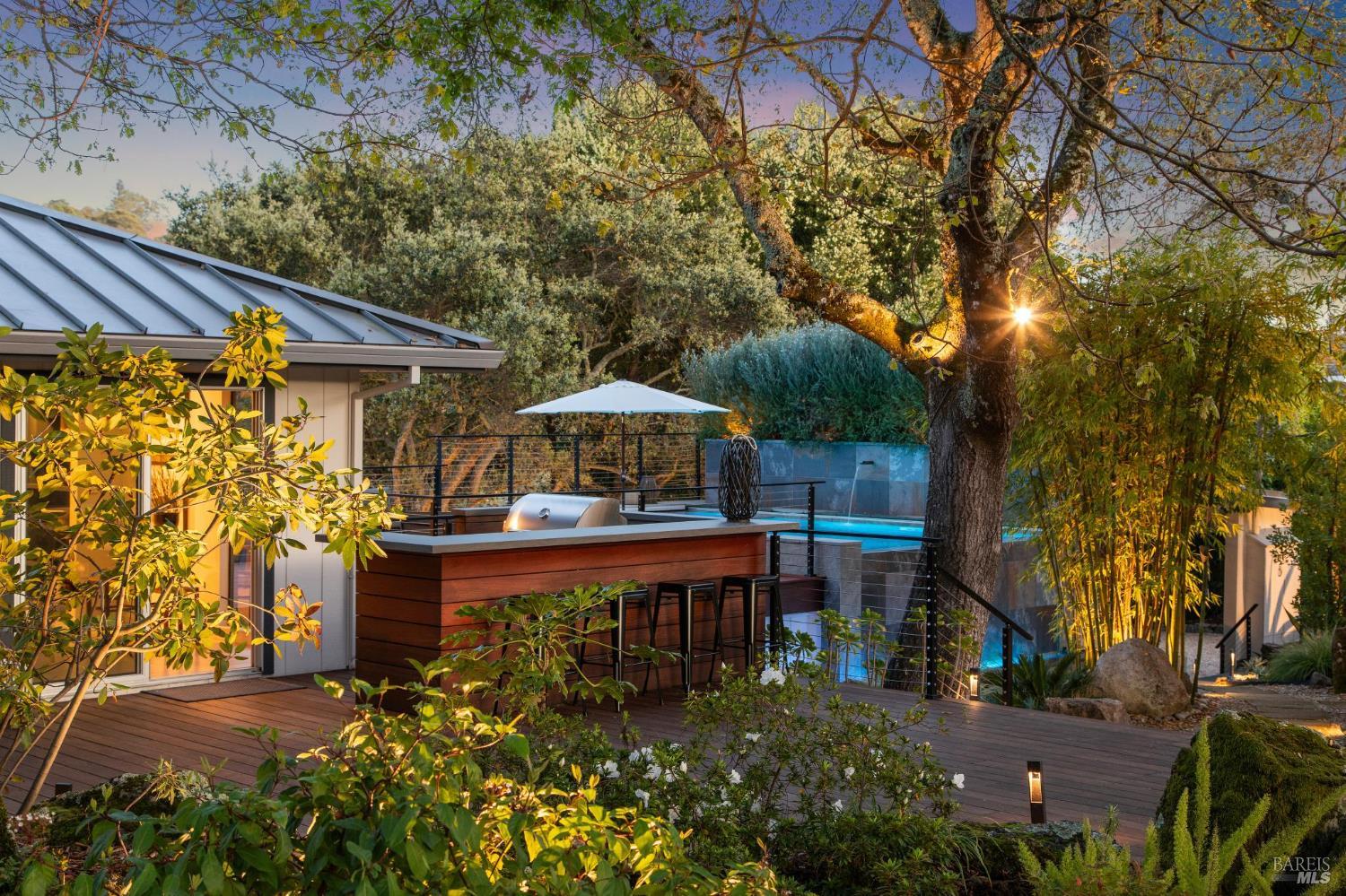 Flor d'Luna | Sonoma Valley. Private Oasis. 5-Star Resort Inspired. Stunning Views. Fabulous for Entertaining. Gracefully set on approximately 0.65 acres above Agua Caliente, Flor d'Luna is a serene Sonoma Valley retreat that balances architectural intention, natural beauty, and refined indoor-outdoor living just minutes from Glen Ellen, Kenwood, and Sonoma Plaza. Thoughtfully designed with a reverse floor plan, the home captures sweeping views and abundant natural light, with the great room positioned on the upper level and opening to two expansive view balconies, Light-filled and expansive, this space is ideally suited for both intimate gatherings and elegant entertaining, with sweeping outlooks that draw the surrounding landscape inward. The European-inspired kitchen is both sculptural and functional, appointed with quartz countertops, a designer tile backsplash, display shelving, and stainless steel appliances. A breakfast area flows naturally into the living space, reinforcing the home's effortless sense of connection and ease. The upper-level primary suite is privately positioned adjacent to the great room, while the home offers a total of four bedrooms and four and one-half baths, including two distinct primary suites - providing exceptional flexibility for guests or multigenerational living. The lower level reveals a private apartment-style suite complete with kitchenette, den, and fireplace - an inviting retreat ideal for extended stays, work-from-home needs, or hosting with discretion. Throughout the home, thoughtfully designated spaces encourage wellness, reflection, creativity, and quiet productivity. Outdoors, Flor d'Luna unfolds as a layered garden sanctuary. Multiple decks and patios invite seamless indoor-outdoor living, while winding pebble pathways pass beneath mature oaks and through lush, low-maintenance landscaping accented by tranquil sitting areas, and a contemplative labyrinth. A heated saltwater pool and spa with swim-in-place feature anchors the grounds, complemented by an outdoor kitchen and bar, outdoor shower, raised vegetable beds, greenhouse, and enchanting nighttime garden lighting. Private, composed, and richly livable, Flor d'Luna offers a rare opportunity to experience Sonoma living at its most serene, where design, nature, and lifestyle exist in quiet harmony, moments from world-class wineries, dining, and outdoor pursuits.