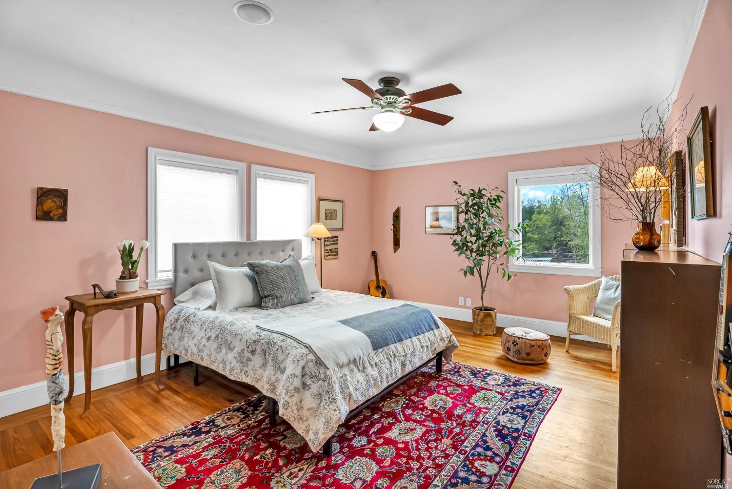 This unique property features many artistic elements which add to its allure. The architecture of the home is an ode to its original build from the 1930's. The arched doorways and beautiful oak floors immediately draw you in and are a testament to the incredible designs of that era. The main entrance takes you to the second floor where you'll find the living and dining spaces, as well as bedrooms, and a charming sunroom. The first floor of the home features another large living space with a wet bar and gas fireplace, a half bath, and the laundry room. The primary suite is also found on this floor, and it boasts a spacious bedroom, and bathroom with soaking tub, walk-in shower, and two walk-in closets. The first floor living room opens onto an expansive covered patio and the beautifully landscaped yard. There are custom stained concrete floors which flow from the interior out to the covered patio, seamlessly blending the desirable indoor/outdoor lifestyle. There is a guest cottage just steps from the patio and it has a bedroom, bathroom, and kitchenette. The vintage charm of this home makes it a truly unique find. There is so much to love about 18900 Robinson Road. Also great options as a rental and would make an excellent 1031 exchange.Interested in this Listing?