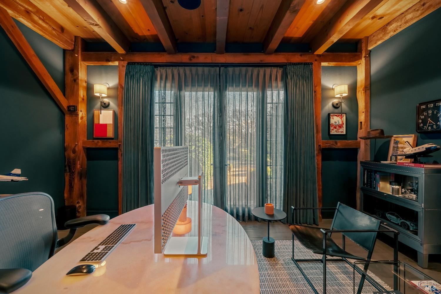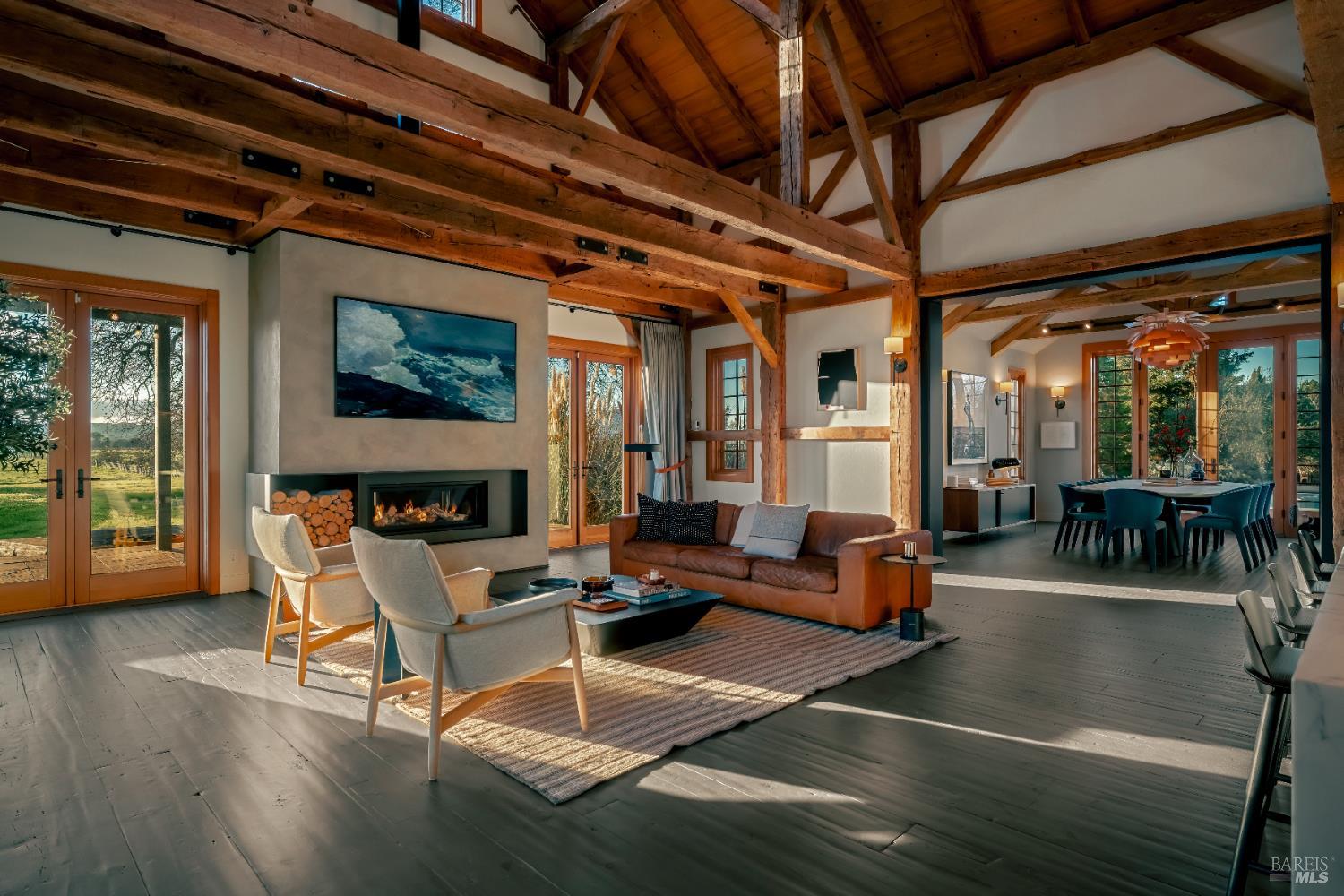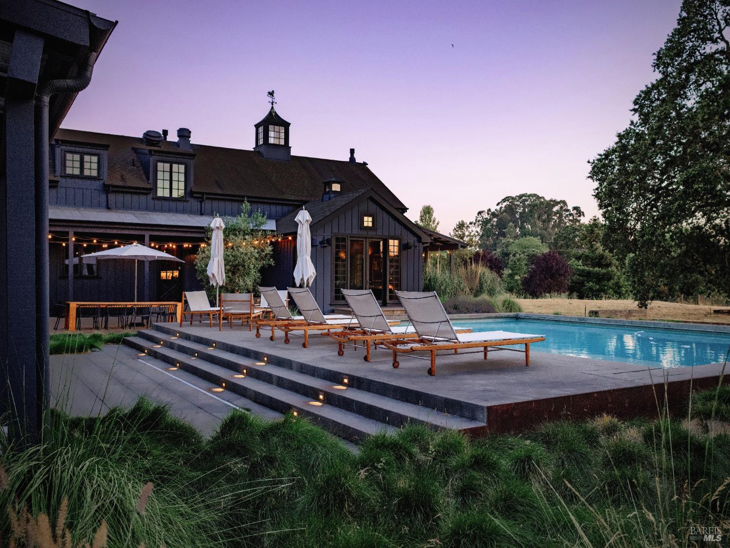 Dos Palmas is a thoughtfully restored historic barn reimagined for modern living in Sonoma. Set within an open meadow with clear sightlines to Mount Sonoma, the property offers privacy achieved through careful siting and landscape integration. The main living space retains its original rough-hewn, load-bearing barn frame, creating dramatic scale and architectural presence. Interior finishes pair marble with exposed structural wood, bespoke walnut millwork, deep-stained hardwood floors, and aged brass accents. A custom Corten steel fireplace anchors the great room, while a cylindrical silvered-steel stair tower serves as both circulation and architectural focal point. A cupola skylight crowns the integrated kitchen, dining, and living areas. Supporting spaces include a butler's prep kitchen, primary loft ensuite with sitting area and fireplace, main-level bedroom and bath (currently office/studio), and detached guest house with media lounge and private accommodations. Multiple French doors open to the fire pit, pool terrace, and custom pool positioned to capture evening light. The grounds feature a seasonal creek, olive and fruit trees, raised beds, bocce court, and sunset porch. Modern infrastructure includes high-bandwidth internet, property-wide Wi-Fi, integrated AV, Sonos, and solar. A rare alignment of architecture, land, and atmosphere - Dos Palmas offers a setting where pace softens and clarity returns.Interested in this Listing?