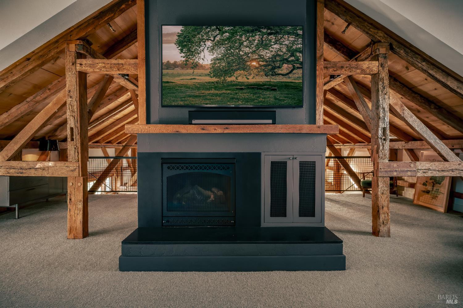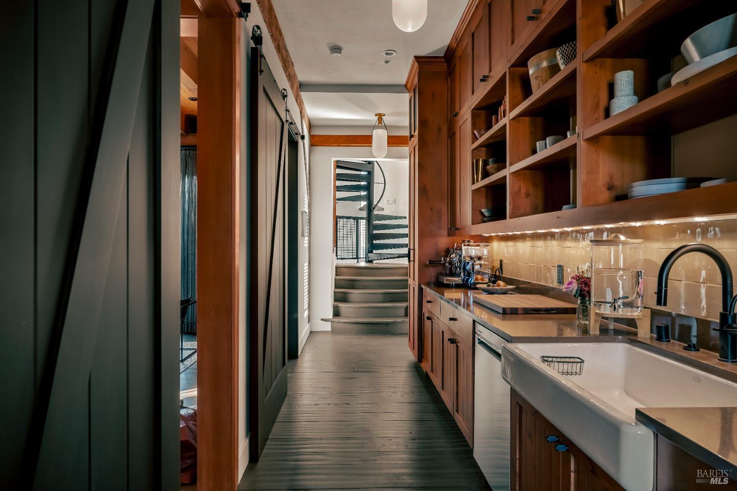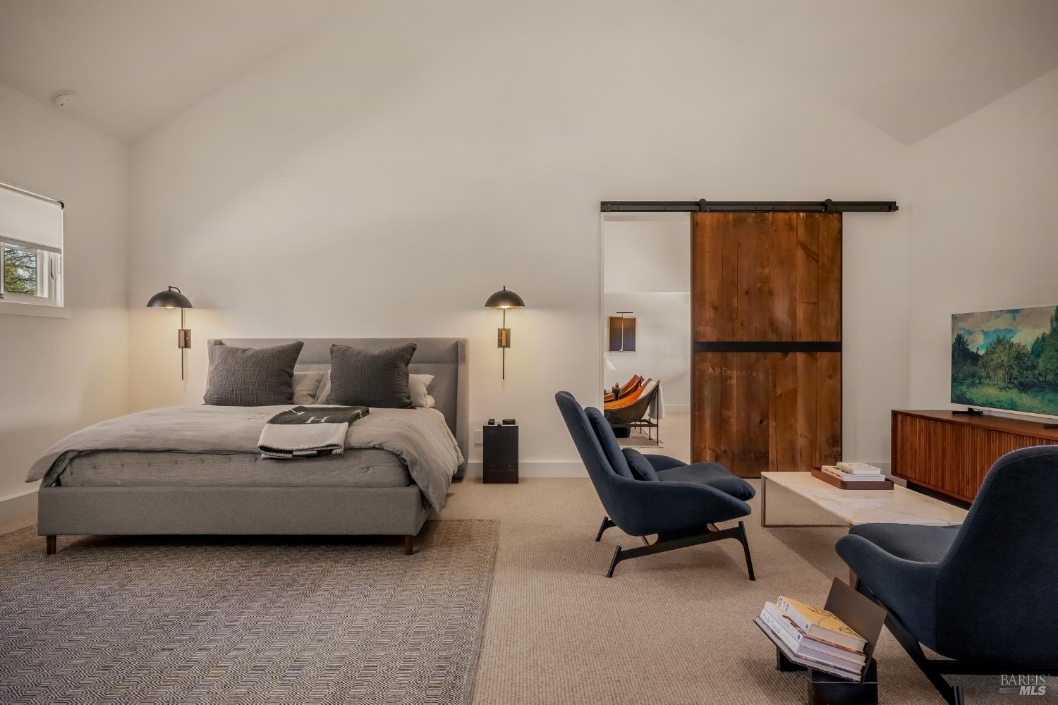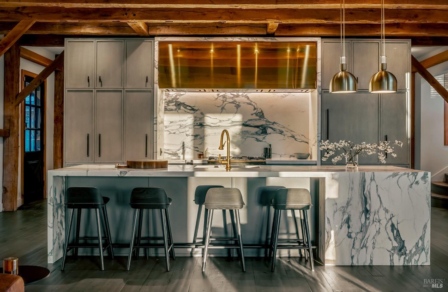Dos Palmas is a thoughtfully restored historic barn reimagined for modern living in Sonoma. Set within an open meadow with clear sightlines to Mount Sonoma, the property offers privacy achieved through careful siting and landscape integration. The main living space retains its original rough-hewn, load-bearing barn frame, creating dramatic scale and architectural presence. Interior finishes pair marble with exposed structural wood, bespoke walnut millwork, deep-stained hardwood floors, and aged brass accents. A custom Corten steel fireplace anchors the great room, while a cylindrical silvered-steel stair tower serves as both circulation and architectural focal point. A cupola skylight crowns the integrated kitchen, dining, and living areas. Supporting spaces include a butler's prep kitchen, primary loft ensuite with sitting area and fireplace, main-level bedroom and bath (currently office/studio), and detached guest house with media lounge and private accommodations. Multiple French doors open to the fire pit, pool terrace, and custom pool positioned to capture evening light. The grounds feature a seasonal creek, olive and fruit trees, raised beds, bocce court, and sunset porch. Modern infrastructure includes high-bandwidth internet, property-wide Wi-Fi, integrated AV, Sonos, and solar. A rare alignment of architecture, land, and atmosphere - Dos Palmas offers a setting where pace softens and clarity returns.Interested in this Listing?