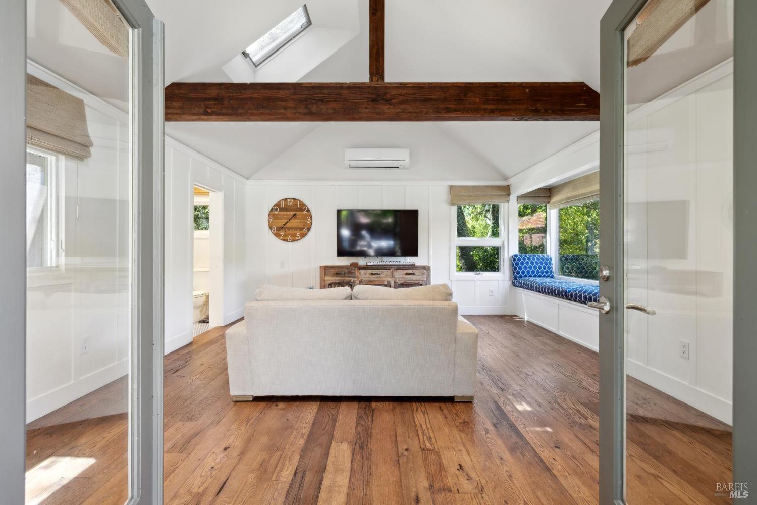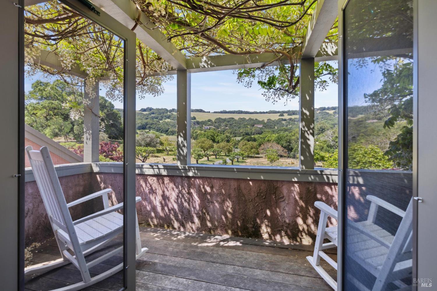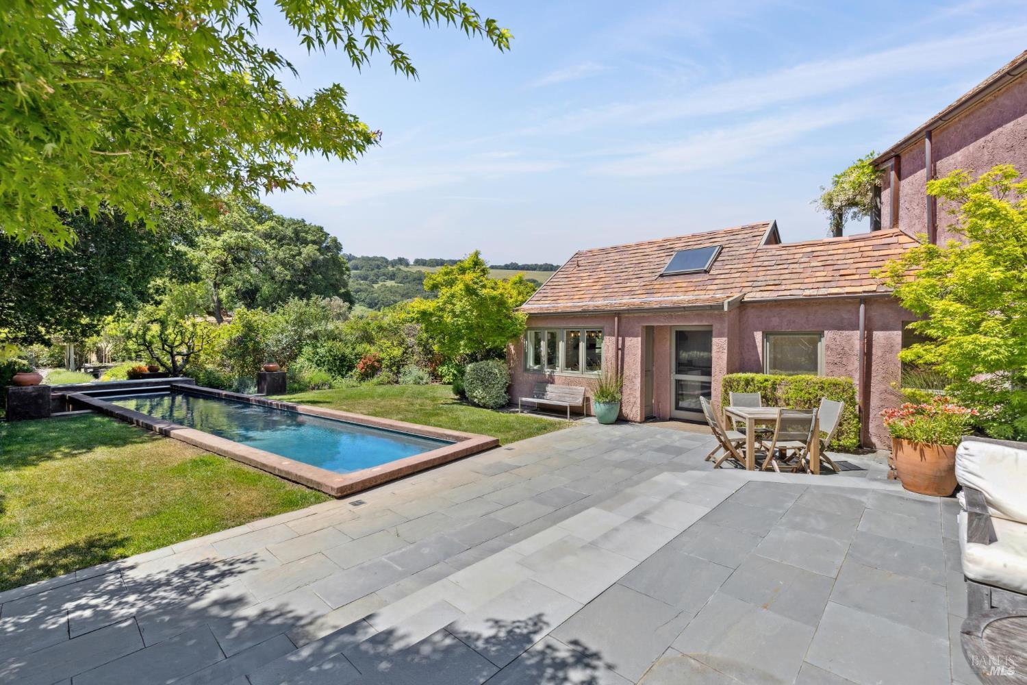 Set on 6.23+/- private acres, this exceptional estate offers expansive views, heritage oaks, and privacy just 12 minutes from the historic Sonoma Plaza. Rich in character and history, this thoughtfully reconfigured residence blends organic, reclaimed materials with modern amenities. Updated by Thornley Construction with exceptional attention to detail. Open-beamed ceilings, reclaimed hardwood floors, custom built-ins, and a Rumford fireplace define the main living spaces. Radiant heat, copper gutters with natural patina, and upcycled tile roofing reflect enduring quality and craftsmanship. The kitchen is designed for both daily living and entertaining, anchored by an oversized island with honed granite countertops, Wolf range, Sub-Zero refrigerator, and an eat-in nook overlooking the pool. A sizable pantry and canning basement provide ideal storage for wine or preserving harvests from the prolific orchard and raised vegetable beds. The primary bedroom has vaulted ceilings, glass doors to a private patio and flexible room perfect as an office or walk-in closet. The primary bathroom features a walk-in shower, two vanities and a door to the patio and hot tub. Every room captures stunning views of lush gardens, rolling hills, and vineyards beyond. The pool house offers flexible guest accommodations with two built-in Murphy beds, a full bath, and attached outdoor shower. Outdoor amenities create a true private retreat: solar-heated pool, hot tub, zipline, and a charming treehouse all bordering a seasonal creek. The land is a defining feature. A mature orchard with apple, pear, peach, and nut trees, along with raised vegetable beds, creates true farm-to-table living. Located within the prestigious George Ranch gated community, offering a pond, tennis courts, and private water. A rare offering combining privacy and nature minutes from the Plaza, yet a world apart.Interested in this Listing?