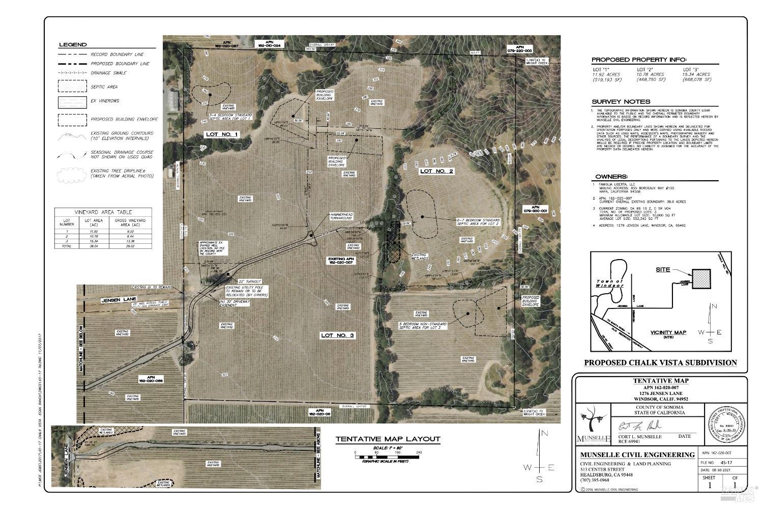 Introducing Windsor's newest, high end, 3 lot- private subdivision! Just out of City limits yet minutes to all amenities and Charles Schulz Airport, this 3 lot subdivision situated in the vineyards is just around the corner from the world famous Mayacama Golf Course, Shiloh Estates Subdivision and Shiloh Estate Recreational Park and hiking trails. LOT #3 consists of 15.34 gross acres, with 13.36 gross acres of ultra premium and high production young Pinot Noir vines. A 5 bedroom approved septic perc- domestic well- and approved building envelope. Ag water is supplied by a high production shared well. Included in the offering is a sparkling new custom steel automatic security gate with lighted stone pillars, incredible tasteful landscaping followed by new asphalt all the way to your private driveway. This property is NOT in an HOA! The lots are ready to build with all of the leg work completed! The seller is happy to lease back the vines to make this more enticing! Video link- https://youtu.be/zZO5xQuRGM0?si=mL1T_FuEPXiF-eCP