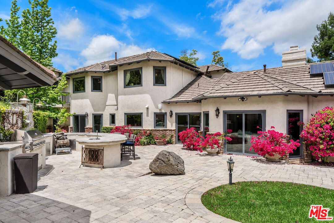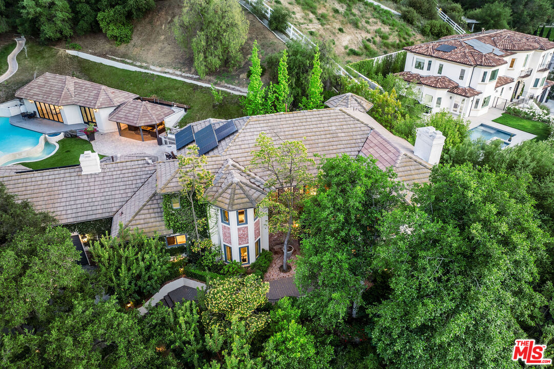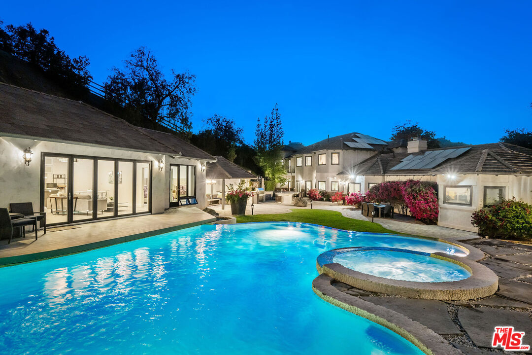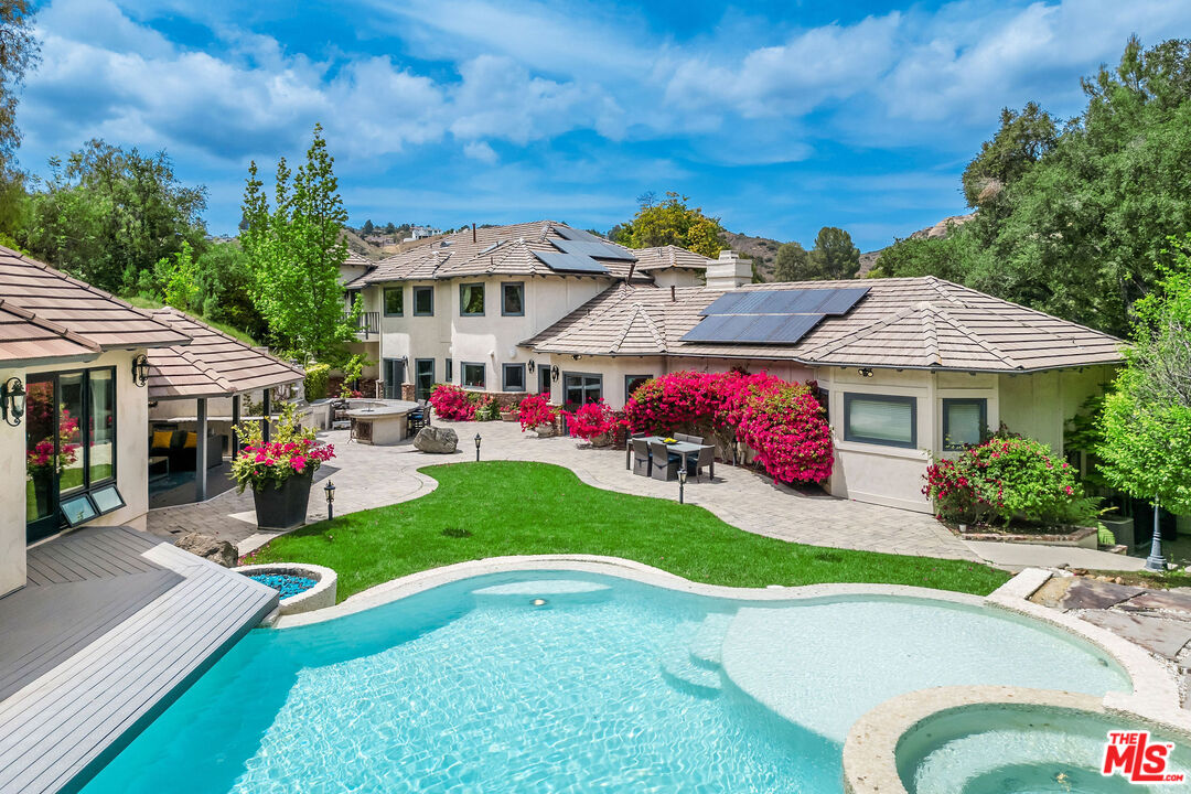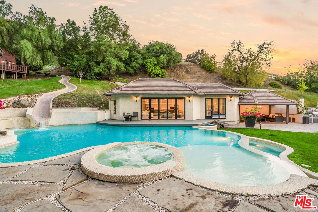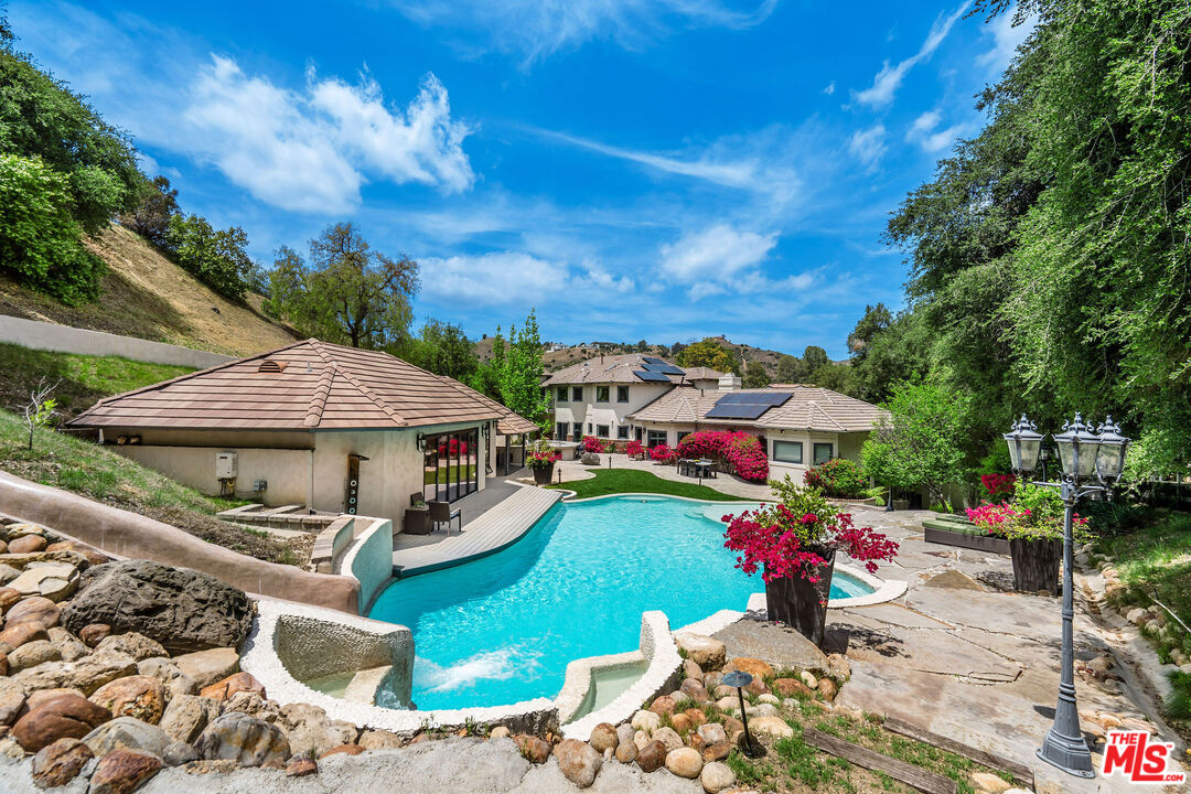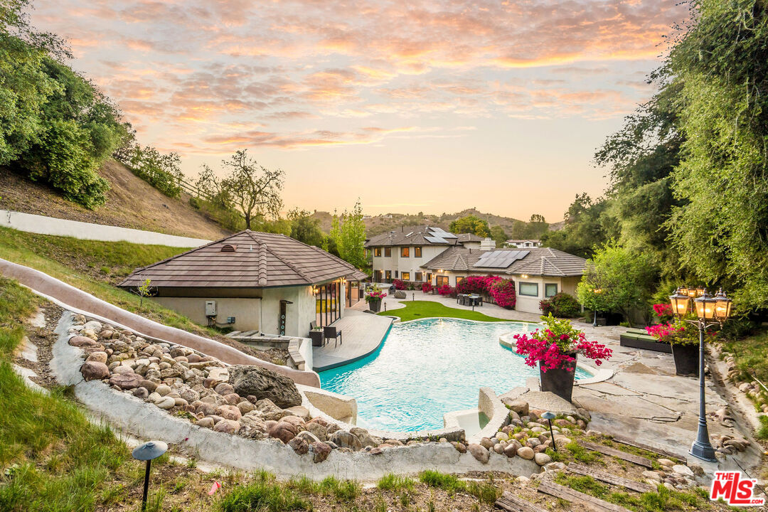 Step into storybook elegance at this one-of-a-kind estate where natural beauty, privacy, and thoughtful design create a magical living experience. Surrounded by rolling hills and filled with natural light, this home offers refined living spaces, luxurious details, and unforgettable outdoor amenities. Up a privately gated drive, a cobbled walkway leads to the grand brick faade and formal double-door entry, opening to limestone floors, soaring ceilings, and elegant architectural details throughout. The spacious living room features a fireplace and charming seating nook with lattice glass windows, while the formal dining room is flanked by floor-to-ceiling windows and connected to a butler's pantry for seamless entertaining. The chef's kitchen is a true centerpiece, with views of the beautiful backyard, a large honed black granite island, top-of-the-line appliances, built-in breakfast banquette and ample storage. It flows effortlessly into the family room with custom built-ins, fireplace, and sliding doors to the patio for alfresco dining. The main level also includes an elegant private office with decorative ceiling accents and built-ins, a guest room adjacent to a bathroom and laundry room, a powder room and a full game room with built-in bar, wine coolers, and entertainment center that opens to the yard. Upstairs, the luxurious primary retreat is a sanctuary all its ownfeaturing panoramic views, a fireplace, dual custom walk-in closets. and a light filled turret. The primary bath boasts a balcony, large soaking tub surrounded by views, a separate shower and dual vanities as well as a makeup counter. Two additional spacious en-suite bedrooms with large closets complete the second floor. Step outside to a private resort setting: an infinity-edge saltwater pool with waterfall and custom-built slide and spa, a full outdoor kitchen with BBQ and pizza oven, and a covered pavilion for year-round entertaining. A charming, custom-built treehouse adds whimsy, while an upper-level pad offers potential for future development. The detached guest house with bi-fold doors faces out over the stunning pool and includes a full kitchen with high-end appliances, living/work/dining area, bedroom, bath, laundry room, and private sitting areaideal for guests, extended family, or creative use. Additional highlights: oversized 3-car garage with storage room, solar panels, multiple-zone HVAC, exquisite lighting fixtures throughout, and Bell Canyon's renowned community amenitiesan equestrian center, clubhouse, gym, tennis/pickleball courts, and numerous annual events for all ages. The property is also situated within the award-winning Las Virgenes School District.Interested in this Listing?