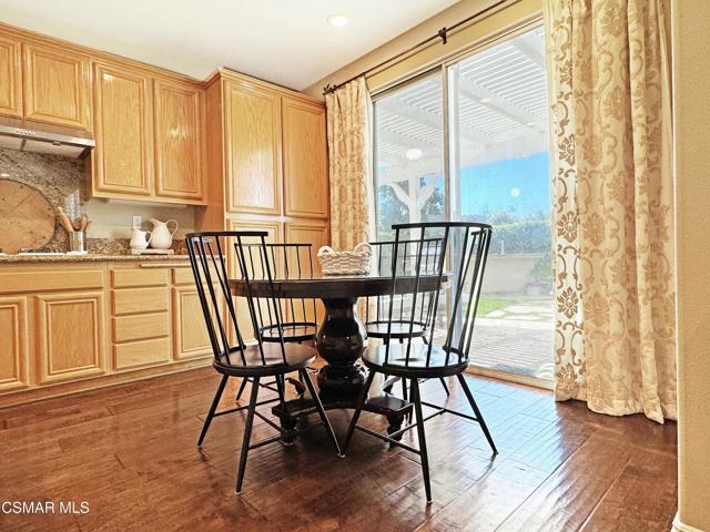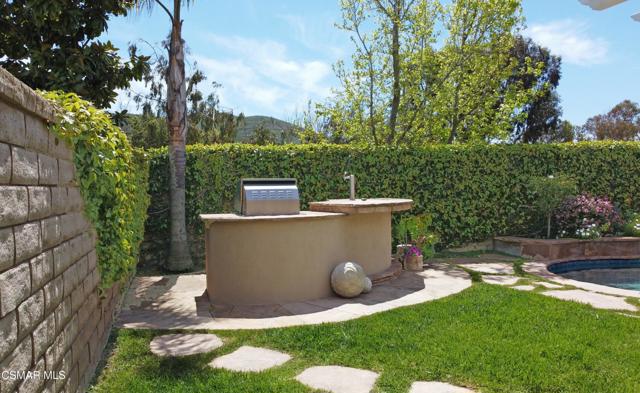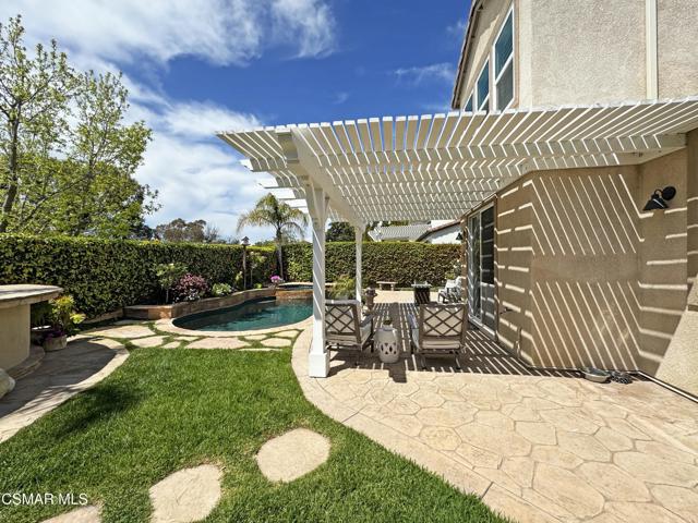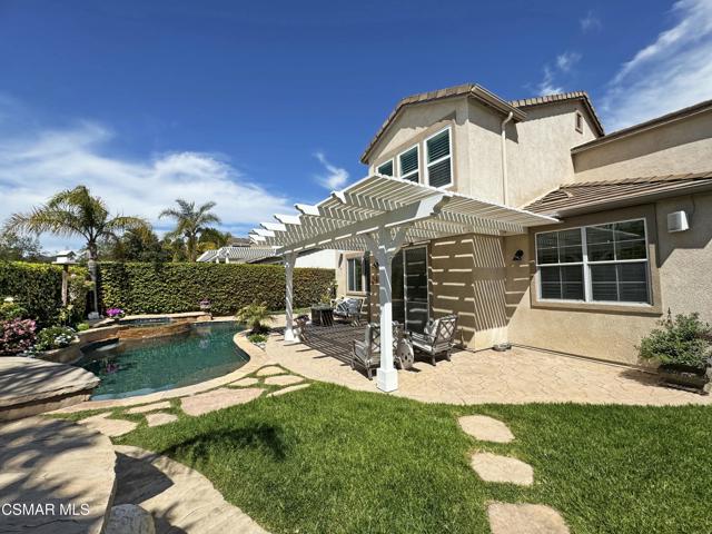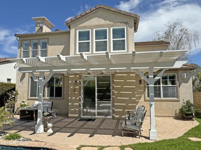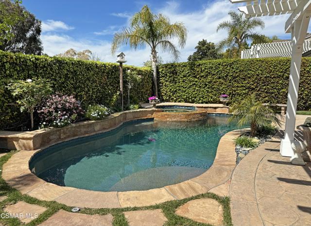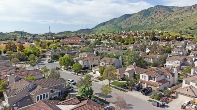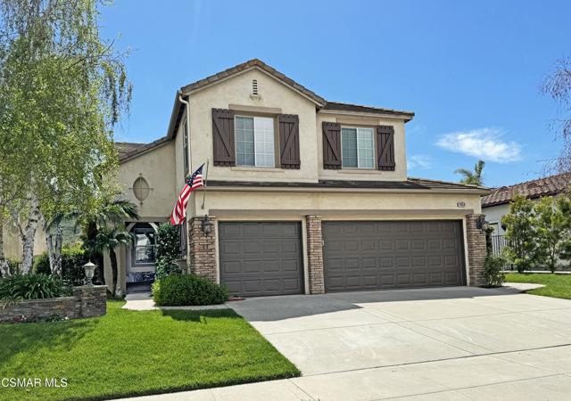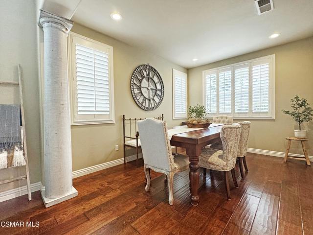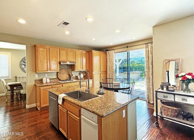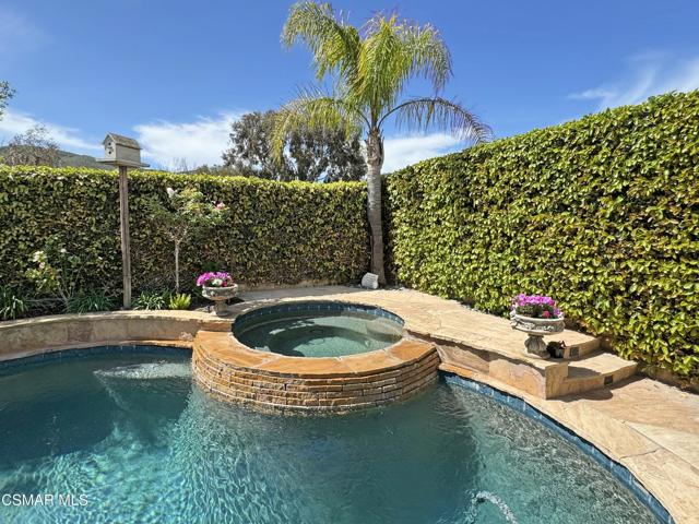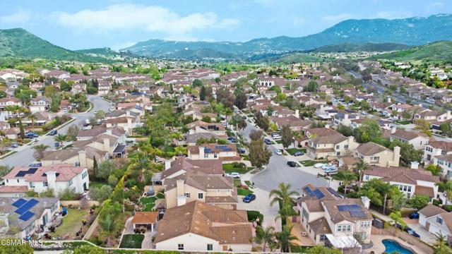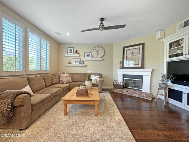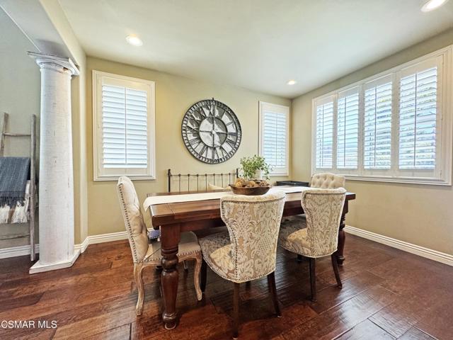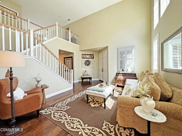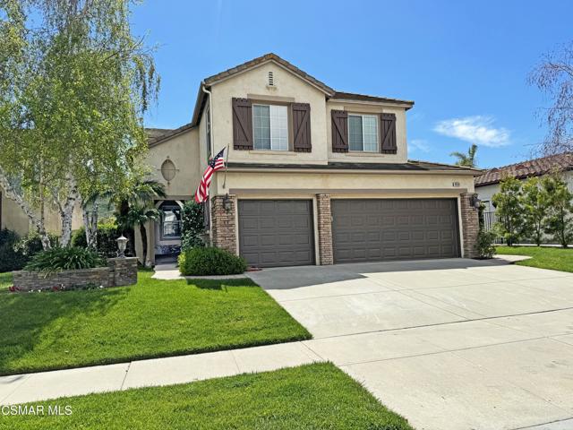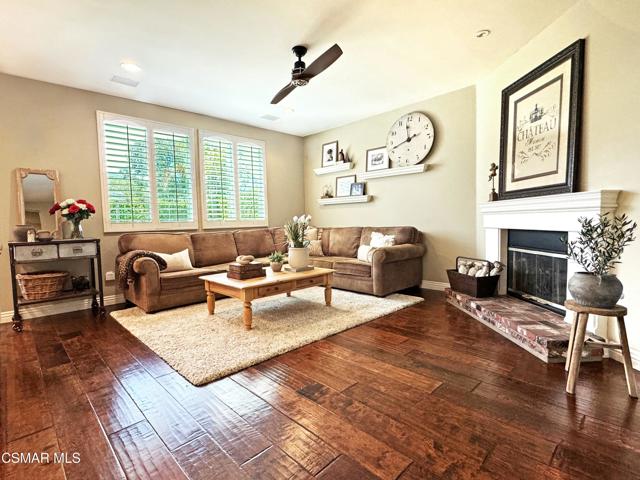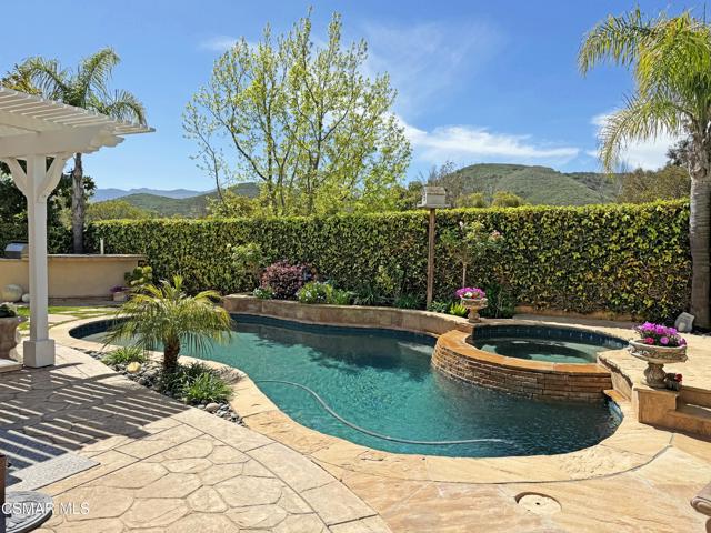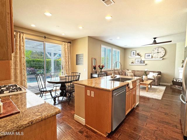 Beautifully upgraded Dos Vientos home with a stunning tropical entertainer's backyard, featuring a salt water pool and spa with waterfall, built-in BBQ, covered patio and grassy area! All perfect for summer fun! As you step into the entryway of this fabulous home, with its light bright open floor plan, you are immediately drawn into the spacious living room, complete with exquisite hardwood flooring, vaulted ceiling and plantation shutters. Walk through the elegant dining room with plantation shutters into the stunning updated kitchen and enjoy the granite counters, stainless steel farmhouse sink, large center island, and breakfast nook with sliding patio door leading to the breathtaking backyard. Take a moment to enjoy the family room with its welcoming fireplace, hardwood flooring, recessed lighting, and plantation shutters. Note the conveniently located downstairs bedroom with hardwood flooring and the stylishly remodeled bathroom, boasting a pedestal sink and updated fixtures and fittings. Be sure to see the laundry room with its own sink and plenty of storage room. Ascend the stairs and see the huge loft with recessed lighting! This is an ideal space for a den or office, or if you prefer, convert it into an additional bedroom. Now take time to linger in the large primary bedroom with its lovely pool and mountain view, seen through new dual pane windows! Take a moment to see the walk-in closet and newly remodeled master bathroom with double sinks, oversized shower and separate bathtub, white/grey marble countertop, and new white cabinet, fixtures and fittings. Meander through the upstairs secondary bedrooms and view the secret storage room inside one of the bedroom closets! The hall bathroom features double sinks, tub with shower, updated fixtures and fittings as well as wood-like tile flooring. Now it's time to step into the tropical backyard and see the sparkling pool and spa! Relax under the covered patio and imagine living at this amazing property! Conveniently located close to Dos Vientos Community Center and Park, sports fields, playgrounds, hiking trails and award-winning Sycamore Canyon School!Interested in this Listing?