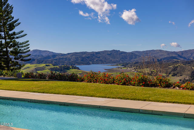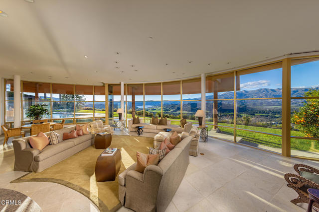 This contemporary architecturalmarvel is perched upon a hill with sweeping views of Lake Casitas and all of the mountainsthat ring the Ojai Valley. The 6br/6ba, 7600sqftvilla was built to the highest luxury standards and appointed with taste and elegance. It is offered as a complete package, including all furniture, a fully equipped kitchen, artworkand luxury linens. With modern lines and circular accents, the design maximizes the feeling of space and light with high ceilings and massive windows. The main living room has a semi-circular glass wall that offers an awesome 180 degree view, above which is a 2000 sqft verandawith a fireplace that opens to the sky and creates a commanding perch from which to observe the vast valley below. The living spacesare built to take advantage the incredible vantage point with strategically placed windows,each offering a unique perspective onthe sweeping vistas. The main entrance introduces the house with a unique circular wall opening that reveals an inside garden, a Tokonoma, and a two story central area that leads to the different parts of the house. The main living room blends curves and angles to create an elegant gathering space, with ample seating, a large fireplace, textured limestone floors, stone accents and automatic shades for the glass wall. The open kitchen/dining room complex includes a dining table with lake views, a fireplace, a breakfast area for morning sun and two built in desks. It is appointed with ultra - high end appliances, modern lighting and custom hardwood cabinetry. The spacious primary suite includes a fireplace sitting area, Topa Topa views, and a spa - like granite bathroom with a private porch overlooking the lake. There is a well - appointed gym, a circular 3rd floor sitting room with perfect views of the Topa Topas, and a media room with an extra- large projection screen. The house is filled with high end AV equipment for audiophile sound, automatic shades and artistic lighting. The grounds include impeccable landscaping. The pool, spa and outdoor dining area are completely private and offer sun, shade, sky and unrivaled views. An organic family orchard produces a variety of fruits. The unparalleled design, quality and sheer beauty of this house integrate the natural splendor of its surroundings. This property represents high concept design, exquisite craftsmanship, & the finest natural materials in a complete turnkey package ready to occupy immediately.Interested in this Listing?