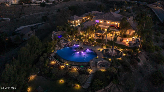 A hidden sanctuary on a hilltop in Southwest Simi Valley, this thoughtfully designed custom-built Mediterranean style home on 3.8 acres offers 360 degree breath taking views. Big backyard with duel level Koi pound has waterfall with living turtles, entertaining areas which include Infinity Pebble Tec pool with Baja shelfs and multicolor changing lights, rock waterfall with underneath grotto, fountain, slide, private spa, stone-surround fire pit, the outdoor kitchen, RV access, hillside avocado and various fruit orchard, kids playground, sports ground, vegetable garden, own solar system on the slope with capacity 29967 KW per year. Seller has architectural plans for well drilling with connection to the whole water system on the property. This amazing estate of a total 7,429.5 SqFeet living space includes 5,326 sq ft main house with 4 bds and 3,5 ba and 2 view balconies; 1,202.5 sq ft guest house with 2 bedroom, 2 bathrooms, living room, granite fireplace, and a balcony; 484.5 sq ft wellness center house with cedar sauna, steam room, infrared sauna, large resting room with massage tables; 112 sq ft playhouse with with retractable staircase to the capacious attic and its own half bath; 304.5 sq ft subterranean wine cellar. Marvelous choices of marble, stone and wood harmonize every room with dignified decorum. The chef will love the enticing kitchen with stainless steel Thermador professional appliances, granite counters, hand carved spacious cabinets and dramatic views from every window. Many more amenities! Everyone will find their favorite place in this beautiful property!Interested in this Listing?