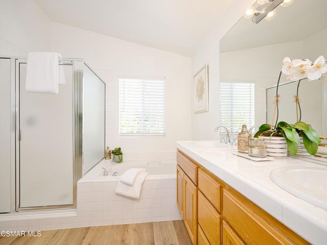 Welcome to this charming 3-bedroom, 2.5-bathroom residence, nestled in the highly sought-after Verdigris neighborhood of Thousand Oaks. Located within a gated community known for its beautifully maintained homes, this bright and inviting home offers the perfect blend of style, comfort, and convenience.As you enter, you're greeted by an abundance of natural light pouring through the walls of glass and highlighting the volume ceilings. The open-concept floor plan is both spacious and functional, featuring a cozy family room with a fireplace, seamlessly connected to a dining area and well-appointed kitchen--ideal for entertaining and everyday living. Crisp, fresh paint and quality wood-like floors add to the home's elegance.The spacious primary suite is a true retreat, complete with a large walk-in closet and a spa-like bathroom that boasts dual vanities, a soaking tub, and a separate shower. Two spacious auxiliary bedrooms utilize a well-appointed hall bathroom. A convenient upstairs laundry room makes household chores a breeze.Step outside to your private rear yard, where you'll enjoy the serenity of a covered patio, surrounded by lawn and lush landscaping--perfect for relaxation and outdoor gatherings. The home also features a two-car attached garage for added convenience.Residents of Verdigris enjoy access to community amenities, including a pool, playground, and tennis courts. Plus, with award-winning schools nearby, this home offers the best in comfort, leisure, and location. Don't miss the opportunity to make this stunning property your own!Interested in this Listing?