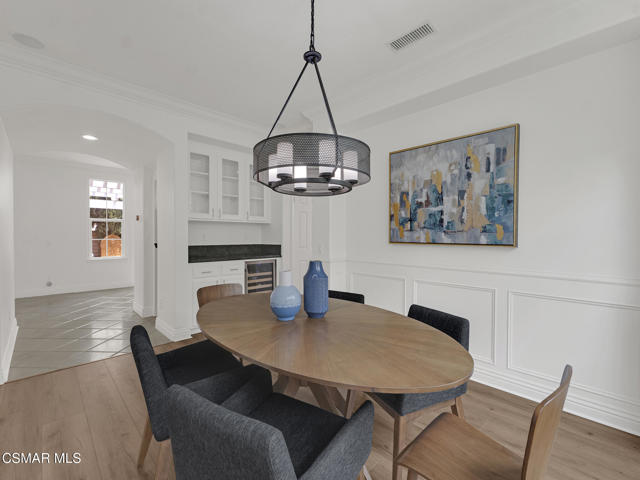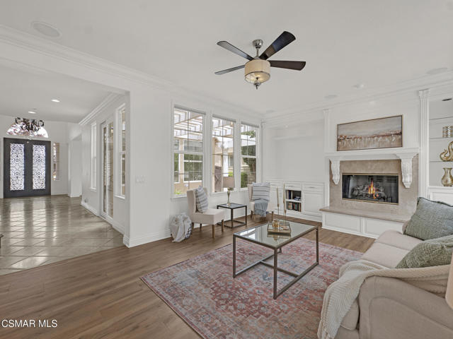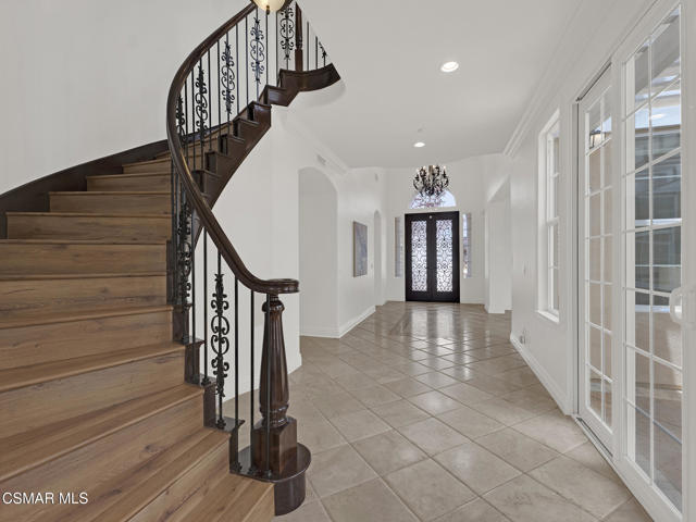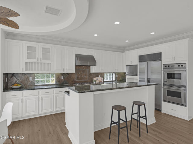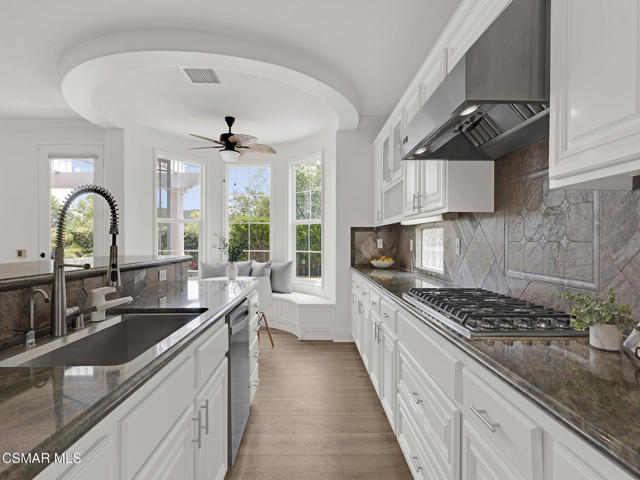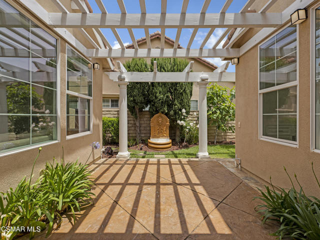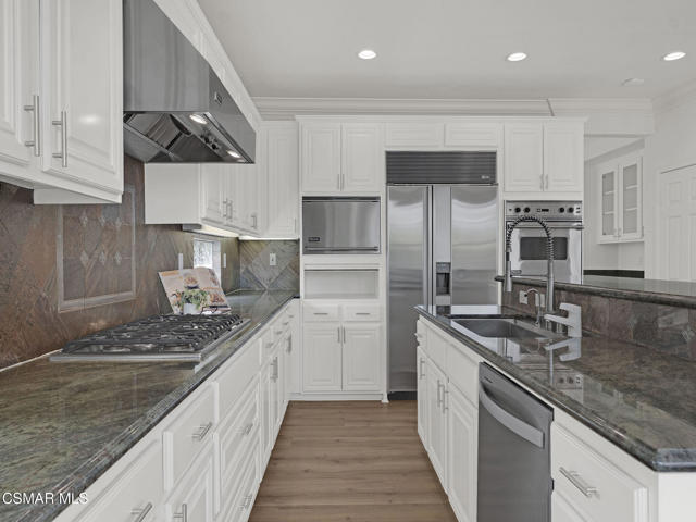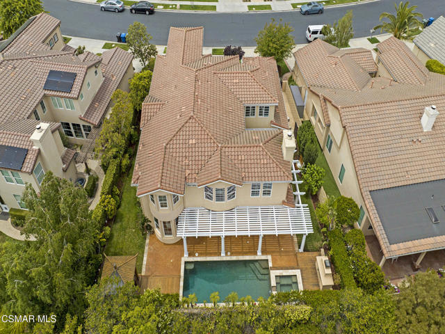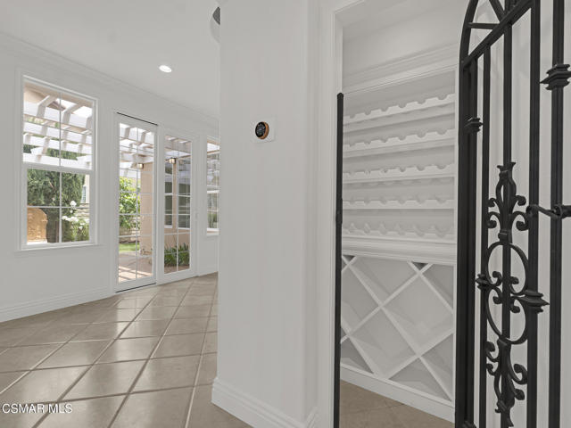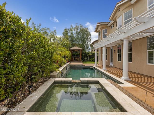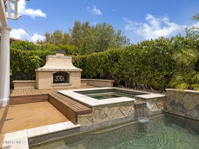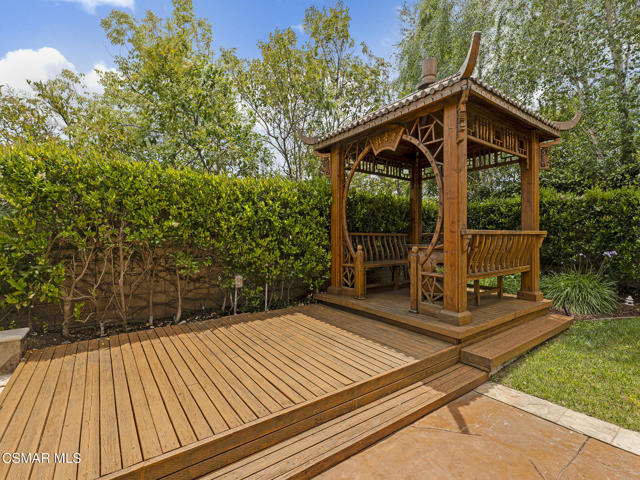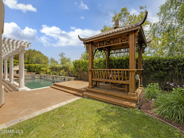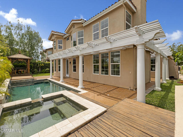 Elegant Mediterranean Estate with Pool, Wine Cellar & Hill Views in GUARD-GATED Woodridge Estates! Welcome to 3188 Eaglewood Avenue--a GRAND 5-bedroom, 4.5-bathroom, 4,100 sq ft estate nestled on a beautifully manicured 7,963 sq ft lot in the prestigious GUARD-GATED enclave of Woodridge Estates in Thousand Oaks! Built in 2003 and designed with sophistication, privacy, and entertaining in mind, this Mediterranean-style retreat blends luxurious finishes, flexible spaces, and serene outdoor living--backed by hillside views and minutes from top-tier amenities and open space trails. From the moment you arrive, the home makes a STUNNING first impression. Stacked-stone surfaced pillars, stamped concrete walkways, and lush green lawns frame the elegant facade. Step inside through the custom double entry doors--appointed with wrought iron detail & rain glass accents--into a DRAMATIC two-story foyer with mosaic tile inlay and a soaring chandelier that sets the tone for this stately residence. Just off the entry, the formal Living Room provides an elegant space to welcome guests, featuring a gas fireplace and views of the home's tranquil courtyard. This serene outdoor lounge includes a beautiful patio cover & stamped concrete floor, ready for outdoor dining/entertaining. The Family Room offers a cozy-yet-open media space with rustic stone fireplace, floating mantle, built-in media cabinetry, and backyard views. Open to the GOURMET Chef's Kitchen, it forms the heart of the home--perfect for hosting and gathering. The Kitchen dazzles with a large granite-topped center island with breakfast bar seating, extensive custom cabinetry, built-in Sub-Zero refrigerator, Viking Professional 6-burner gas range + double convection ovens, and a step-in pantry. A nearby Butler's Pantry with beverage fridge and granite-topped cabinetry leads into the formal Dining Room--finished with wood-like flooring, wainscoting, and lush backyard views. A charming Wine Cellar with arched wrought iron door and built-in racks rounds out the main entertaining level. The versatile floorplan offers a true downstairs guest suite featuring a bedroom with Murphy bed, built-ins, plus an en-suite 3/4 bathroom with granite vanity and tiled shower. Upstairs, a large open Loft/Bonus Room functions beautifully as a gym, media room, playroom, or study--complete with built-in desk. The spacious upstairs Primary Suite enjoys its own private wing, with sitting area, tray ceilings, views of local hills via tall windows, a long closet, and a LUXURIOUS en-suite bathroom showcasing dual stone-topped vanities, a central makeup station, jetted soaking tub, tile shower, and TWO custom walk-in closets. Three additional upstairs bedrooms offer flexible configurations--two with walk-in closets and one with French doors to a private balcony with hills views. Two additional full bathrooms (including one en-suite) complete the upper level. The backyard is a PRIVATE retreat designed for both relaxation and recreation. Enjoy a sparkling PEBBLE-surfaced pool and spa, stamped concrete patios, built-in wood-burning fireplace, and a romantic wood deck with ORIENTAL GAZEBO. Lush plantings include mature trees, flowering vines, a fig tree, rose bushes, and vibrant grass lawns--all backdropped by serene hills. Other highlights include a dual-zone HVAC system, MILGARD dual-pane windows, AquaLink pool equipment, tall crown/base moldings throughout, and finished garages (2-car + single-car) which are directly accessible. Situated near acclaimed Conejo Valley schools, this home also enjoys close access to fantastic hiking trails in Wildwood Park & Lang Ranch, shopping centers, fine dining, and the 101/23 freeways for easy commuting. This is luxury Thousand Oaks living at its finest--gated, private, and packed with amenities!